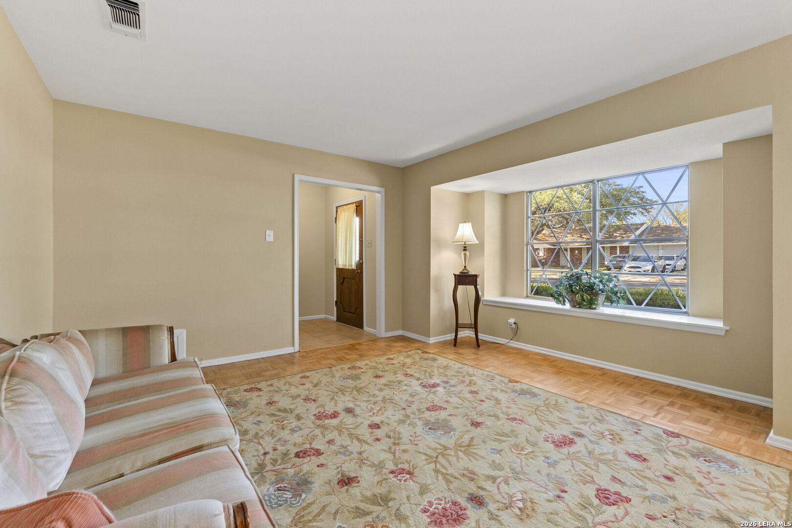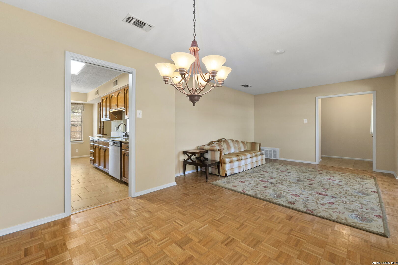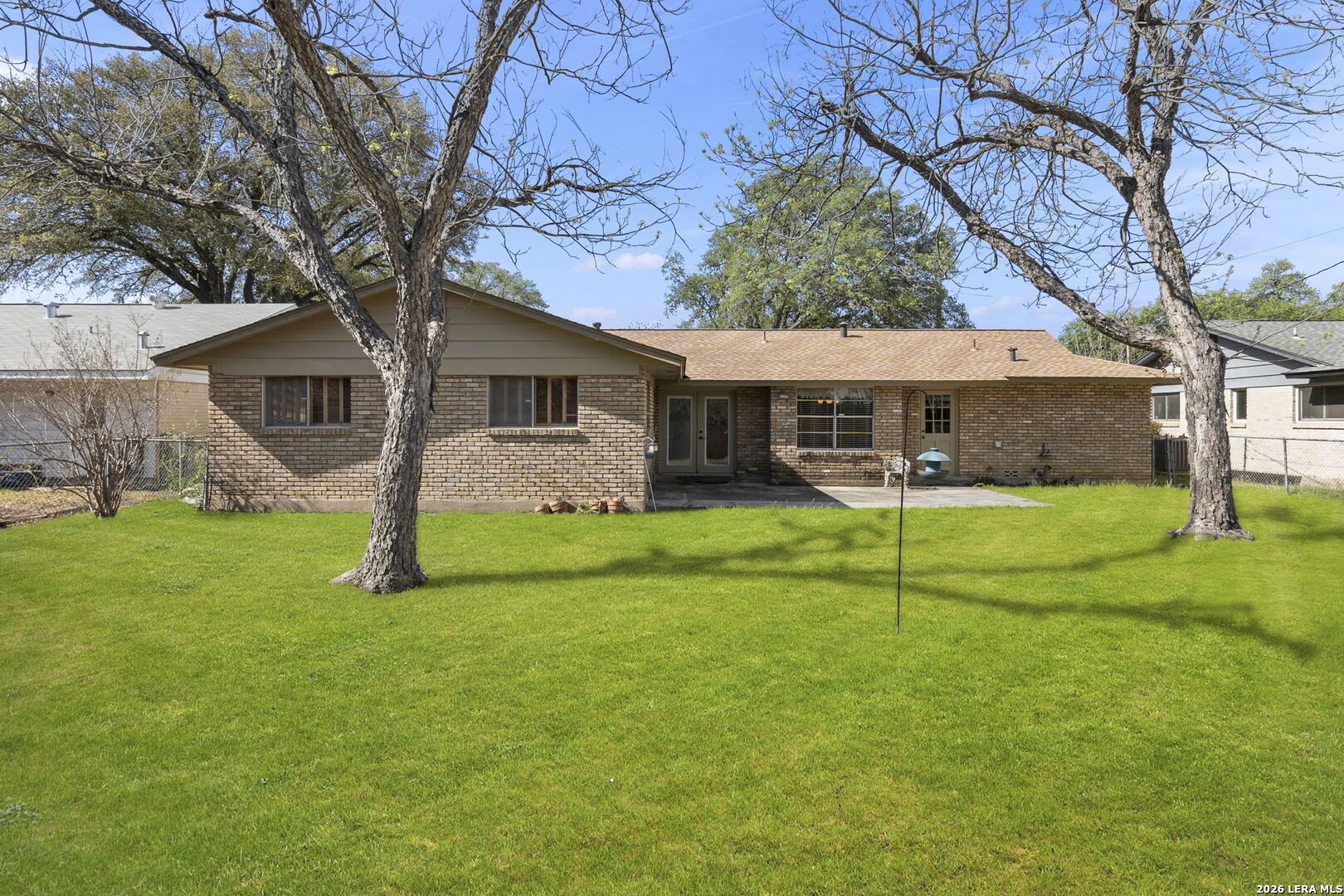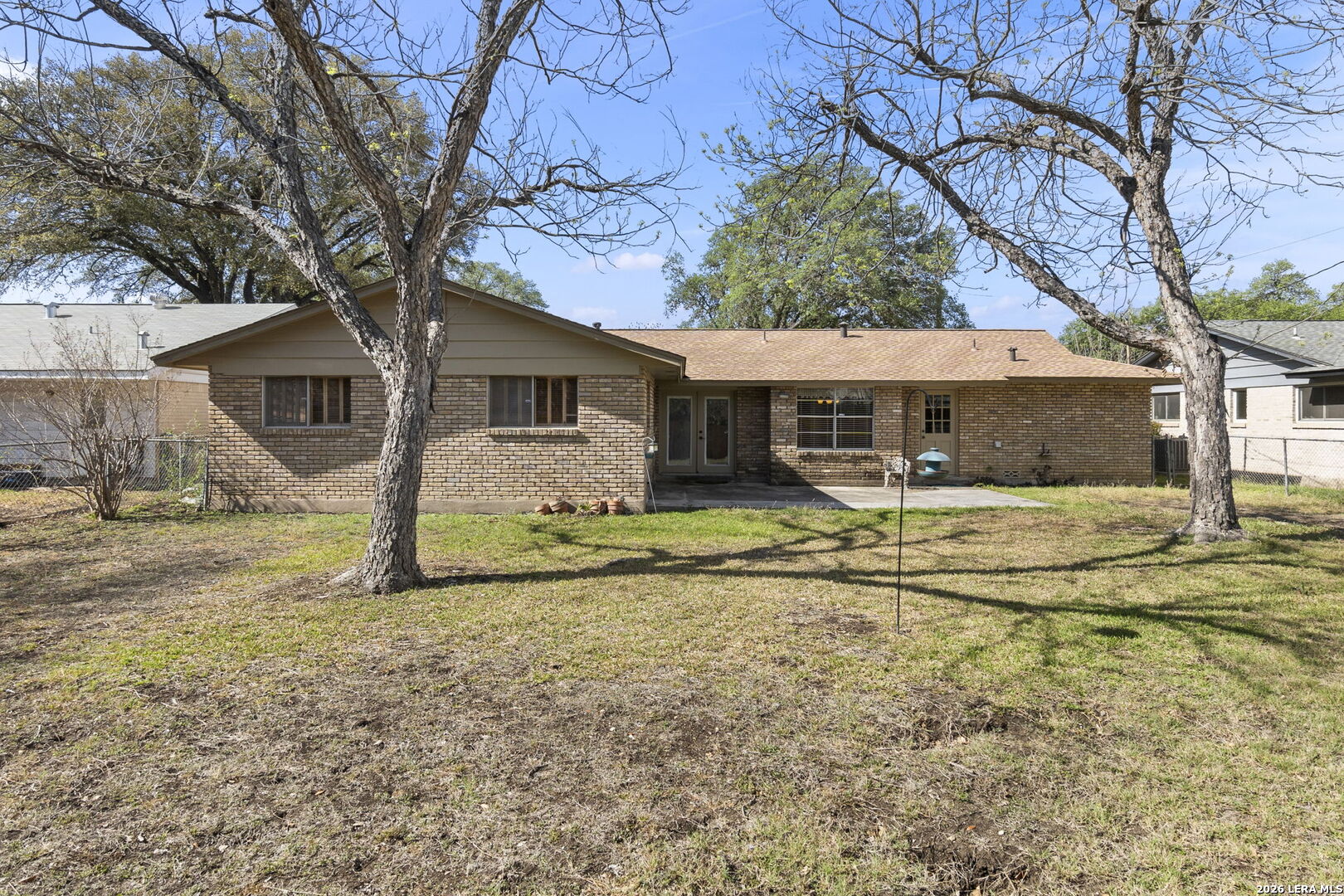 This beautifully maintained property offers the perfect blend of comfort, convenience, and classic character. Nestled in the established MacArthur Terrace neighborhood, this home features 4 bedrooms and 2 baths. Step inside the front door to a formal living and dining room filled with natural light, highlighted by a large windows with window seat/shelf. Through the dining room to the kitchen, you will find ample cabinetry, Silestone counter tops with undermount stainless steel sink and a goose neck rubbed oil bronze Moen faucet. Stainless steel appliances, include a built in-oven, vent hood and dishwasher. A smooth, glass top electric cook top is also featured. The kitchen also fetures a cozy breakfast area, which is flooded with natural light and overlooks the backyard. Adjoining the breakfast area, you will find a spacious family room with a vaulted, beamed ceiling, complete with ceiling fan for comfort. A double French patio door invites you outdoors to the spacious backyard shaded by mature trees, complete with an over size patio ideal for weekend barbecues or relaxing evenings. The master bedroom suite provides a private retreat with a shower that features a fold down seat and grab bars. The three other bedrooms feature classic wooden shutters for window coverings and share a bathroom with extended vanity and cabinet space with a combination tub/shower set up. Updated ceramic tile floors are located in entry hall, kitchen and utility room, while the the formal living and dining areas feature original parquet wood floors that also extend through all four bedrooms - a rare and timeless touch that adds warmth and character. This beautiful home is perfectly located within minutes to San Antonio International Airport, Military bases and major highways (Loop 410, Hwy 281 and IH 35).