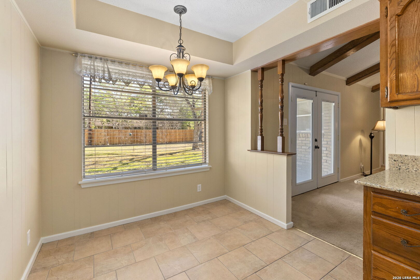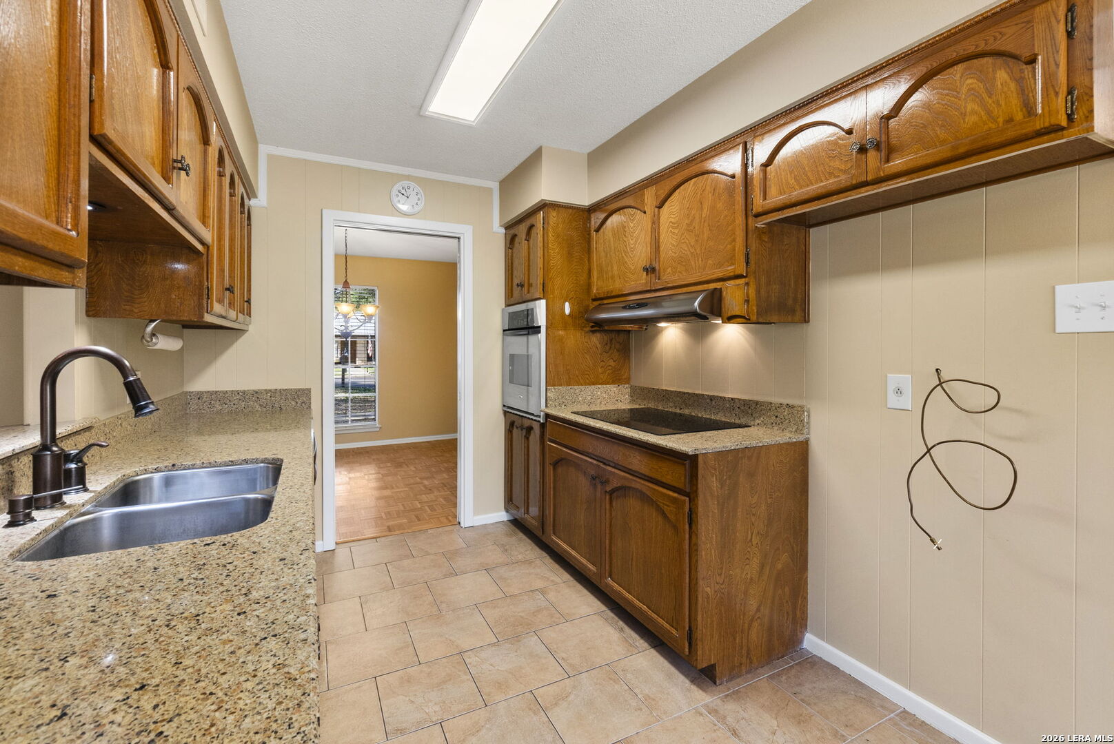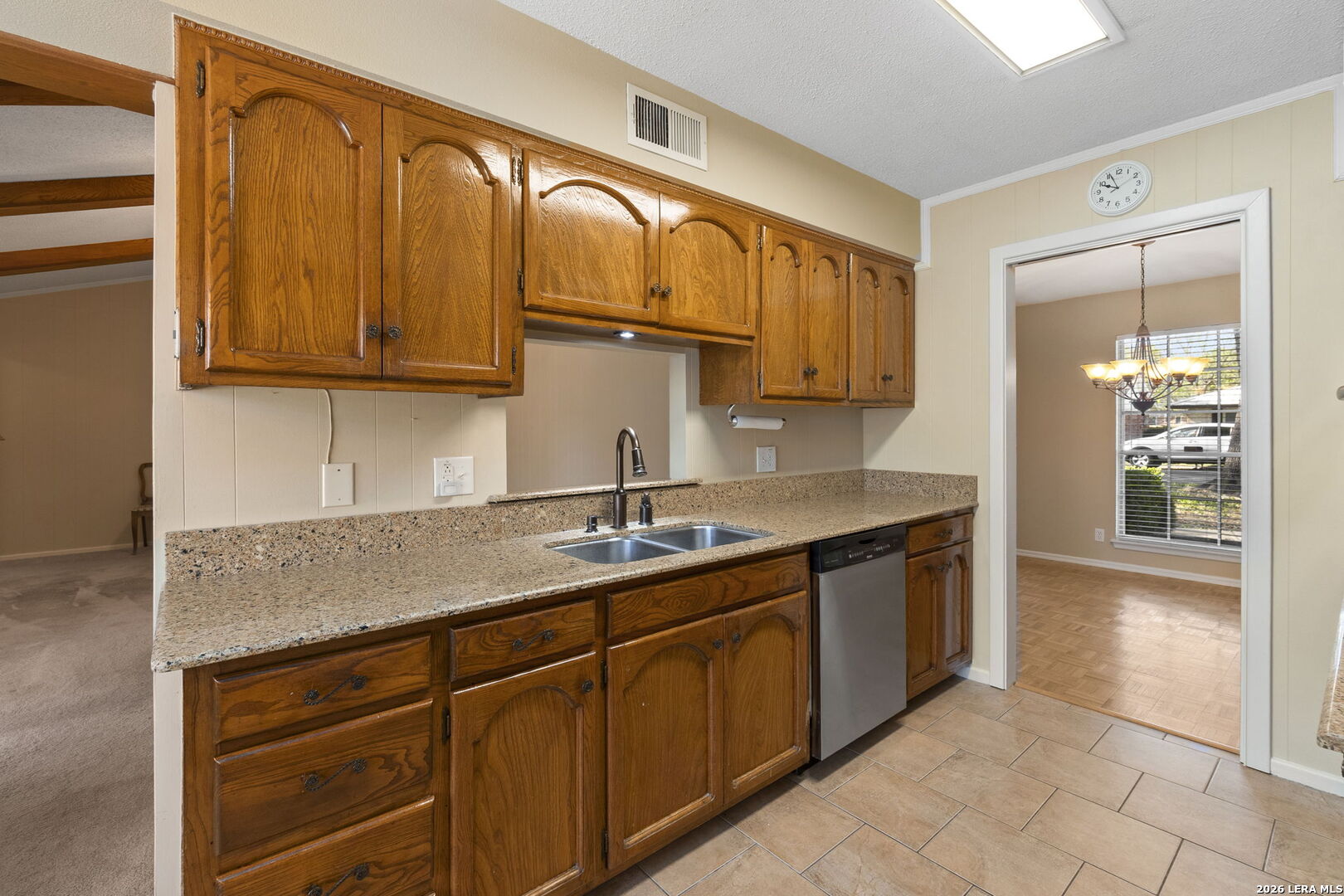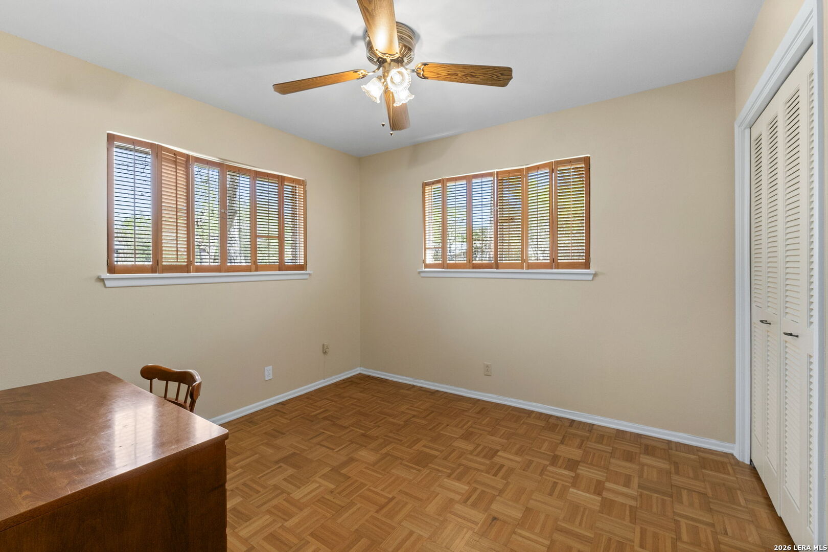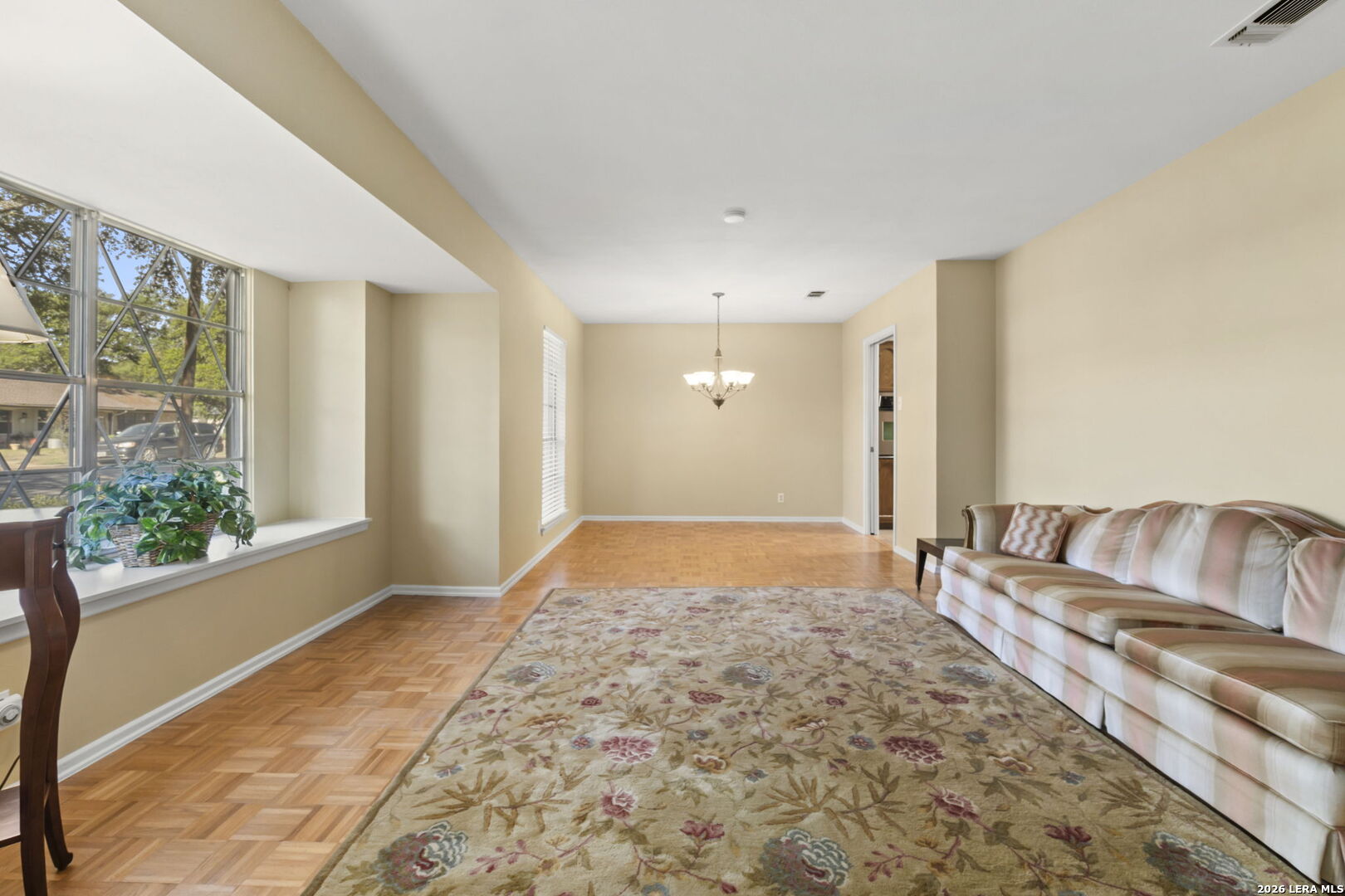 This beautifully maintained property offers the perfect blend of comfort, convenience, and classic character. Nestled in the established MacArthur Terrace neighborhood, this home features 4 bedrooms and 2 baths. Step inside the front door to a formal living and dining room filled with natural light, highlighted by a large windows with window seat/shelf. Through the dining room to the kitchen, you will find ample cabinetry, Silestone counter tops with undermount stainless steel sink and a goose neck rubbed oil bronze Moen faucet. Stainless steel appliances, include a built in-oven, vent hood and dishwasher. A smooth, glass top electric cook top is also featured. The kitchen also fetures a cozy breakfast area, which is flooded with natural light and overlooks the backyard. Adjoining the breakfast area, you will find a spacious family room with a vaulted, beamed ceiling, complete with ceiling fan for comfort. A double French patio door invites you outdoors to the spacious backyard shaded by mature trees, complete with an over size patio ideal for weekend barbecues or relaxing evenings. The master bedroom suite provides a private retreat with a shower that features a fold down seat and grab bars. The three other bedrooms feature classic wooden shutters for window coverings and share a bathroom with extended vanity and cabinet space with a combination tub/shower set up. Updated ceramic tile floors are located in entry hall, kitchen and utility room, while the the formal living and dining areas feature original parquet wood floors that also extend through all four bedrooms - a rare and timeless touch that adds warmth and character. This beautiful home is perfectly located within minutes to San Antonio International Airport, Military bases and major highways (Loop 410, Hwy 281 and IH 35).