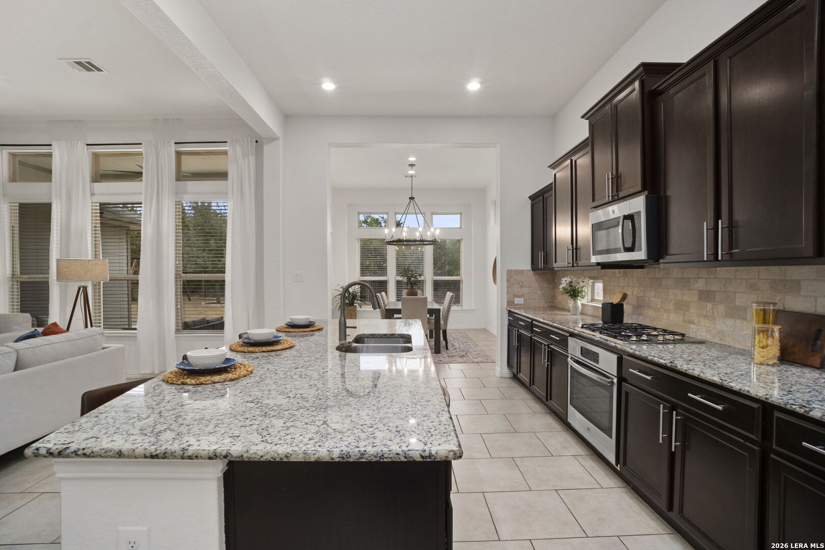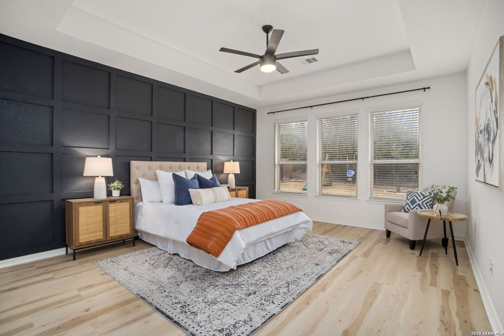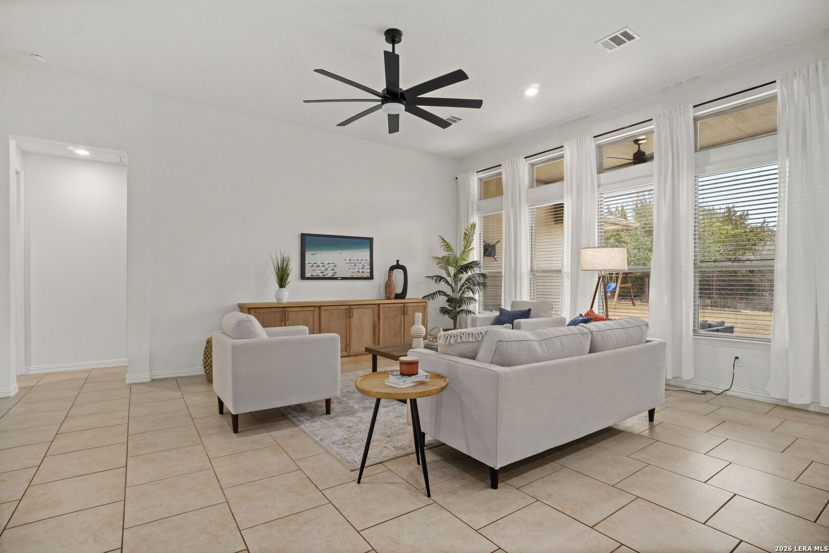 Located in the gated Johnson Ranch community in Bulverde, Texas, this beautifully upgraded single-story home at 32134 Mirasol Bend offers 3 large bedrooms, 2 baths, and a spacious open floorplan with designer touches throughout. From the custom-updated laundry room and striking accent walls to the modern lighting and thoughtful finishes, every detail has been carefully curated. The primary suite features custom wood flooring, a designer accent wall, a large bathroom, and an oversized walk-in closet. The garage includes custom overhead storage for added convenience. Enjoy outdoor living on the extended patio overlooking a flat greenbelt lot, providing both privacy and scenic views. The neighborhood offers a community pool and walking trails and feeds into highly regarded Comal ISD schools (Smithson Valley HS), making this home an ideal blend of comfort, style, and functionality.