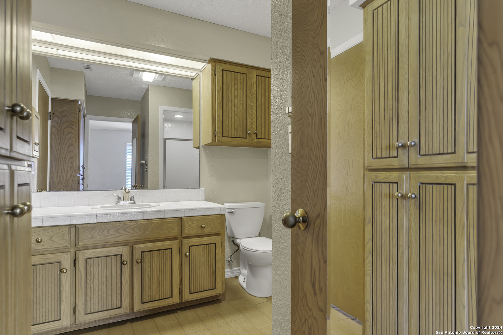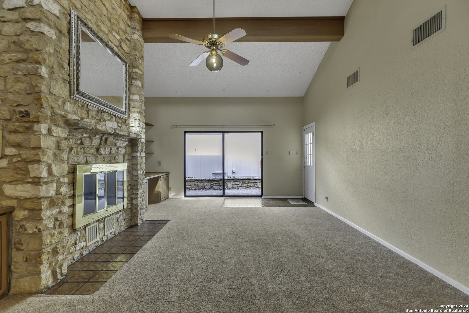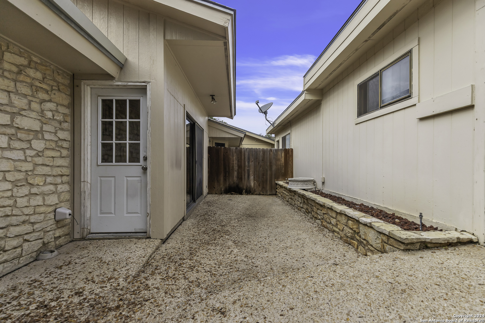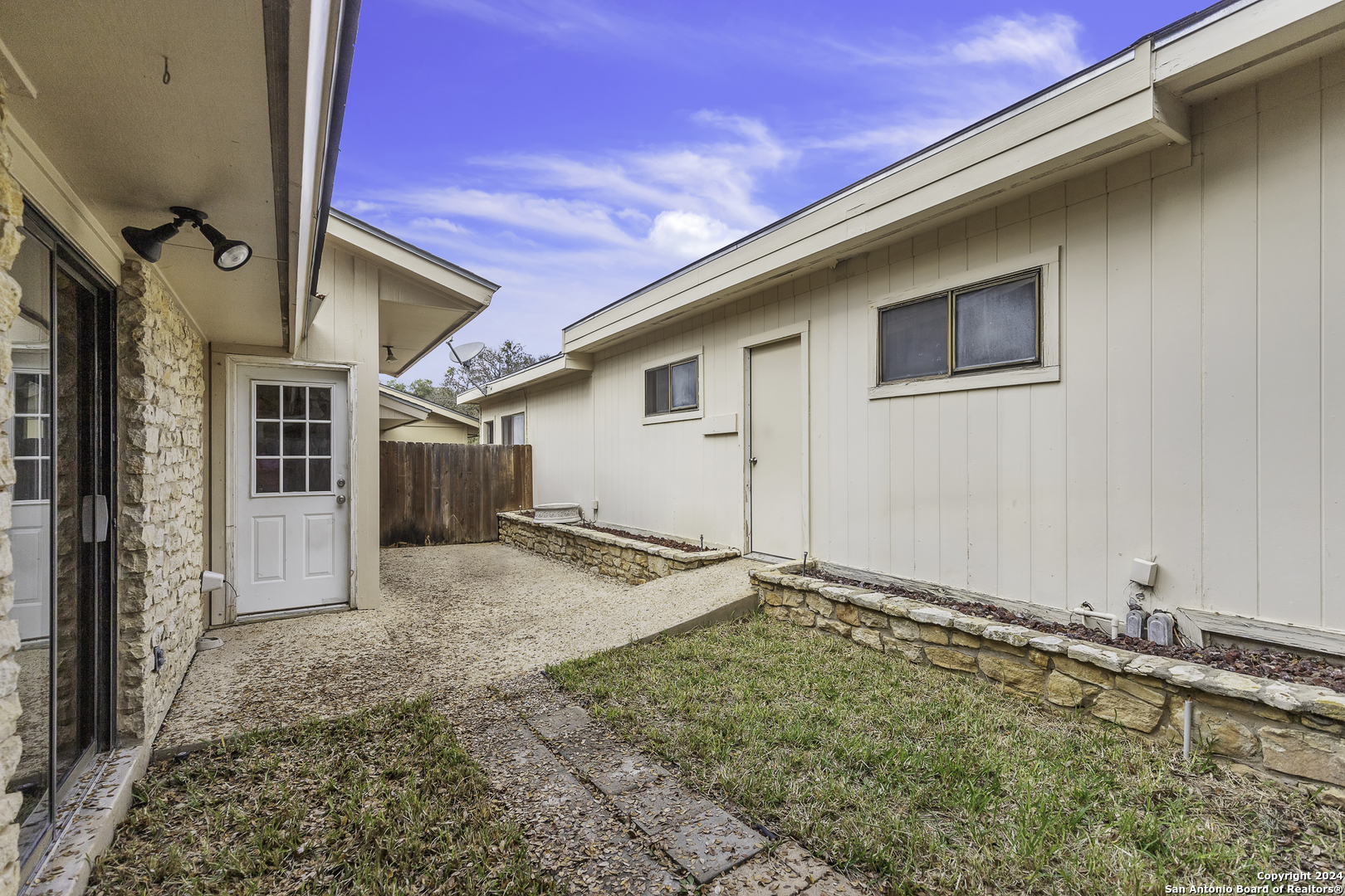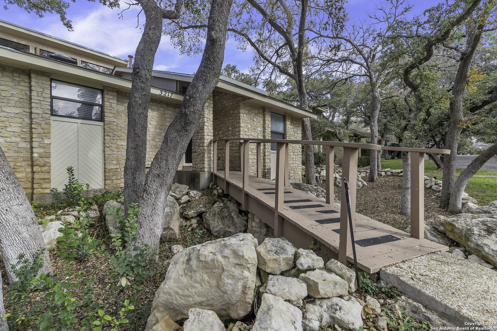 This beautiful condominium is nestled in a quiet forest of ancient oak trees, just minutes from the Medical Center without congested traffic and so close to shopping. Easy access to IH10 and Loop 410.The open concept kitchen/living area boasts a huge stone-faced fireplace and soaring ceilings filled with natural light and built in storage and shelves. Both bedrooms and bathrooms are spacious, have large closets and storage/cabinets, a floored attic for extra storage. Two car garage with work bench/shelving. Private rear driveway that connects to the house through the patio. Neighborhood pool and clubhouse across the street.