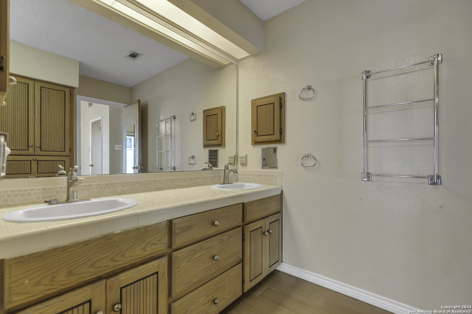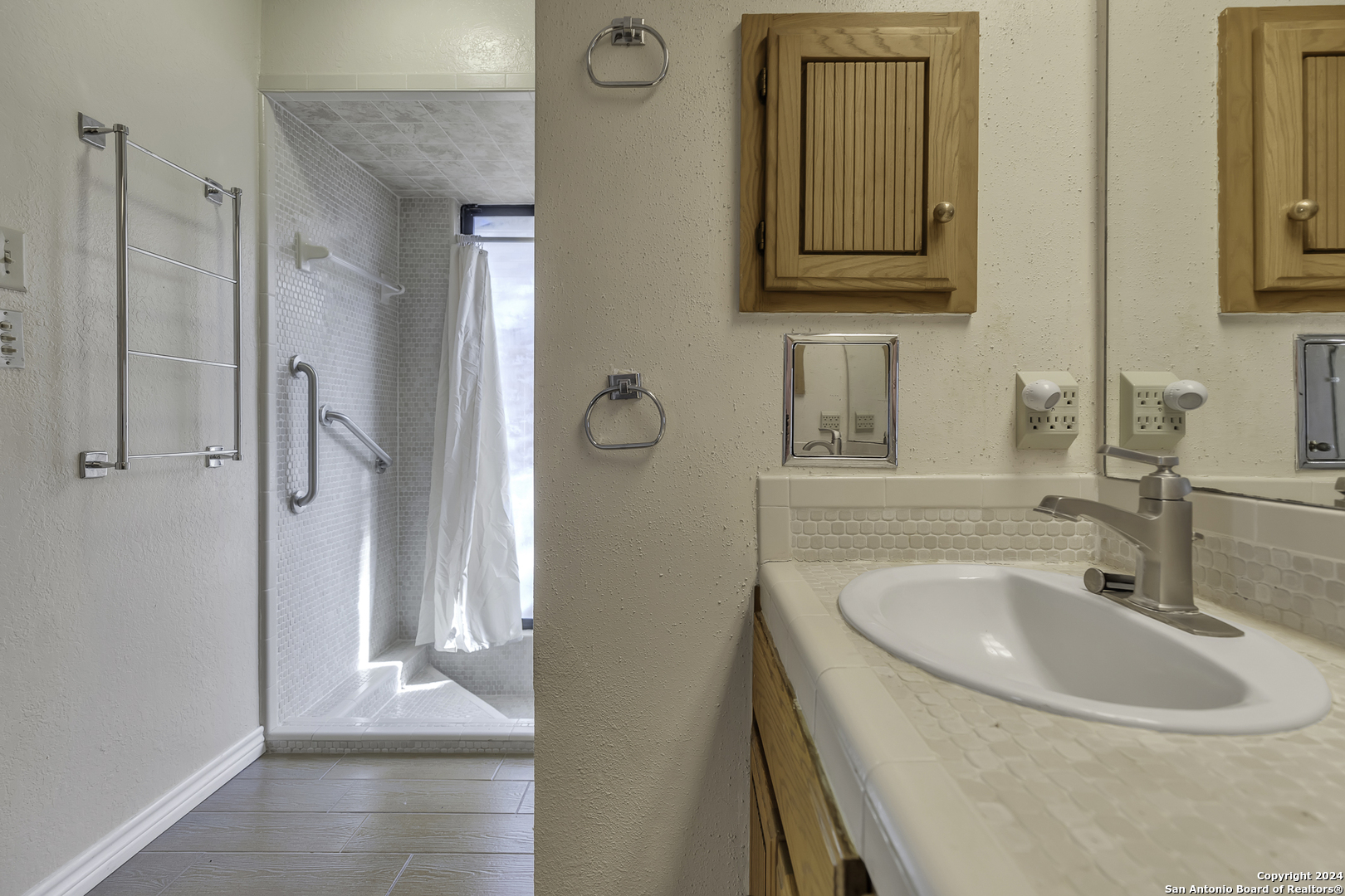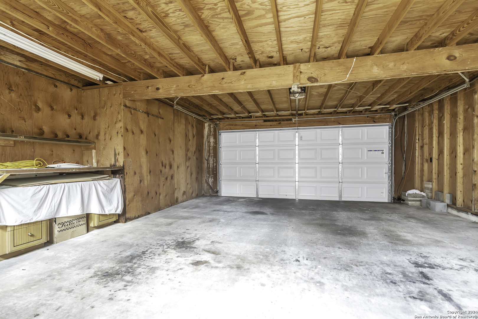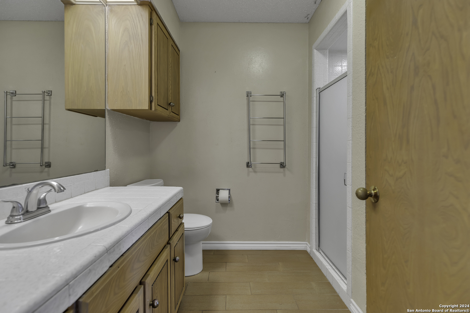 This beautiful condominium is nestled in a quiet forest of ancient oak trees, just minutes from the Medical Center without congested traffic and so close to shopping. Easy access to IH10 and Loop 410.The open concept kitchen/living area boasts a huge stone-faced fireplace and soaring ceilings filled with natural light and built in storage and shelves. Both bedrooms and bathrooms are spacious, have large closets and storage/cabinets, a floored attic for extra storage. Two car garage with work bench/shelving. Private rear driveway that connects to the house through the patio. Neighborhood pool and clubhouse across the street.