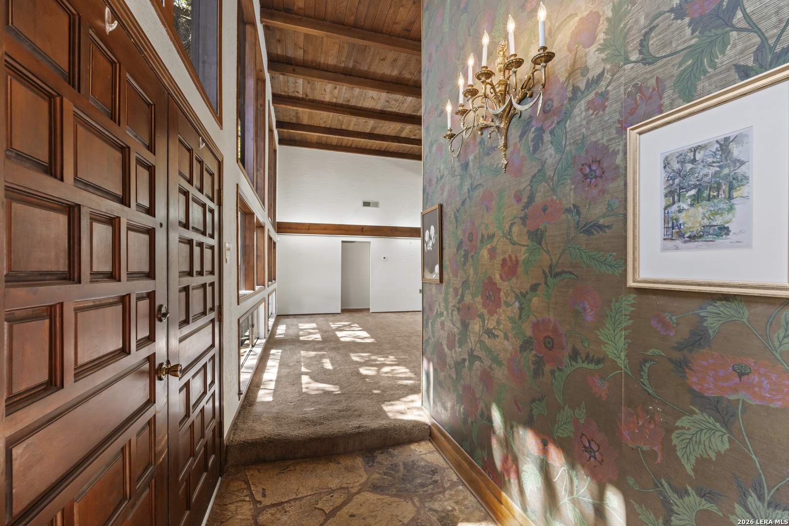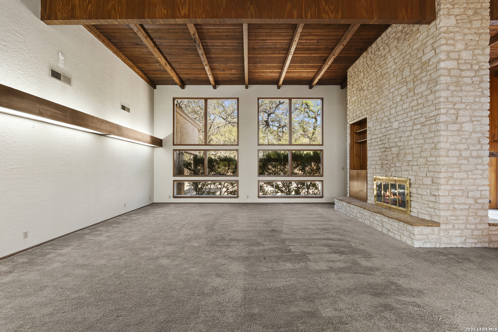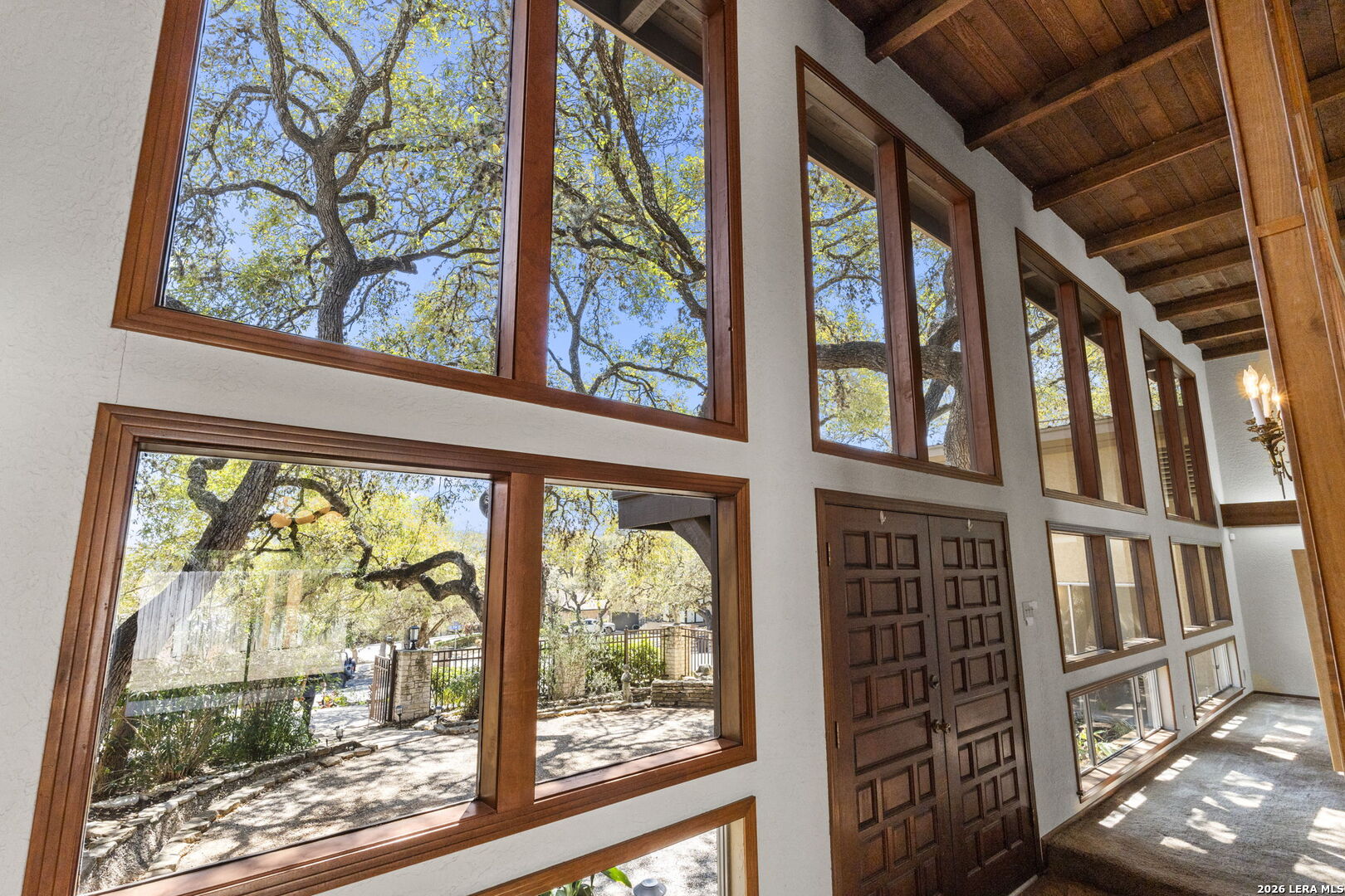 Step into timeless design in this mid-century style home. Featuring 4 spacious bedrooms and 3 baths, this residence blends iconic architectural elements with a gorgeous natural setting. Dramatic 20-foot ceilings create an airy, light-filled living space, anchored by a striking double-sided fireplace that seamlessly connects the main living area to a stylish cocktail bar and lounge area-perfect for entertaining or relaxing evenings at home. At the heart of the property, a serene courtyard with a tranquil pond offers a private outdoor retreat, with the expansive primary suite providing direct access to this peaceful space, creating a true indoor-outdoor living experience. Additional highlights include a 2-car garage, a circular driveway for added convenience and curb appeal, mature trees provide shade and character, Newer HVAC and roof. The low-maintenance patio backyard is ideal for those seeking beauty without the upkeep. This unique home captures the essence of mid-century design with thoughtful details and inviting spaces throughout-perfect for both everyday living and memorable gatherings.
