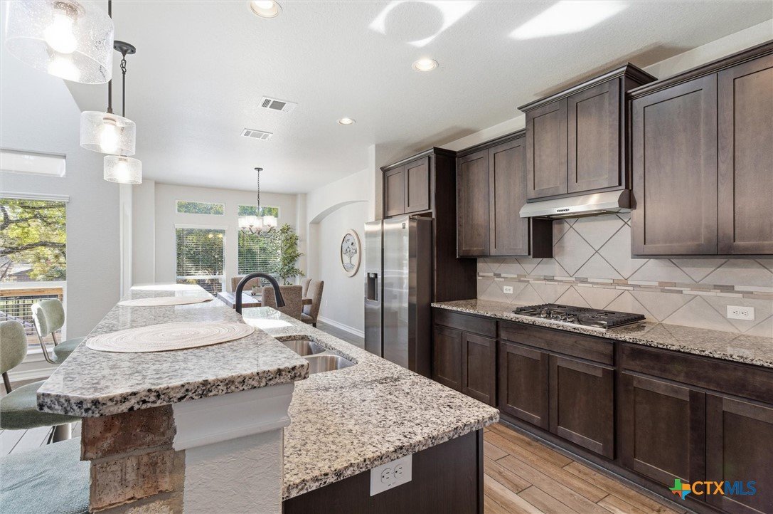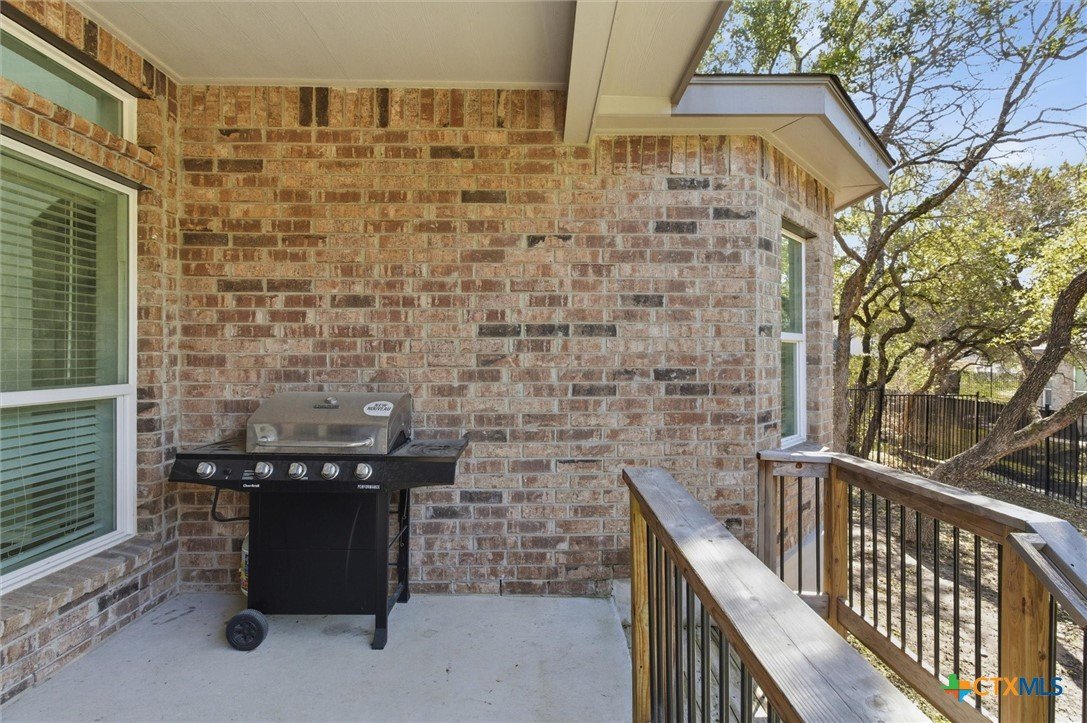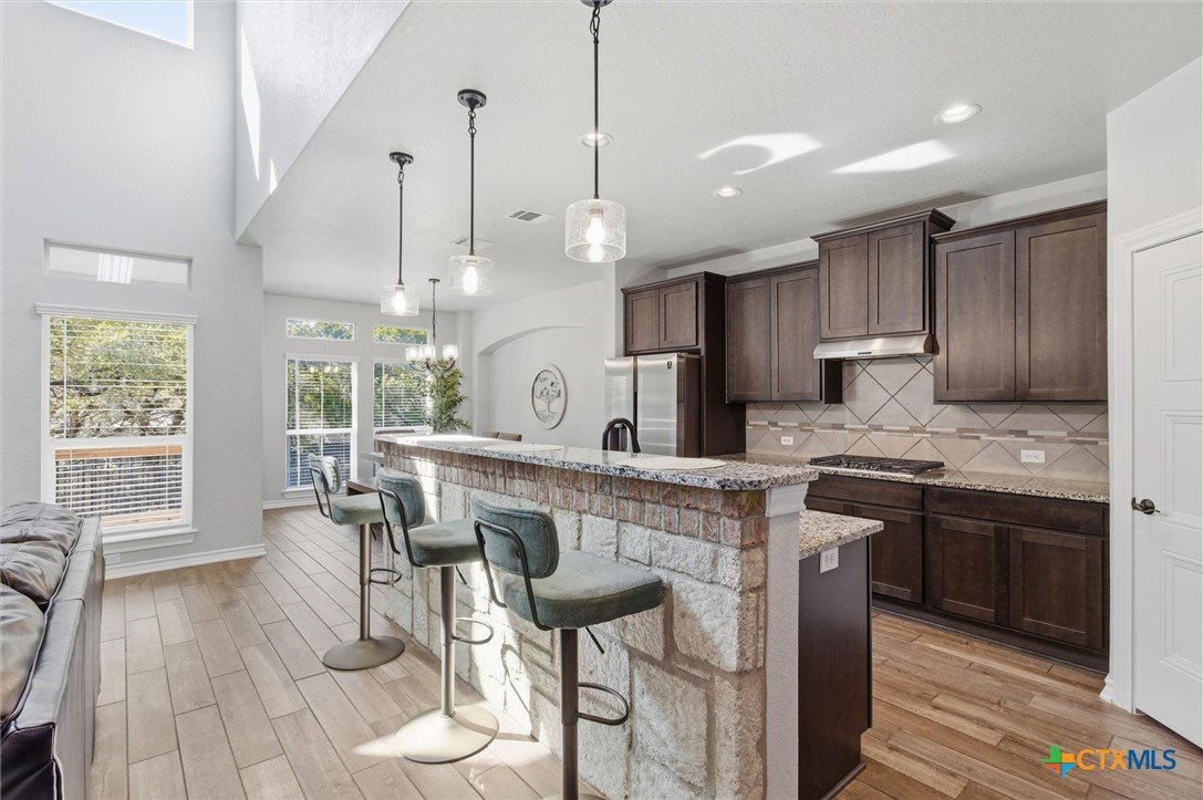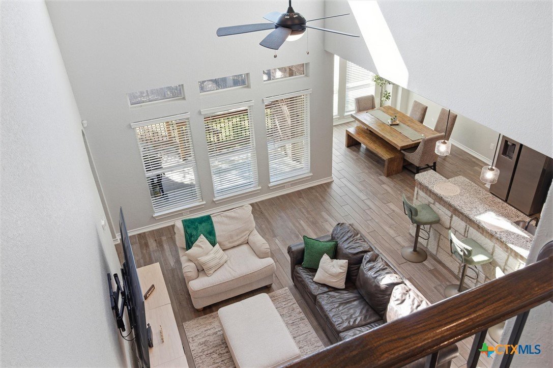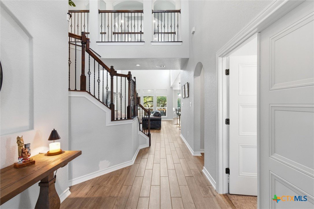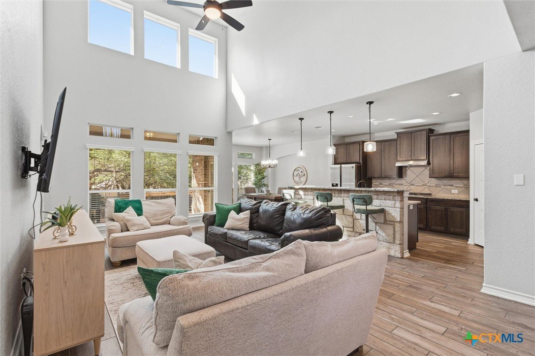 See what it means to be perfectly placed. Built by New Leaf Homes in 2021 and spanning approximately 3,099 square feet, this thoughtfully designed home offers space, comfort, and functionality in the heart of Blanco Vista. From the moment you step inside, you are welcomed by a two-story foyer highlighted by a striking coffered-style ceiling. Just off the entry is a flexible office or guest bedroom with a full bathroom, ideal for working from home or hosting visitors. As you move through the home, a graceful staircase and catwalk draw your attention and lead you toward the heart of the house. The kitchen is designed for both everyday living and entertaining, featuring stainless steel appliances, a gas cooktop, a French door refrigerator, and a built-in oven and microwave. Opening seamlessly to the dining and living areas, to create a connected space where gatherings feel effortless and inviting. The primary suite is conveniently located on the main level and offers a generous retreat with a well-appointed en suite bathroom. Dual vanities, a large walk-in shower, a soaking tub, and separate walk-in closets provide both comfort and a sense of luxury. Upstairs, you will find a spacious loft-style second living area that works perfectly as a family room, game space, or private retreat. Extra bedrooms and bathrooms offer flexibility for guests or family members, including one en suite and one guest bathroom. Additional highlights include a rare three-car garage and a dedicated laundry room with built-in storage. Outside, the backyard provides a welcoming space to unwind or entertain, whether enjoying a quiet evening or hosting loved ones. Located in the established Blanco Vista community, this home also offers convenience with easy access to I-35, making travel to Austin and San Antonio simple and efficient. Designed for everyday living and lasting memories.