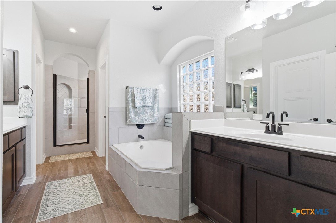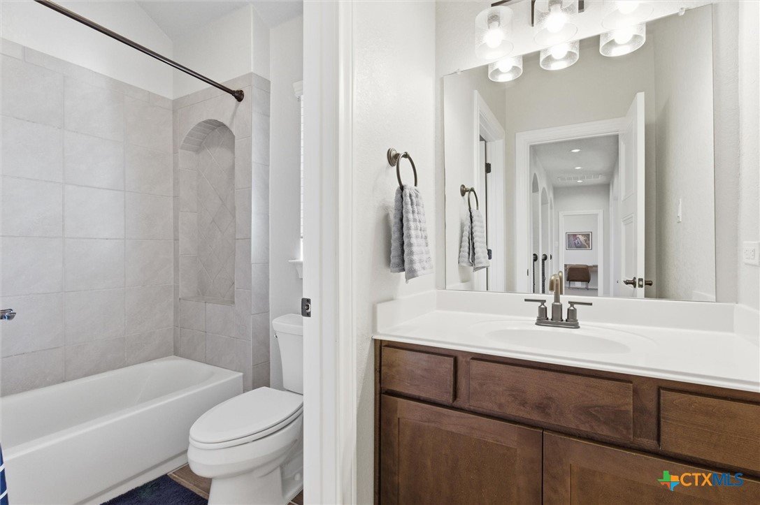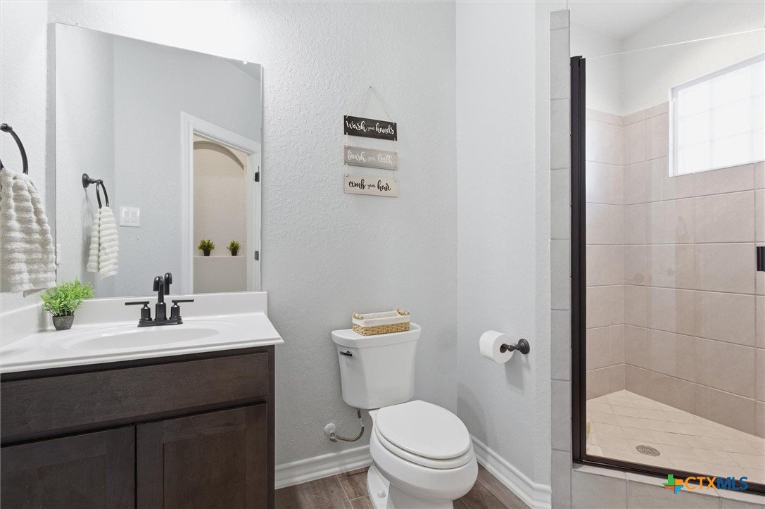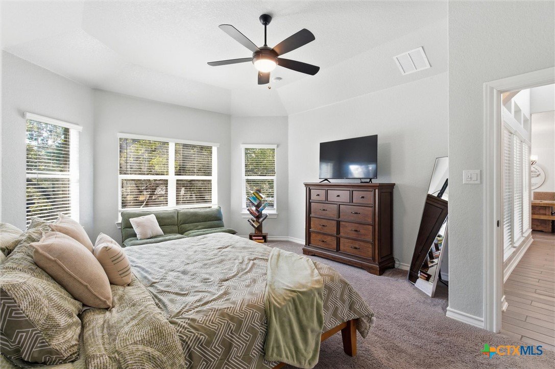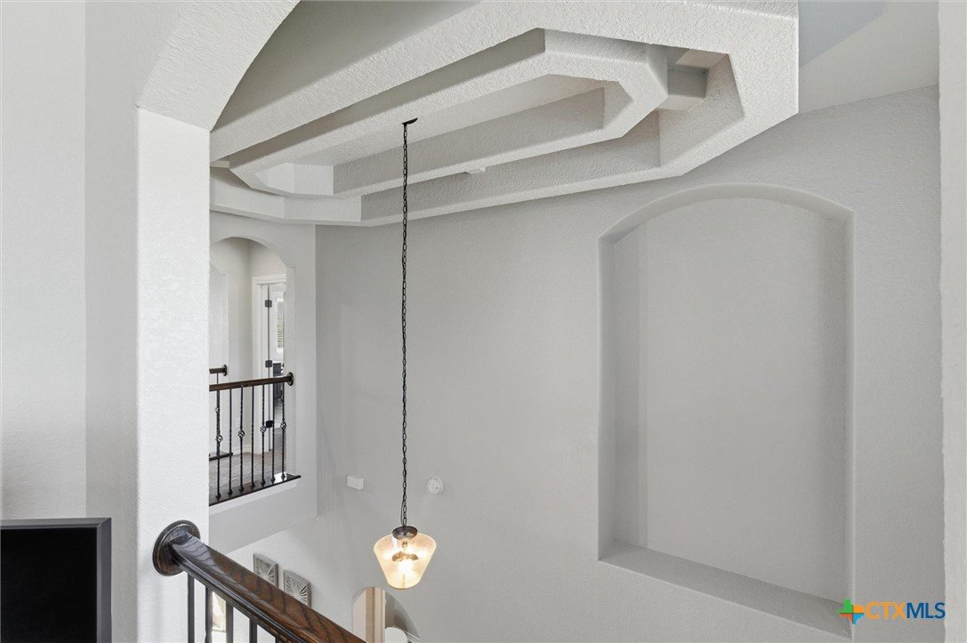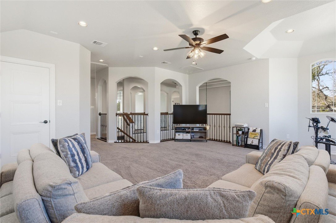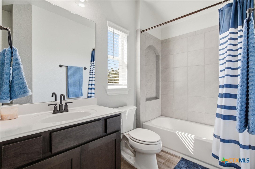 See what it means to be perfectly placed. Built by New Leaf Homes in 2021 and spanning approximately 3,099 square feet, this thoughtfully designed home offers space, comfort, and functionality in the heart of Blanco Vista. From the moment you step inside, you are welcomed by a two-story foyer highlighted by a striking coffered-style ceiling. Just off the entry is a flexible office or guest bedroom with a full bathroom, ideal for working from home or hosting visitors. As you move through the home, a graceful staircase and catwalk draw your attention and lead you toward the heart of the house. The kitchen is designed for both everyday living and entertaining, featuring stainless steel appliances, a gas cooktop, a French door refrigerator, and a built-in oven and microwave. Opening seamlessly to the dining and living areas, to create a connected space where gatherings feel effortless and inviting. The primary suite is conveniently located on the main level and offers a generous retreat with a well-appointed en suite bathroom. Dual vanities, a large walk-in shower, a soaking tub, and separate walk-in closets provide both comfort and a sense of luxury. Upstairs, you will find a spacious loft-style second living area that works perfectly as a family room, game space, or private retreat. Extra bedrooms and bathrooms offer flexibility for guests or family members, including one en suite and one guest bathroom. Additional highlights include a rare three-car garage and a dedicated laundry room with built-in storage. Outside, the backyard provides a welcoming space to unwind or entertain, whether enjoying a quiet evening or hosting loved ones. Located in the established Blanco Vista community, this home also offers convenience with easy access to I-35, making travel to Austin and San Antonio simple and efficient. Designed for everyday living and lasting memories.