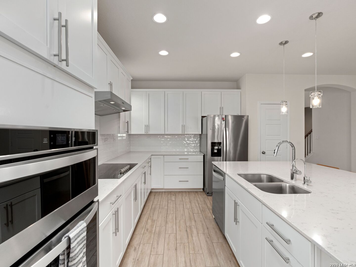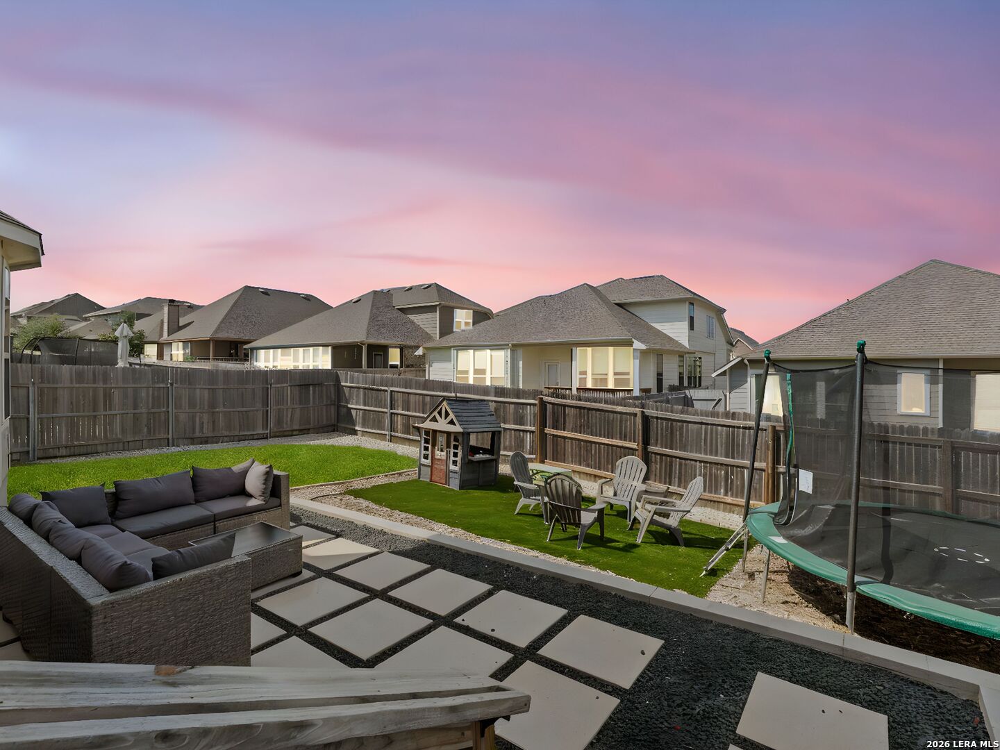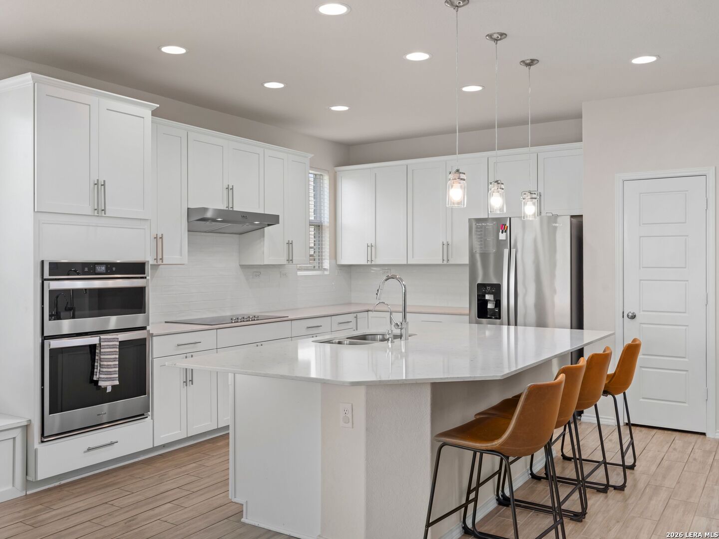 Welcome to the highly desirable Overlook at Creekside/Heatherfield community in New Braunfels, where you'll enjoy no city taxes and an unbeatable location less than 5 minutes from endless shopping, dining, and entertainment! Just 1.5 miles from I-35, this home offers effortless access to all that New Braunfels is known for. Nestled near the Creekside Crossing area by Buc-ee's, you're less than five minutes from Creekside Town Center, Freiheit Village, H-E-B Plus, EVO Entertainment, Target, restaurants, medical centers, and so much more. Built by Pulte Homes, this charming two-story residence showcases timeless three-sided brick masonry and modern design touches throughout. Step inside to a bright, open layout filled with natural light, high ceilings at the entrance, and graceful architectural details. The inviting foyer opens to a private study with French doors, plus a secondary bedroom and full bath on the main level, perfect for guests or another home office setup. At the heart of the home, the open-concept family room, kitchen, and casual dining area flow seamlessly together. The living room features a sleek, modern electric fireplace with a black shiplap accent wall and wood mantel, creating a warm and stylish focal point. The gourmet kitchen is a showstopper with a large quartz island ideal for gathering, 42" white cabinetry with modern hardware, subway tile backsplash, and built-in Whirlpool stainless-steel appliances, including an oven, cooktop, microwave, and dishwasher. The primary suite offers a peaceful retreat with a cozy bay window and a luxurious en-suite bath featuring a glass-enclosed walk-in shower, soaking tub, dual granite vanities, and a spacious walk-in closet. Ceramic wood-look tile runs throughout the main level for easy maintenance, with carpet reserved for the bedrooms, game room, and media room. Upstairs is the ultimate fun vibes hangout! Step into the stylish game room you can create, perfect for movie marathons, game nights, or just kicking back with friends. Turn movie nights into an experience! Right off this space, you'll find a private media room for a true full theater experience with tiered recliner seating, multiple wall-mounted screens, and a cozy, sound- insulated setting perfect for relaxing, entertaining, or hosting game-day watch parties. Furniture and recliners not included. Also upstairs are two cozy bedrooms and a spacious full bath featuring a long granite countertop and modern finishes. Step outside to a backyard that feels like an extension of your living space and is designed for entertaining, plus an extended porch with a talitchy-style layout, modern cement tiles framed by decorative black rocks for a sleek, outdoor lounge feel. It's the perfect setup for dining, relaxing, or hosting friends in style. There's plenty of yard space for play and a stylish setup for gatherings. Additional highlights include a pocket office, double-pane windows, garage door openers, the peace of mind of a remaining builder's structural warranty, and more. Community amenities include a sparkling pool, pavilion with grills, and walking/jogging trails, with plans for a second pool and playground underway. Residents enjoy an active, social lifestyle surrounded by natural beauty and convenience. Located minutes from I-35 and SH-46, commuters will love the quick drive to San Antonio, Seguin, or Austin, while still being close to charming Historic Downtown New Braunfels, Canyon Lake, Gruene, the Guadalupe River, Landa Park, Schlitterbahn, and zoned to Comal ISD. It's the ideal blend of peaceful neighborhood living and everyday convenience. Don't miss your chance to own a piece of New Braunfels charm!