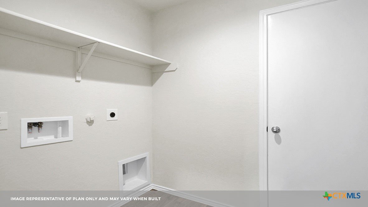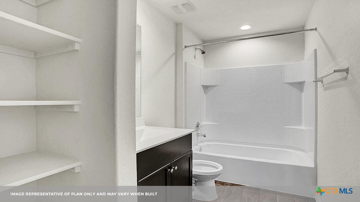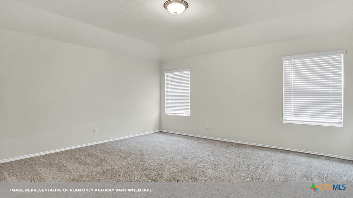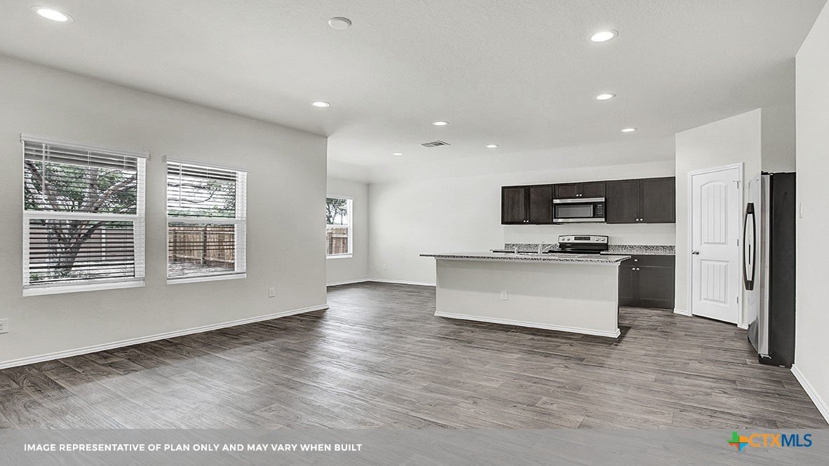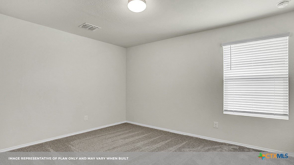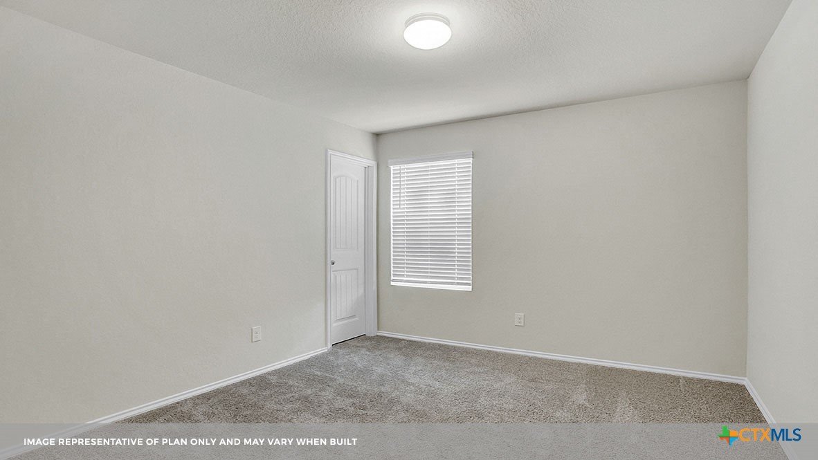 MARCH ESTIMATED COMPLETION DATE. The Bellvue is one of our one-story floorplans featured at our Arroyo Ranch community in Seguin, Texas. This home is perfect for smaller families or homeowners looking to downsize. Featuring 3 bedrooms and 2 bathrooms, this home also includes a 2-car garage all within 1,415 square feet of living space. When you enter the home from the covered front porch, you will find a short hallway that leads to the secondary bedrooms and bathroom. Bathroom 2 includes a tub/shower combination, and both bedrooms include a walk closet with shelving. Whether you use these rooms for an office, child’s room or guest room, there is enough room for sleep and play. The living area is an open concept design, so you are always close to the action in the family room, kitchen or dining area. The kitchen features an island with an undermount sink facing the family room, stainless steel appliances, granite countertops, corner pantry closet and 36” upper cabinets. Enjoy the natural light with four rear windows looking out to the backyard. The primary bedroom is off the family room and includes its own attached bathroom, making the start of your day a seamless step from sleep to your morning routine. Enjoy the 5’ walk in shower, vanity and separate door to the toilet for privacy. A walk-in closet with generous shelving is connected to the bathroom. The utility room is outside the primary bedroom, allowing for the laundry chores to be completed with ease. The Bellvue includes vinyl flooring throughout the common areas of the home, and carpet in the bedrooms. All our new homes feature a covered back patio, full sod, an irrigation system in the front and back yard, and a 6’ privacy fence around the back yard. This home includes our America’s Smart Home base package, which includes the Amazon Echo Pop, Front Doorbell, Front Door Deadbolt Lock, Home Hub, Thermostat, and Deako® Smart Switches.