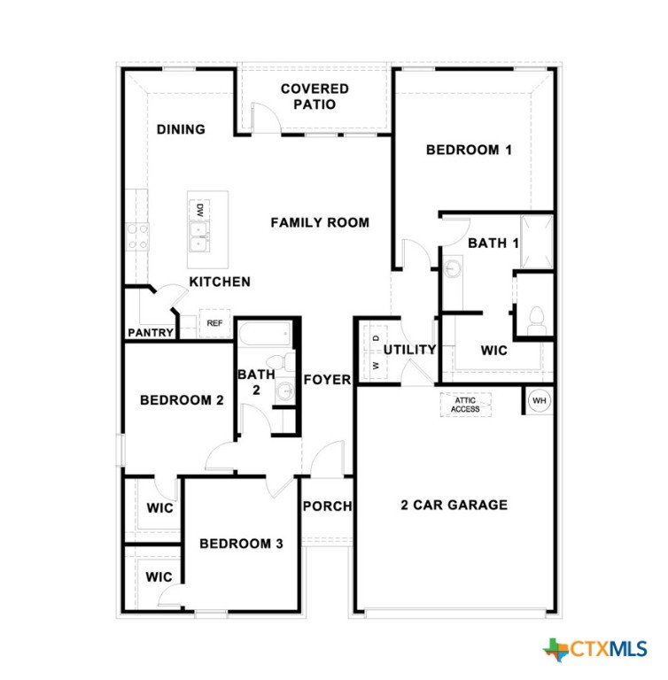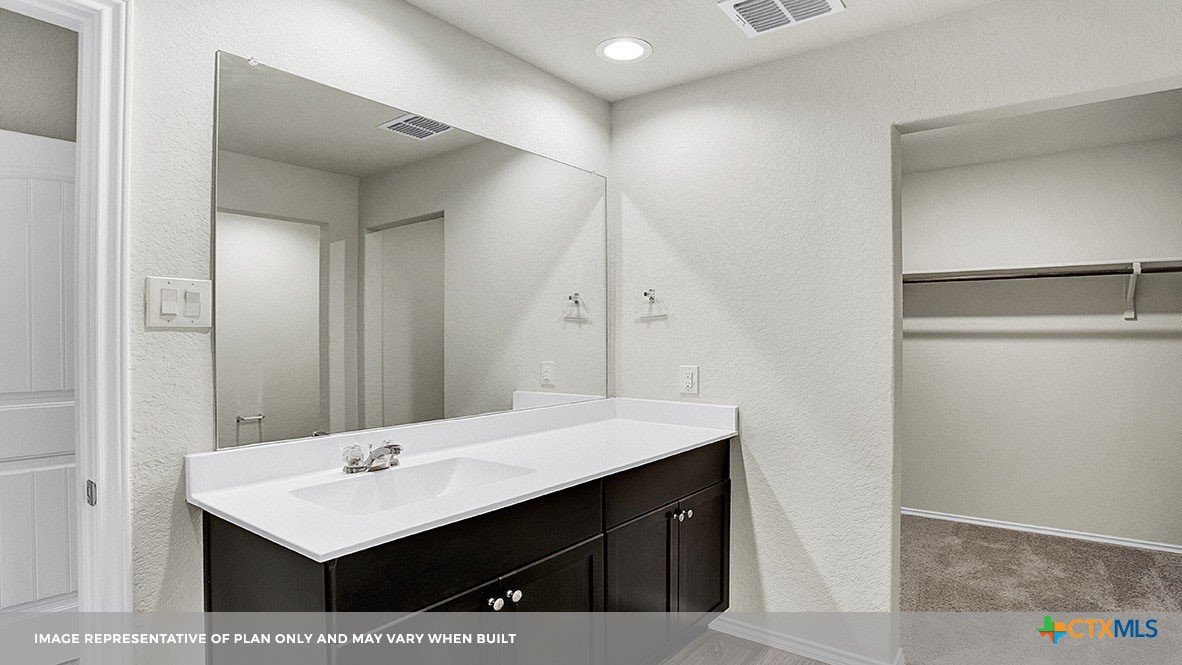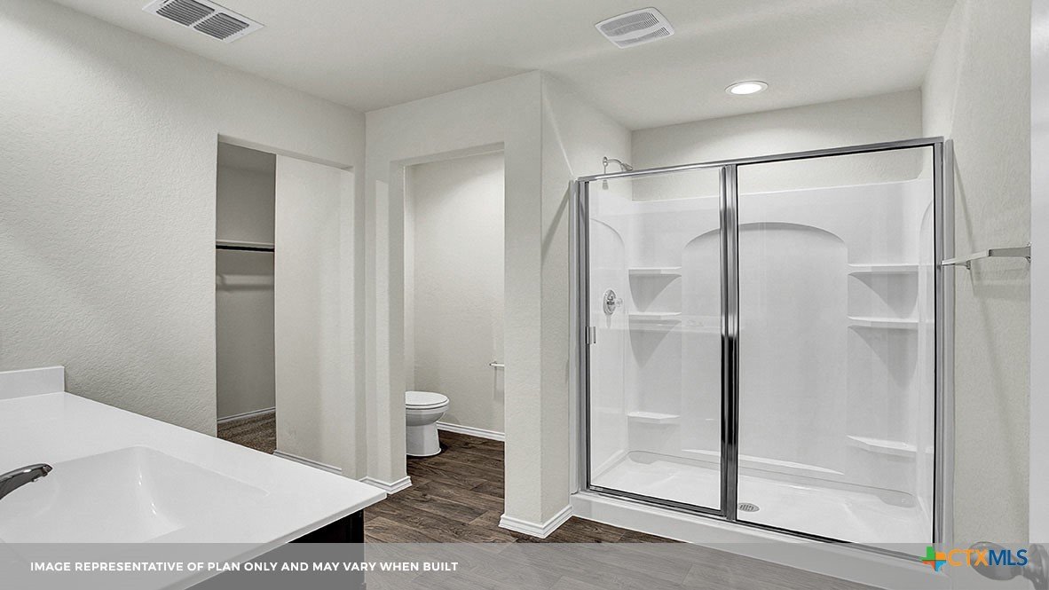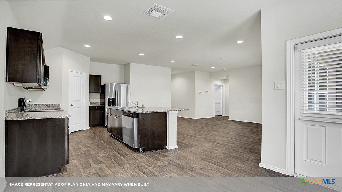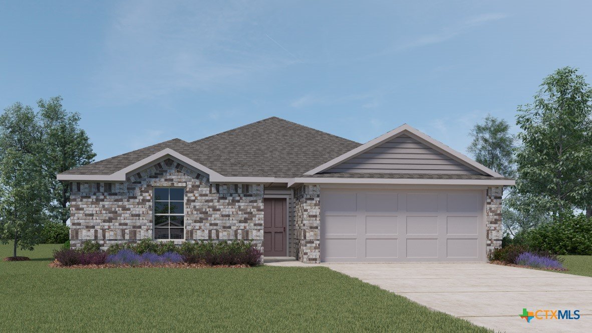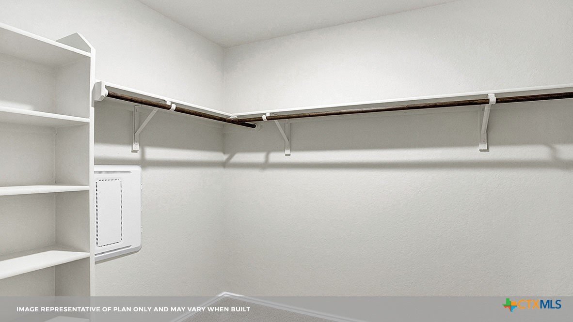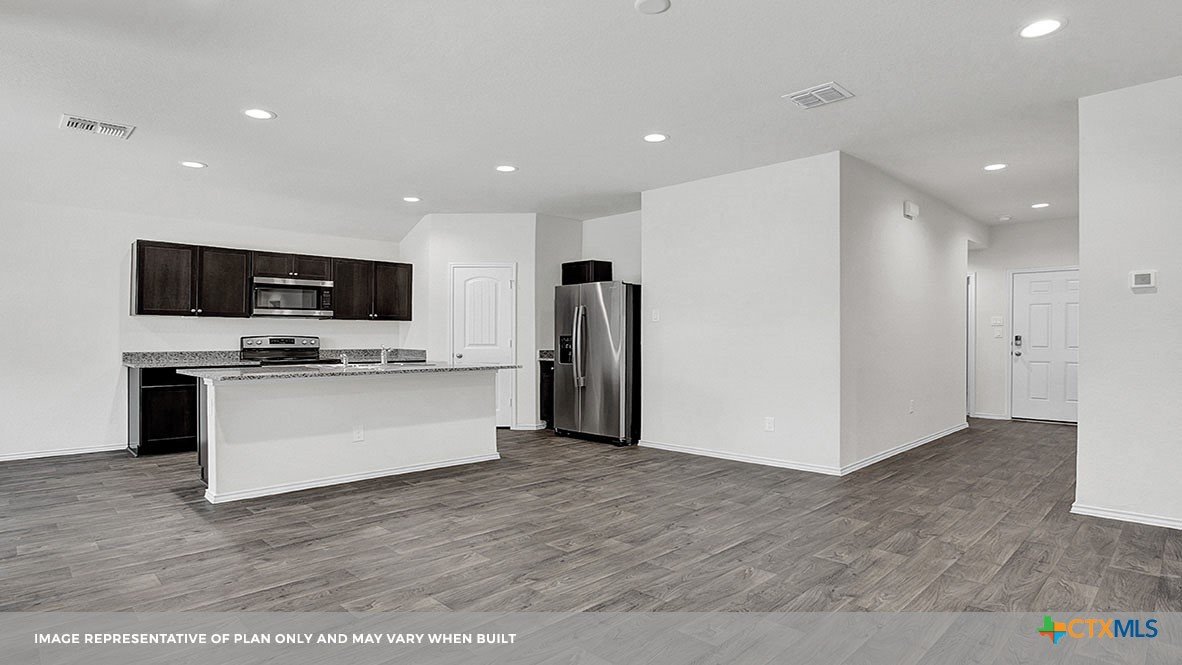 MARCH ESTIMATED COMPLETION DATE. The Bellvue is one of our one-story floorplans featured at our Arroyo Ranch community in Seguin, Texas. This home is perfect for smaller families or homeowners looking to downsize. Featuring 3 bedrooms and 2 bathrooms, this home also includes a 2-car garage all within 1,415 square feet of living space. When you enter the home from the covered front porch, you will find a short hallway that leads to the secondary bedrooms and bathroom. Bathroom 2 includes a tub/shower combination, and both bedrooms include a walk closet with shelving. Whether you use these rooms for an office, child’s room or guest room, there is enough room for sleep and play. The living area is an open concept design, so you are always close to the action in the family room, kitchen or dining area. The kitchen features an island with an undermount sink facing the family room, stainless steel appliances, granite countertops, corner pantry closet and 36” upper cabinets. Enjoy the natural light with four rear windows looking out to the backyard. The primary bedroom is off the family room and includes its own attached bathroom, making the start of your day a seamless step from sleep to your morning routine. Enjoy the 5’ walk in shower, vanity and separate door to the toilet for privacy. A walk-in closet with generous shelving is connected to the bathroom. The utility room is outside the primary bedroom, allowing for the laundry chores to be completed with ease. The Bellvue includes vinyl flooring throughout the common areas of the home, and carpet in the bedrooms. All our new homes feature a covered back patio, full sod, an irrigation system in the front and back yard, and a 6’ privacy fence around the back yard. This home includes our America’s Smart Home base package, which includes the Amazon Echo Pop, Front Doorbell, Front Door Deadbolt Lock, Home Hub, Thermostat, and Deako® Smart Switches.