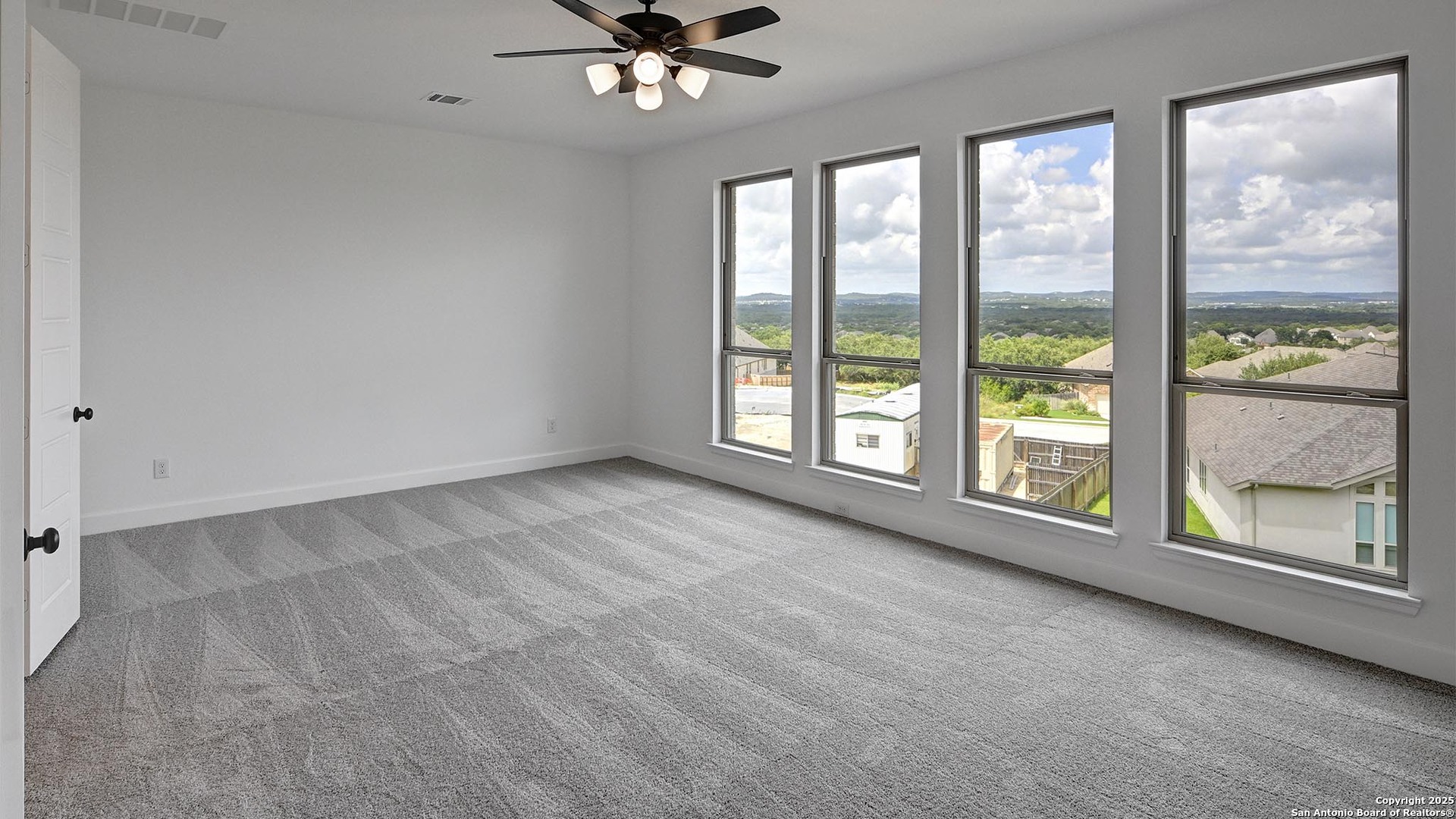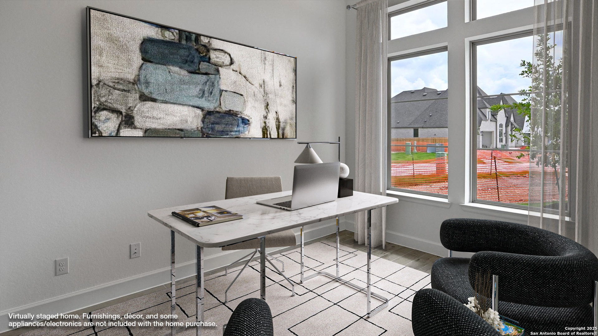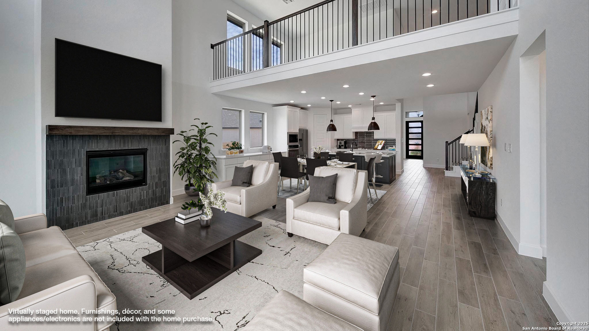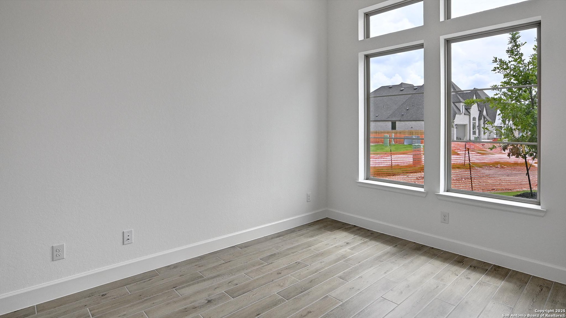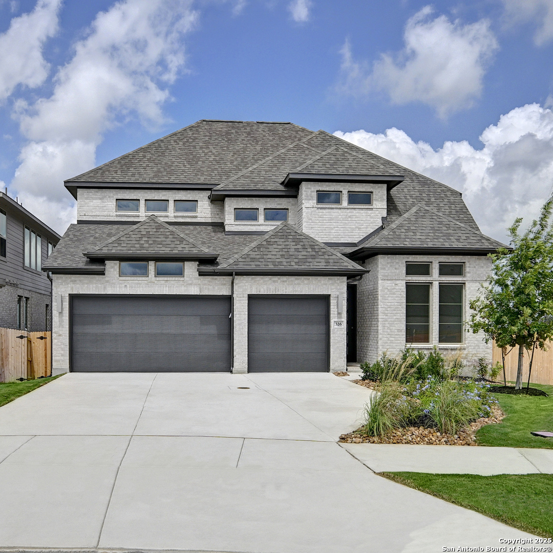 Home office with French doors frames the 19-foot entry. Generous family room with a grand wall of windows, wood mantel fireplace and a 19-foot ceiling flows into the dining area. Island kitchen with built-in seating space features a walk-in pantry and 5-burner gas cooktop. Secluded primary suite features a grand bedroom with a wall of windows. Primary bathroom offers a double door entry, dual vanities, freestanding tub, separate glass enclosed shower and two walk-in closets. Guest suite with full bathroom and walk-in closet on first floor. Second level hosts secondary bedrooms, a Hollywood bathroom, a media room with a storage closet and a game room with three large windows. A utility room and a half bathroom complete this generous design. Covered backyard patio. Mud room just off the three-car garage.
