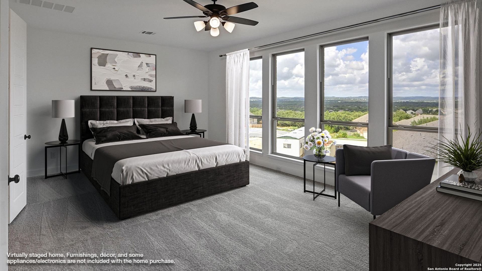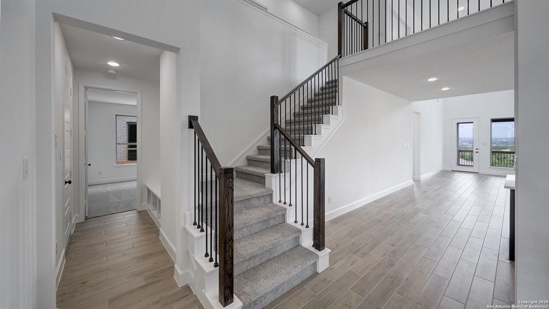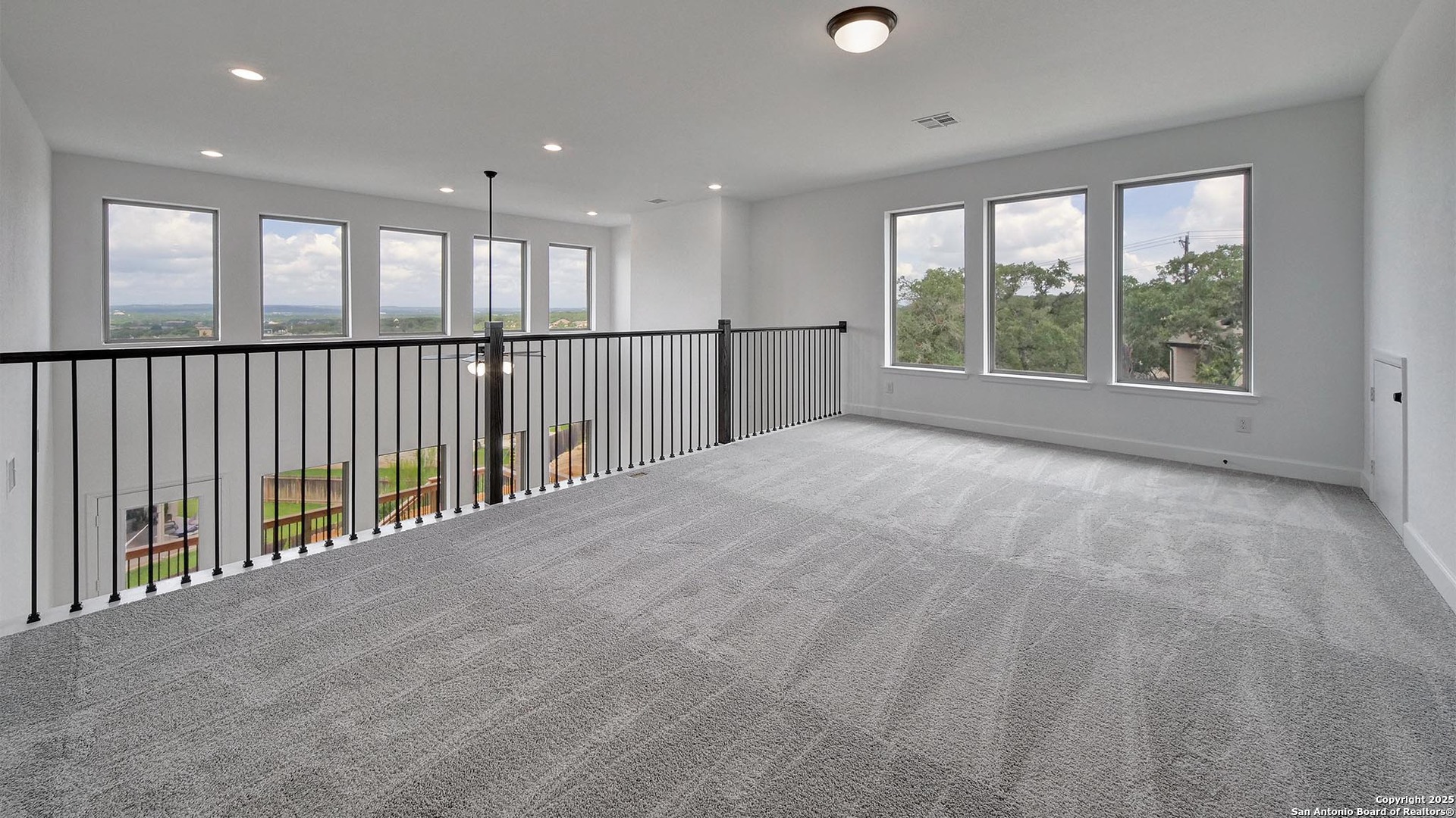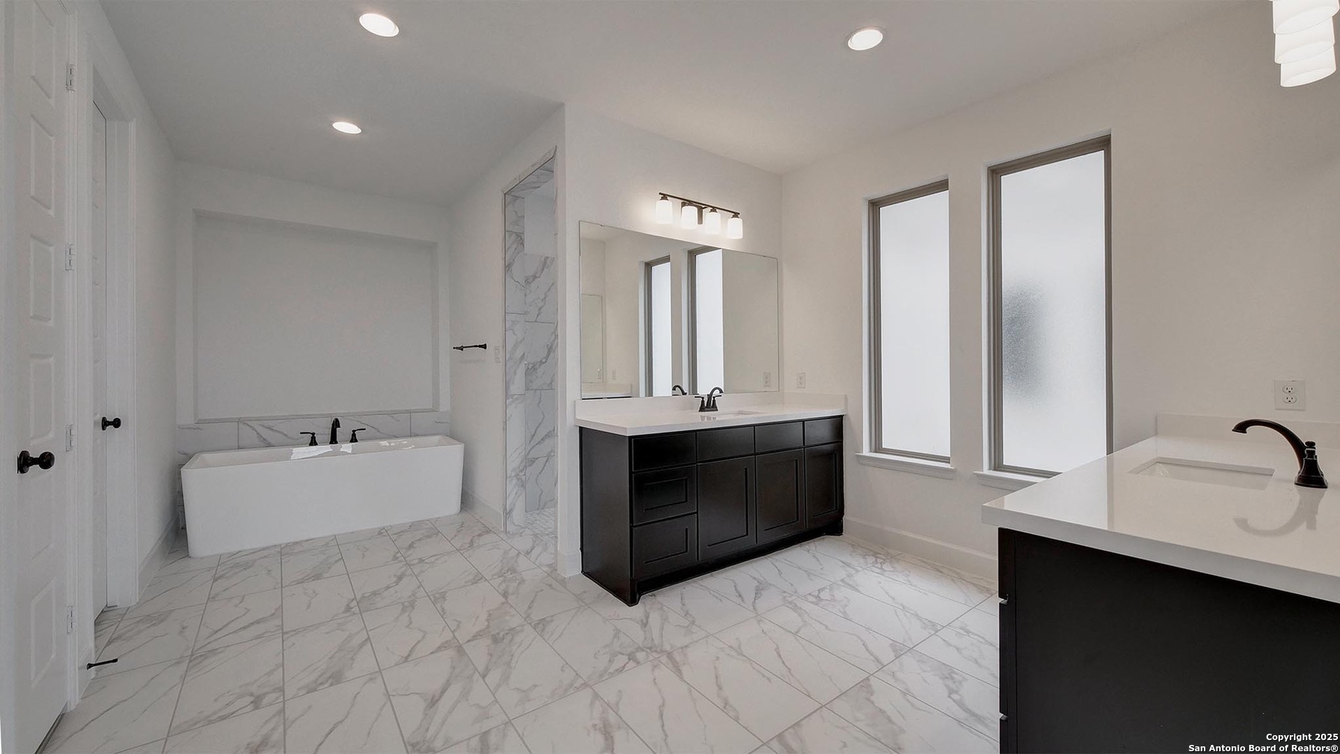 Home office with French doors frames the 19-foot entry. Generous family room with a grand wall of windows, wood mantel fireplace and a 19-foot ceiling flows into the dining area. Island kitchen with built-in seating space features a walk-in pantry and 5-burner gas cooktop. Secluded primary suite features a grand bedroom with a wall of windows. Primary bathroom offers a double door entry, dual vanities, freestanding tub, separate glass enclosed shower and two walk-in closets. Guest suite with full bathroom and walk-in closet on first floor. Second level hosts secondary bedrooms, a Hollywood bathroom, a media room with a storage closet and a game room with three large windows. A utility room and a half bathroom complete this generous design. Covered backyard patio. Mud room just off the three-car garage.