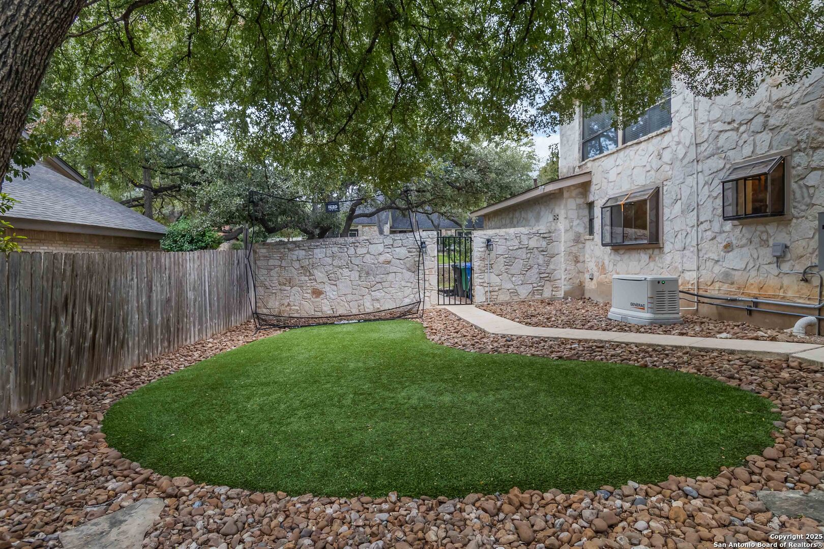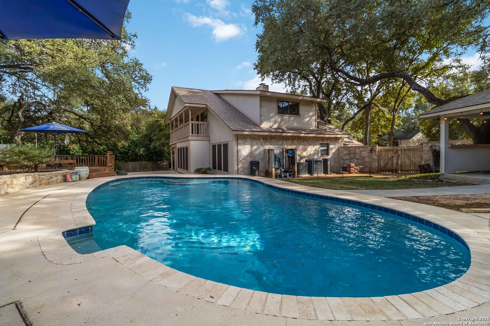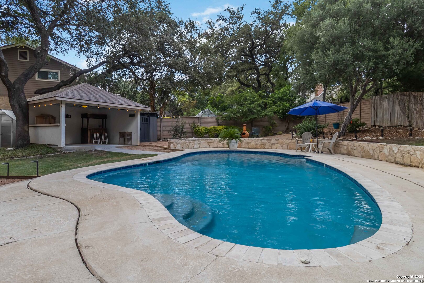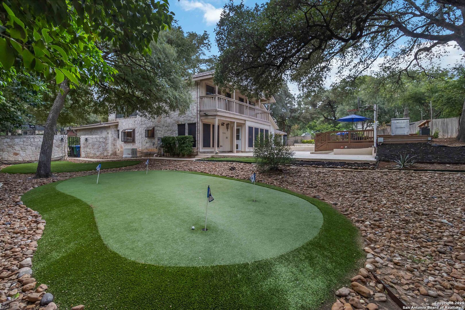 Where timeless charm meets easy living in the heart of North Central San Antonio. Nestled on a peaceful, tree-lined street, this beautifully maintained home invites you to slow down, stretch out, and savor every moment. Inside, you'll find a comfortable balance of space and sophistication - from the welcoming foyer with updated lighting to the sunlit kitchen featuring granite counters, built-in oven and microwave, smooth-top stove, ice machine, and cheerful garden windows bringing in natural light and views of the side yard. The downstairs primary suite offers a serene retreat away from it all, complete with a recently updated ensuite with shower and dual vanities, and a roomy bedroom overlooking the pool. Meanwhile upstairs are three spacious bedrooms, a double-sink bath, and a large game room providing plenty of room for everyone to spread out. Out back, the fun continues. Enjoy a refreshing swim, relax under the covered cabana, shoot hoops on the oversized patio, or practice your short game on the private putting green and driving net - or perhaps you'd simply prefer staying in touch with nature by spending time in your very own green house. And when it's time to eat, make the most of the oversized deck with plenty of space for both grilling and dining. This thoughtfully designed outdoor oasis is truly intended for both play and leisure. Bad weather warnings won't even dampen your joy, as you'll be the only home on the street with lights aglow, thanks to your Generac whole house generator! Set on nearly half an acre surrounded by mature oaks, this home is part of a friendly, walkable community known for its rolling hills and easy access to everything. From here, you can be at the airport, shopping, or your favorite restaurant in minutes. A home that's ready for your next chapter - with comfort, convenience, and character that never goes out of style.