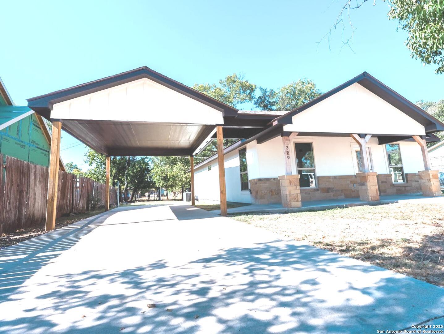 Brand New Carport has been added! Welcome to 329 Cottage St -Your Dream Home Awaits!** Discover this NEW CONSTRUCTION HOME, featuring 3 bedrooms and 2 baths across 1,260 square feet of exquisite living space. As you step inside, you'll be greeted by an impressive open floor plan adorned with elegant wood-like tile flooring throughout-no carpet in sight! The heart of this home is the remarkable kitchen, designed for the culinary enthusiast, complete with beautiful granite countertops, a stylish backsplash, custom white cabinetry offering ample storage, a sleek vent hood, a pot filler, and brand-new stainless steel appliances. The breakfast bar showcases charming rock details, perfectly blending modern design with hill country charm. This home provides a welcoming atmosphere, effortlessly connecting the dining area to the spacious living room, which features soaring ceilings. At the back of the home, you'll find 3 generously sized bedrooms, each equipped with ample closet space and ceiling fans for added comfort, alongside a convenient laundry area. Both bathrooms are designed with luxurious marble-like tile, contemporary fixtures, and elegant mirrors. The large energy-efficient tilt windows allow abundant natural light to the entire house. Step outside to discover a perfect yard for creating your own outdoor oasis, complete with a shed for additional storage. Ideally situated in the heart of Kerrville, this home offers scenic views of white-tailed deer and is just minutes away from essential amenities, grocery stores, medical facilities, restaurants, and recreational activities along the picturesque Guadalupe River. With exceptional attention to detail, this home is truly a standout opportunity. Don't miss your chance to make 329 Cottage St your new home or rental investment opportunity-schedule your showing today!