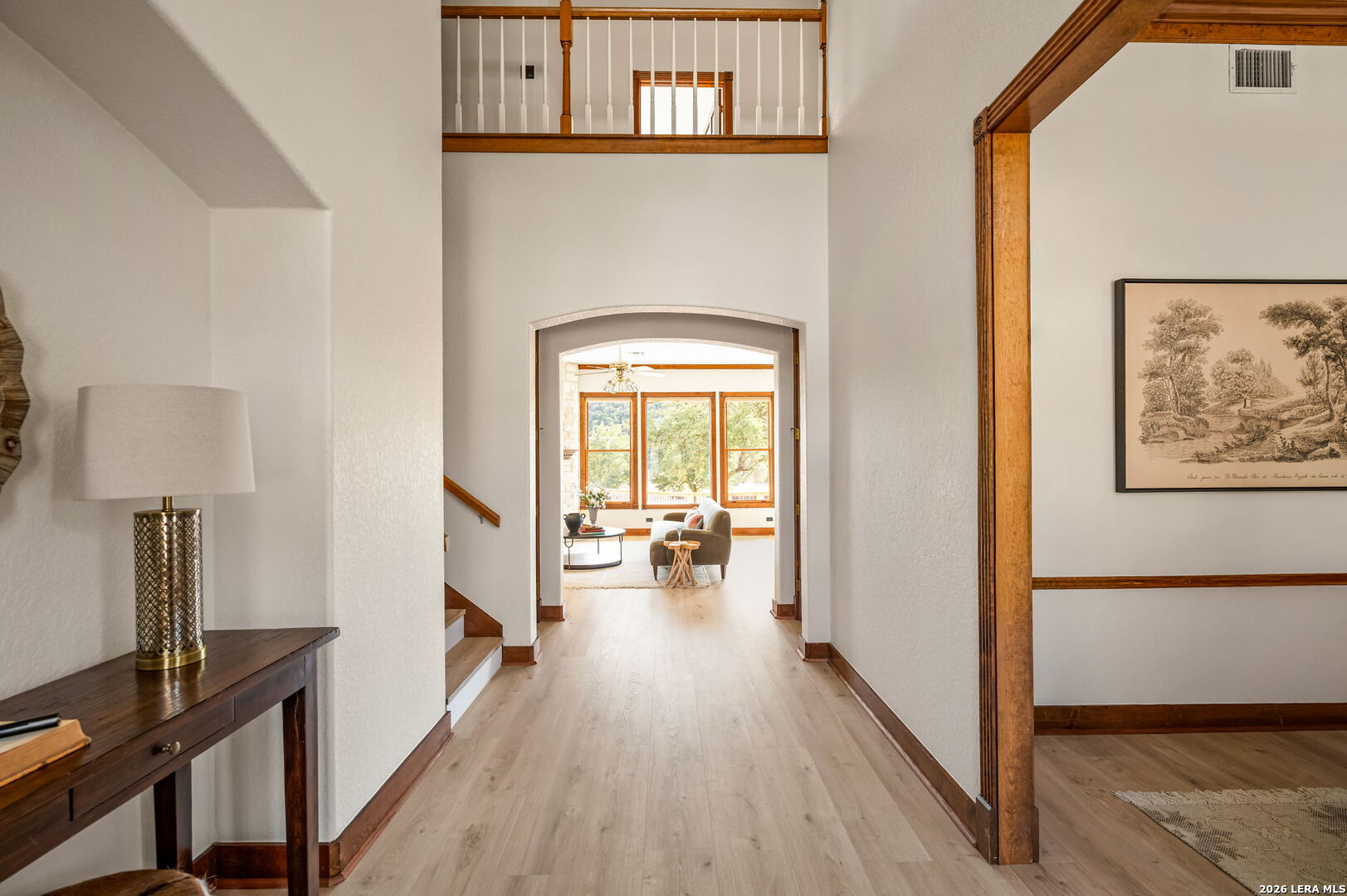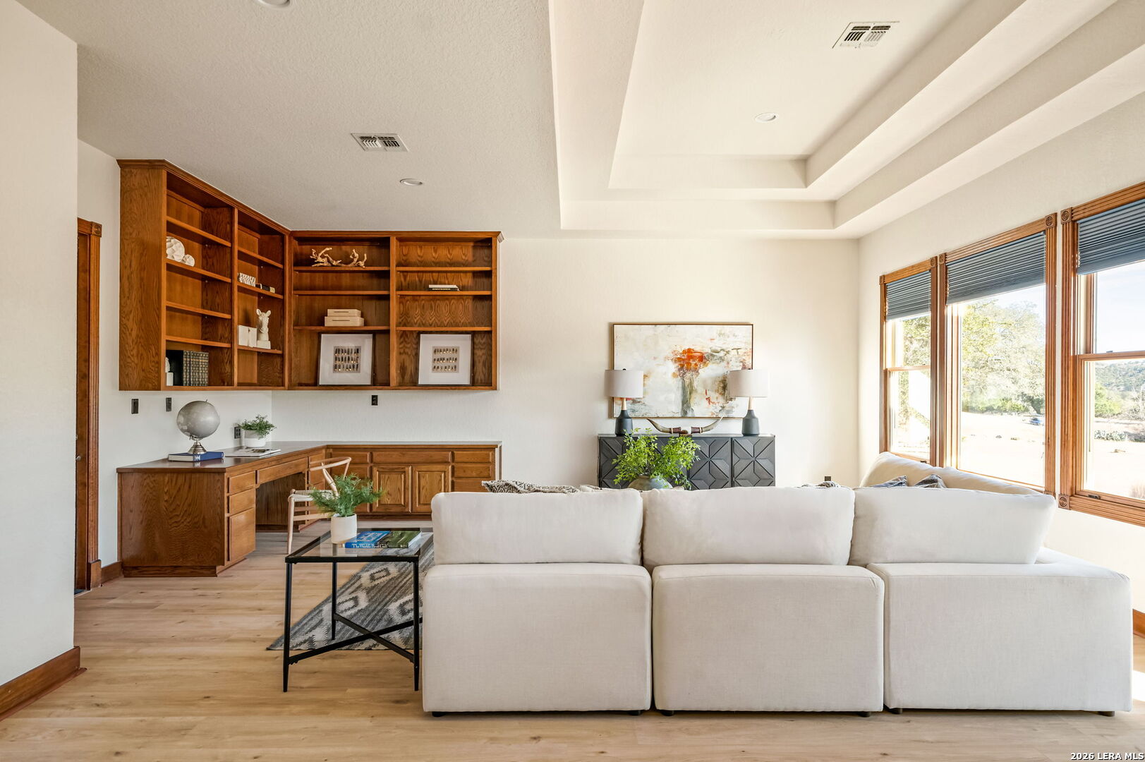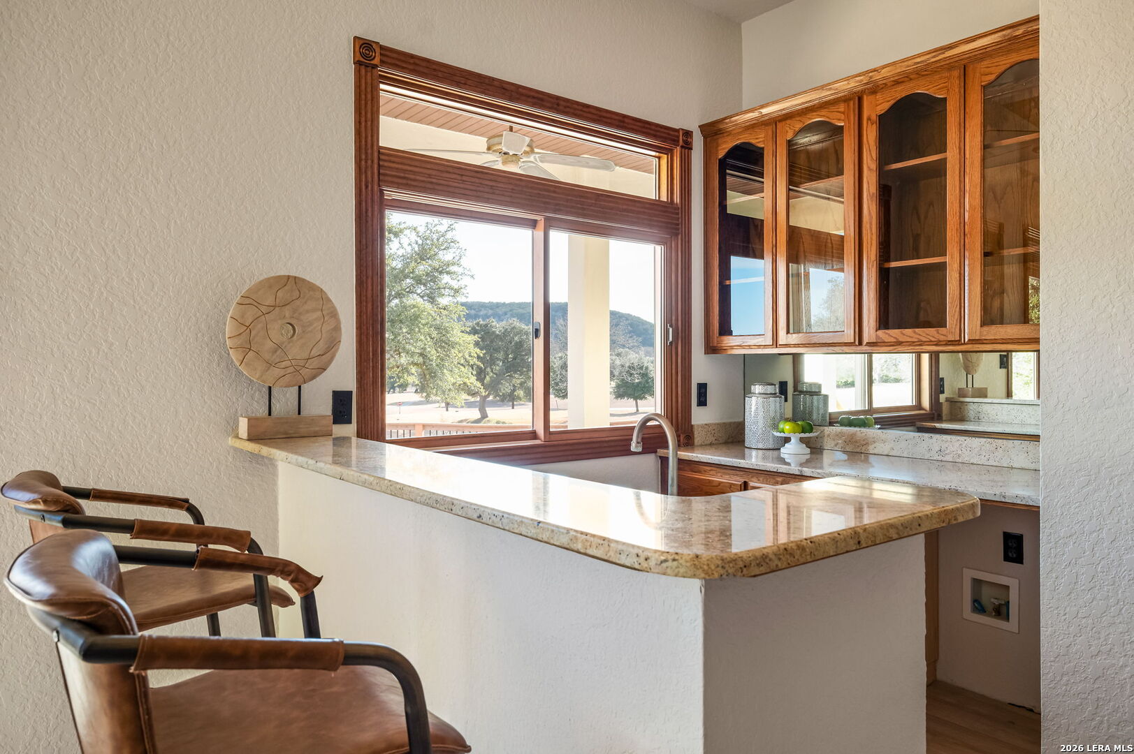 Located on the 15th fairway of Tapatio Springs, this exceptional Hill Country home offers golf course frontage, sweeping views, and a layout thoughtfully designed for modern-day living. With rare flexibility and a true split 6-car garage, it stands apart within the community.Positioned on Wild Turkey Blvd, the home is ideal for multigenerational living or those who value private retreats without sacrificing open gathering spaces. The floor plan allows for two primary suites on the main level, separate living areas, and optional private entrances-creating independence and comfort within a connected, cohesive design. Recently installed designer flooring brings the sophisticated look of authentic English oak while offering exceptional durability and performance. The wide-plank, ultra-matte finish pairs beautifully with fresh interior paint for a bright, updated feel throughout. Custom wood accents, wooden casement windows, and a standing-seam metal roof reflect quality craftsmanship and timeless design. Upstairs, two spacious bedrooms share a Jack-and-Jill bath, forming an ideal secondary living zone. The split 6-car garage-four bays on one side, two on the other-includes golf cart access, epoxy floors, a built-in air compressor, and staircase access to floored storage that could be finished for additional flex space. Direct access to the primary suite adds everyday convenience. Set within the resort-style Tapatio Springs community just minutes from historic downtown Boerne, this is a rare opportunity to own a golf-course home offering privacy, versatility, thoughtful updates, and stunning Hill Country views.