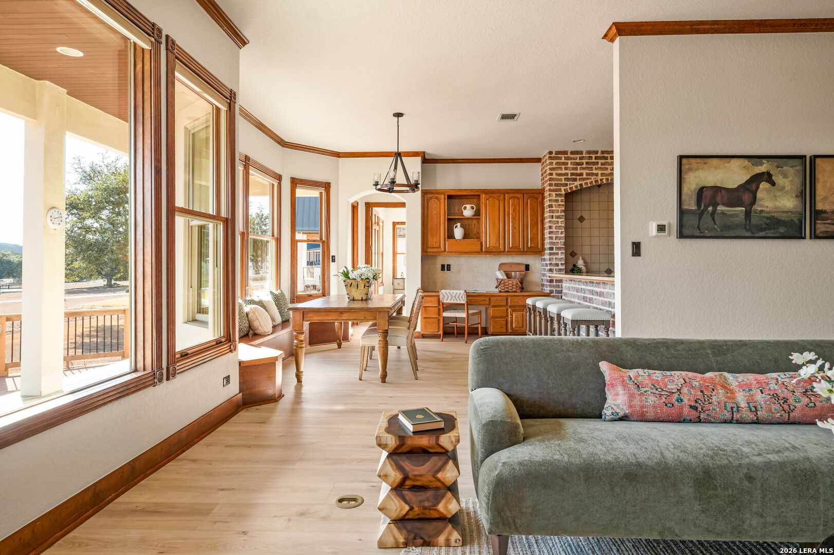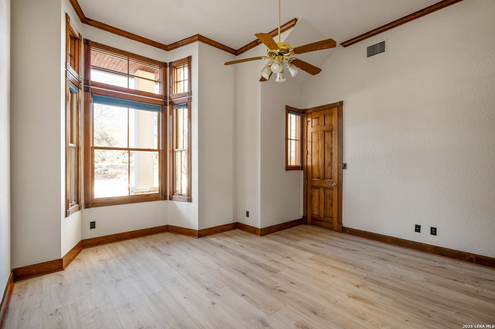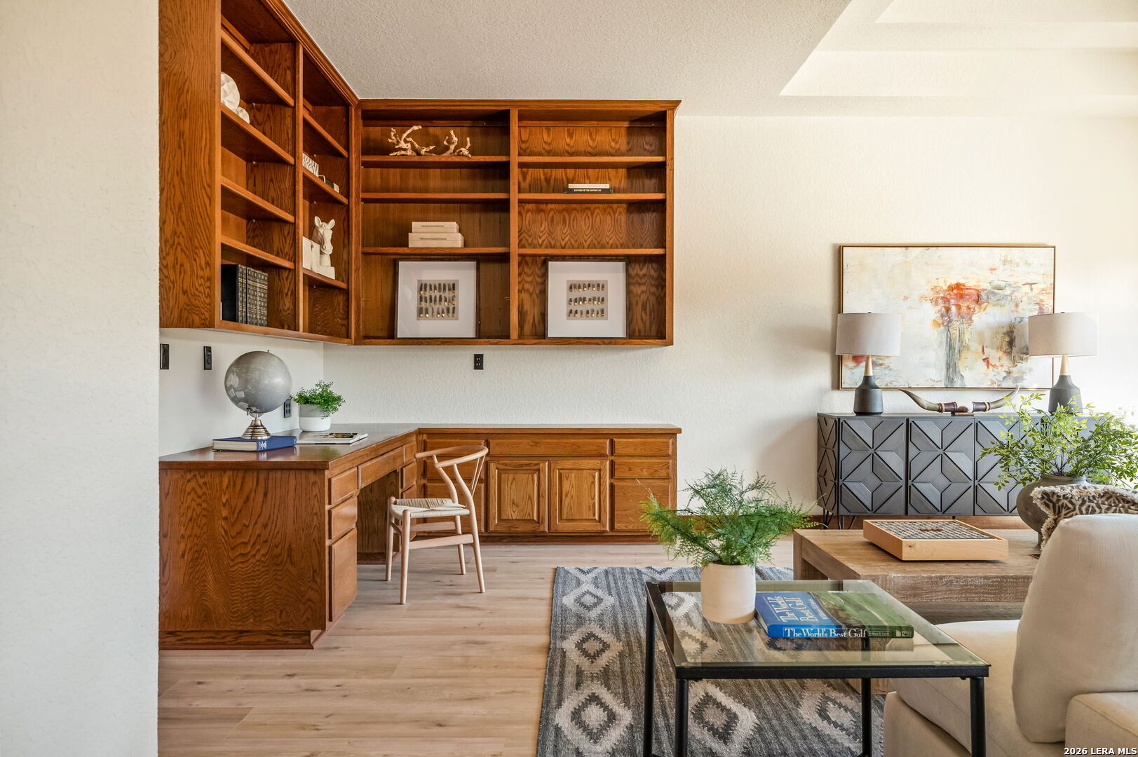 Located on the 15th fairway of Tapatio Springs, this exceptional Hill Country home offers golf course frontage, sweeping views, and a layout thoughtfully designed for modern-day living. With rare flexibility and a true split 6-car garage, it stands apart within the community.Positioned on Wild Turkey Blvd, the home is ideal for multigenerational living or those who value private retreats without sacrificing open gathering spaces. The floor plan allows for two primary suites on the main level, separate living areas, and optional private entrances-creating independence and comfort within a connected, cohesive design. Recently installed designer flooring brings the sophisticated look of authentic English oak while offering exceptional durability and performance. The wide-plank, ultra-matte finish pairs beautifully with fresh interior paint for a bright, updated feel throughout. Custom wood accents, wooden casement windows, and a standing-seam metal roof reflect quality craftsmanship and timeless design. Upstairs, two spacious bedrooms share a Jack-and-Jill bath, forming an ideal secondary living zone. The split 6-car garage-four bays on one side, two on the other-includes golf cart access, epoxy floors, a built-in air compressor, and staircase access to floored storage that could be finished for additional flex space. Direct access to the primary suite adds everyday convenience. Set within the resort-style Tapatio Springs community just minutes from historic downtown Boerne, this is a rare opportunity to own a golf-course home offering privacy, versatility, thoughtful updates, and stunning Hill Country views.