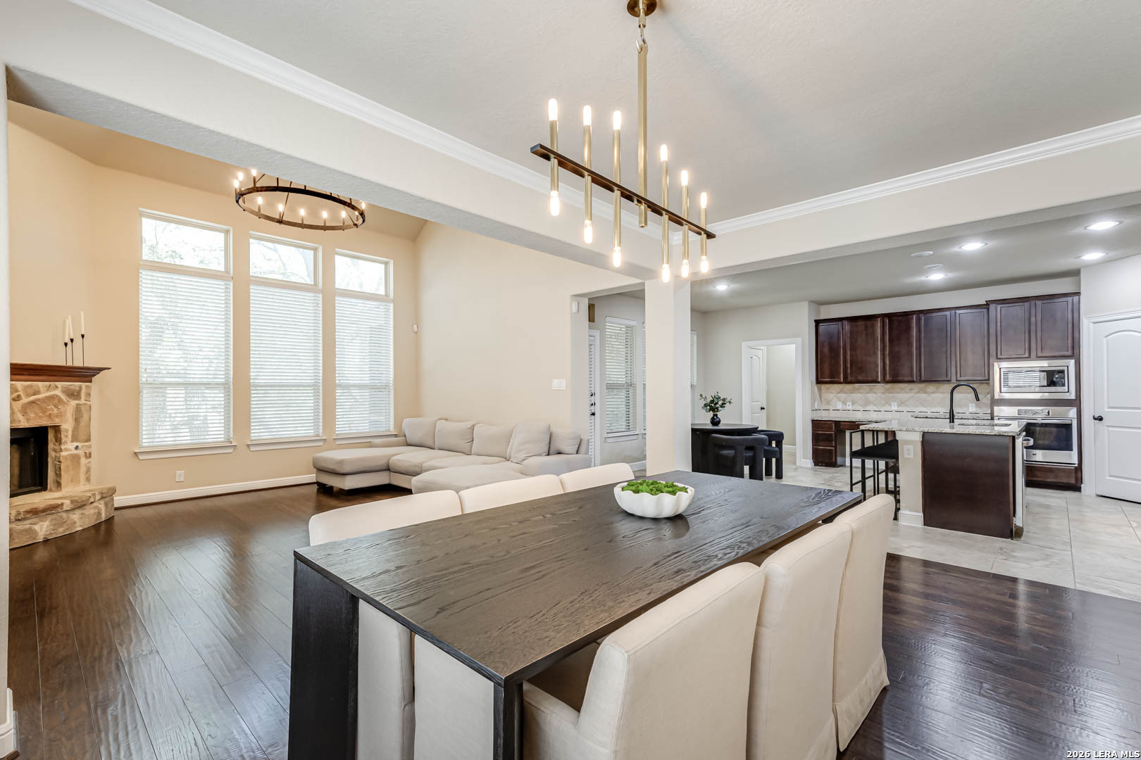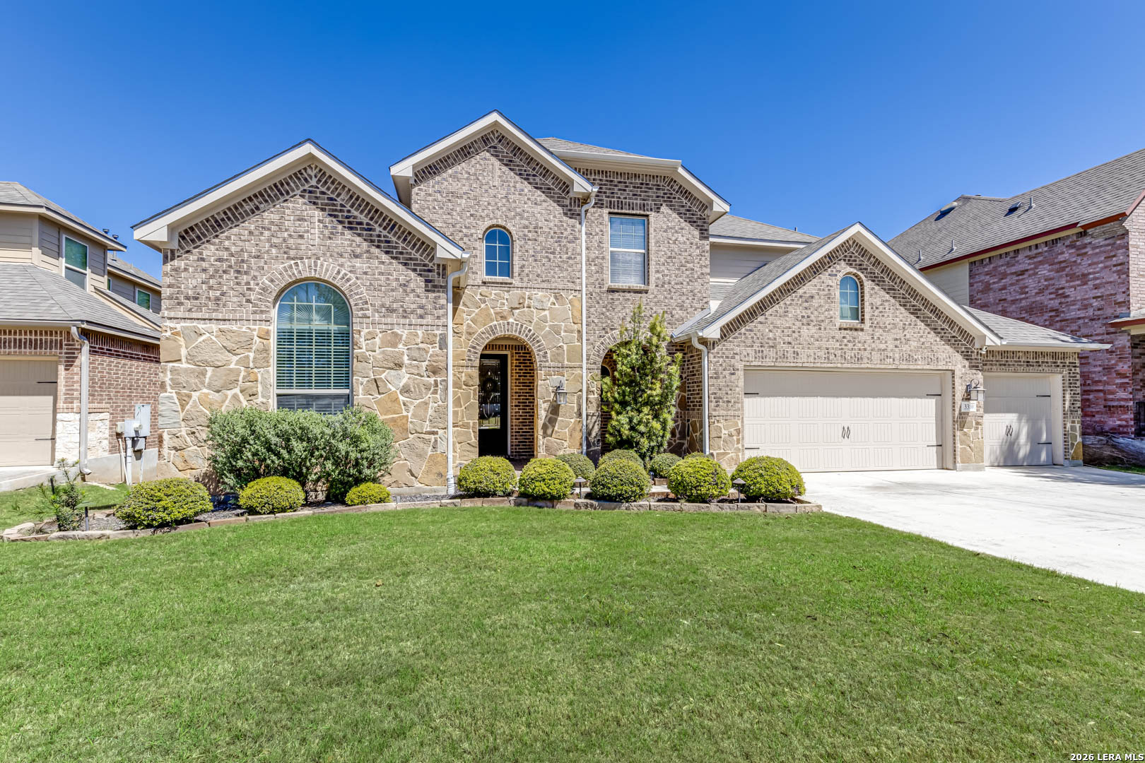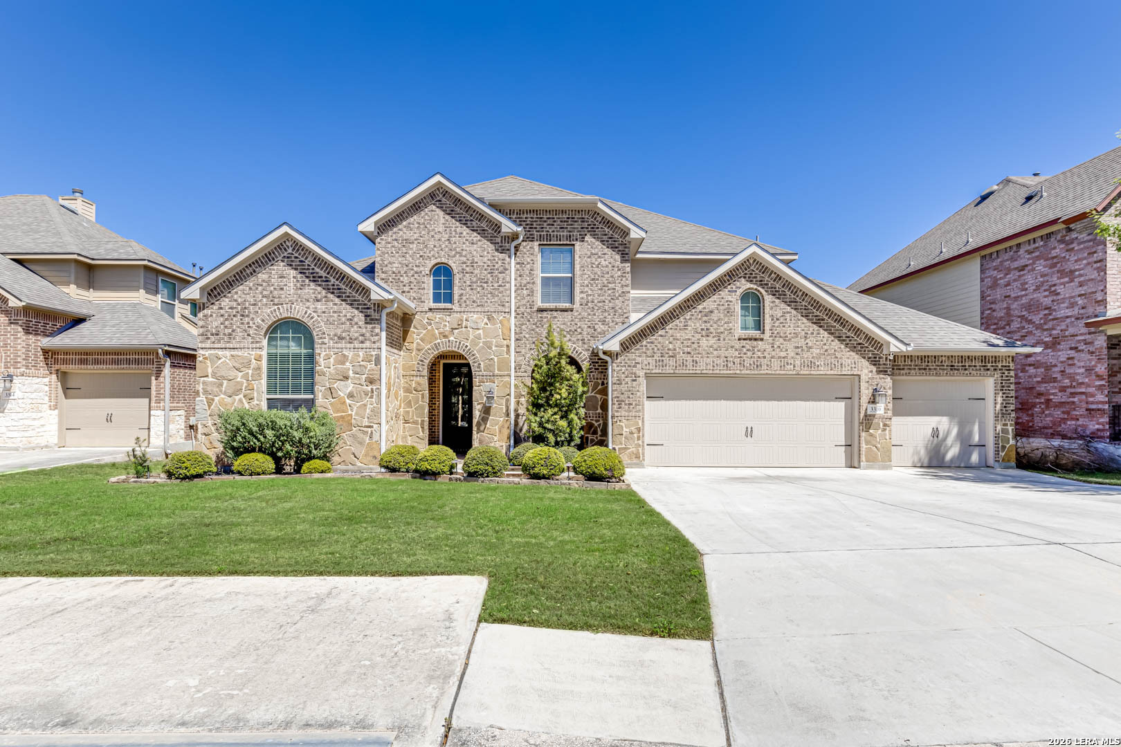 Welcome to this stunning two-story home nestled in a gated community in the highly sought-after Alamo Ranch! This beautifully designed home boasts 4 spacious bedrooms, 3.5 bathrooms, 3 living spaces, and a 3-car garage, the perfect blend of comfort, style, and functionality. Step inside to an impressive open floor plan highlighted by soaring 18-foot ceilings and abundant natural light. The main living areas feature gorgeous wood flooring, complemented by tile in wet areas and plush carpet in all bedrooms. A dedicated office/study provides the ideal space for working from home, while the media/theater room with surround sound offers endless possibilities for relaxation and entertainment. The gourmet kitchen is truly the heart of the home, showcasing an oversized island, stainless steel appliances, gas cooking, custom tile backsplash, and ample space for gathering, perfect for hosting family and friends. The luxurious primary suite is conveniently located on the first floor and features a spa-like bathroom with dual vanities, a garden tub, separate shower, and a spacious walk-in closet. Upstairs, you'll find the loft area, theater room, and three additional bedrooms, including one with a private ensuite bathroom. Situated on a large lot, the outdoor space is just as impressive with a covered patio, mature trees enhanced by elegant lighting, and a beautifully landscaped yard complete with a sprinkler system, creating exceptional curb appeal. Additional highlights include updated interior lighting, ceiling fans, bathroom fixtures, a water softener system, and a NEMA 14-50 EV charging outlet in the garage for modern convenience. Zoned to highly rated, award-winning schools, this home truly has it all. Quick 10-minute drive to shopping, dining, Costco, and HEB Plus! Close proximity to major highways, UT Health Science Center, Southwest Research Institute, Toyota Manufacturing, Port San Antonio, USAA, and Lackland AFB!! You will LOVE this home. Schedule your showing today!