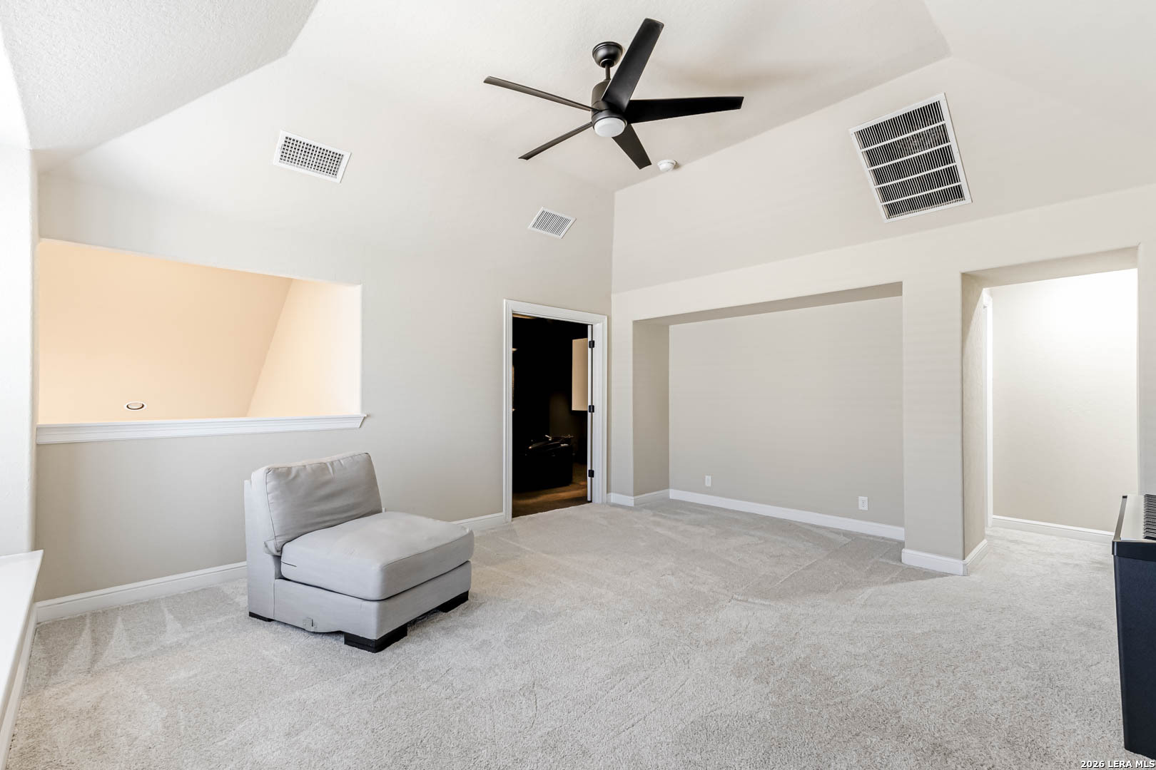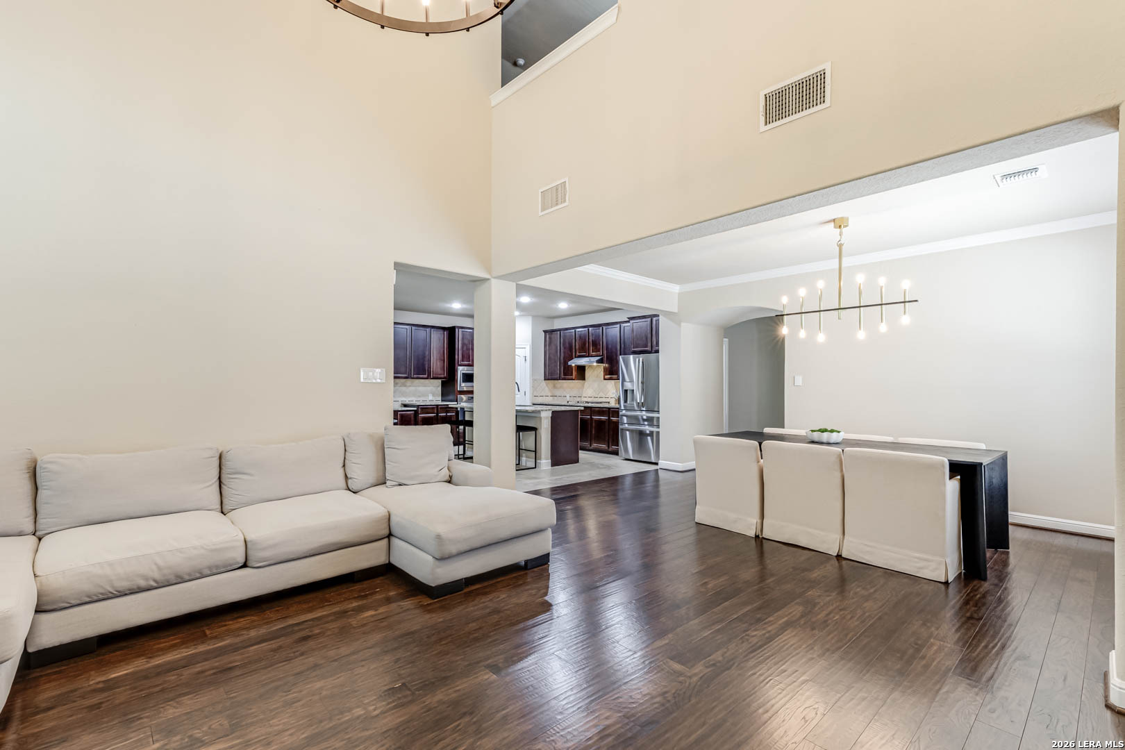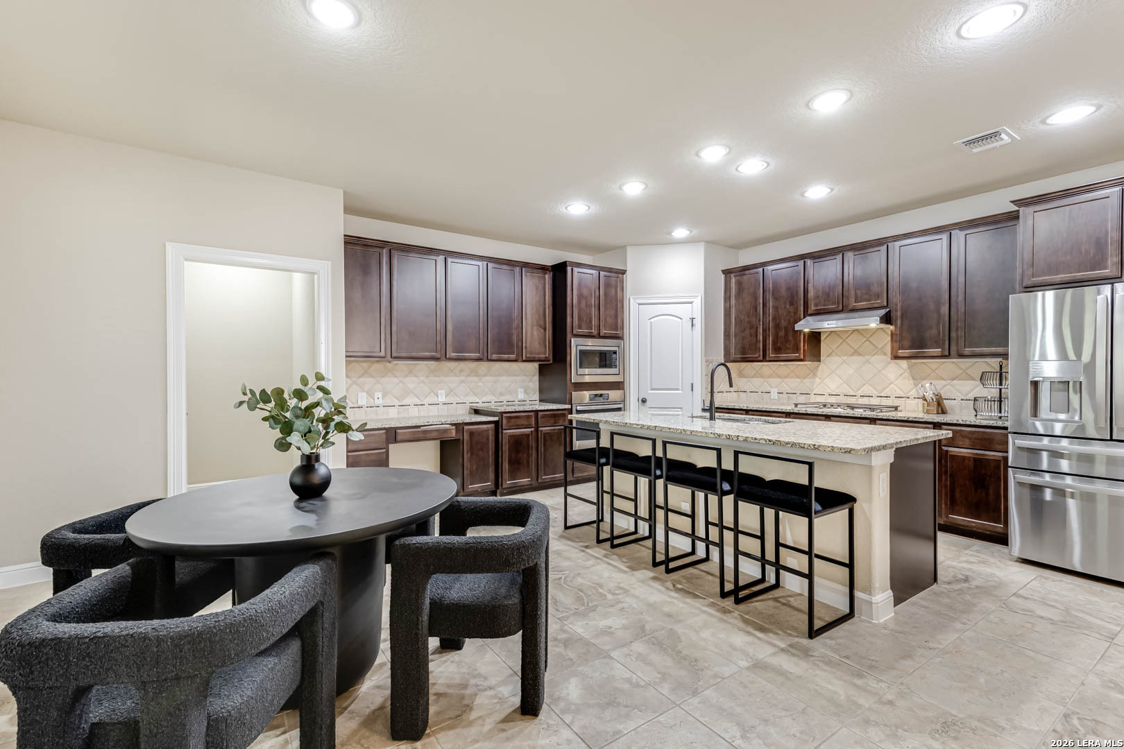 Welcome to this stunning two-story home nestled in a gated community in the highly sought-after Alamo Ranch! This beautifully designed home boasts 4 spacious bedrooms, 3.5 bathrooms, 3 living spaces, and a 3-car garage, the perfect blend of comfort, style, and functionality. Step inside to an impressive open floor plan highlighted by soaring 18-foot ceilings and abundant natural light. The main living areas feature gorgeous wood flooring, complemented by tile in wet areas and plush carpet in all bedrooms. A dedicated office/study provides the ideal space for working from home, while the media/theater room with surround sound offers endless possibilities for relaxation and entertainment. The gourmet kitchen is truly the heart of the home, showcasing an oversized island, stainless steel appliances, gas cooking, custom tile backsplash, and ample space for gathering, perfect for hosting family and friends. The luxurious primary suite is conveniently located on the first floor and features a spa-like bathroom with dual vanities, a garden tub, separate shower, and a spacious walk-in closet. Upstairs, you'll find the loft area, theater room, and three additional bedrooms, including one with a private ensuite bathroom. Situated on a large lot, the outdoor space is just as impressive with a covered patio, mature trees enhanced by elegant lighting, and a beautifully landscaped yard complete with a sprinkler system, creating exceptional curb appeal. Additional highlights include updated interior lighting, ceiling fans, bathroom fixtures, a water softener system, and a NEMA 14-50 EV charging outlet in the garage for modern convenience. Zoned to highly rated, award-winning schools, this home truly has it all. Quick 10-minute drive to shopping, dining, Costco, and HEB Plus! Close proximity to major highways, UT Health Science Center, Southwest Research Institute, Toyota Manufacturing, Port San Antonio, USAA, and Lackland AFB!! You will LOVE this home. Schedule your showing today!
