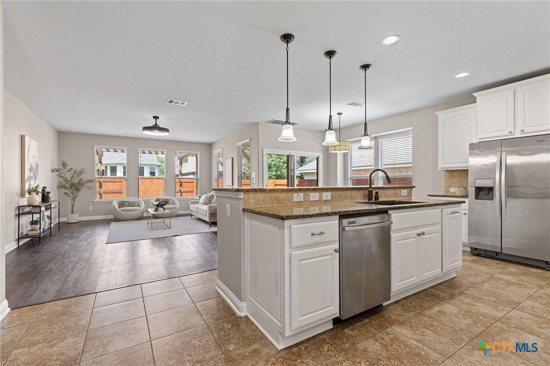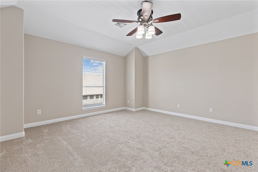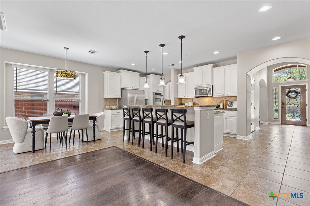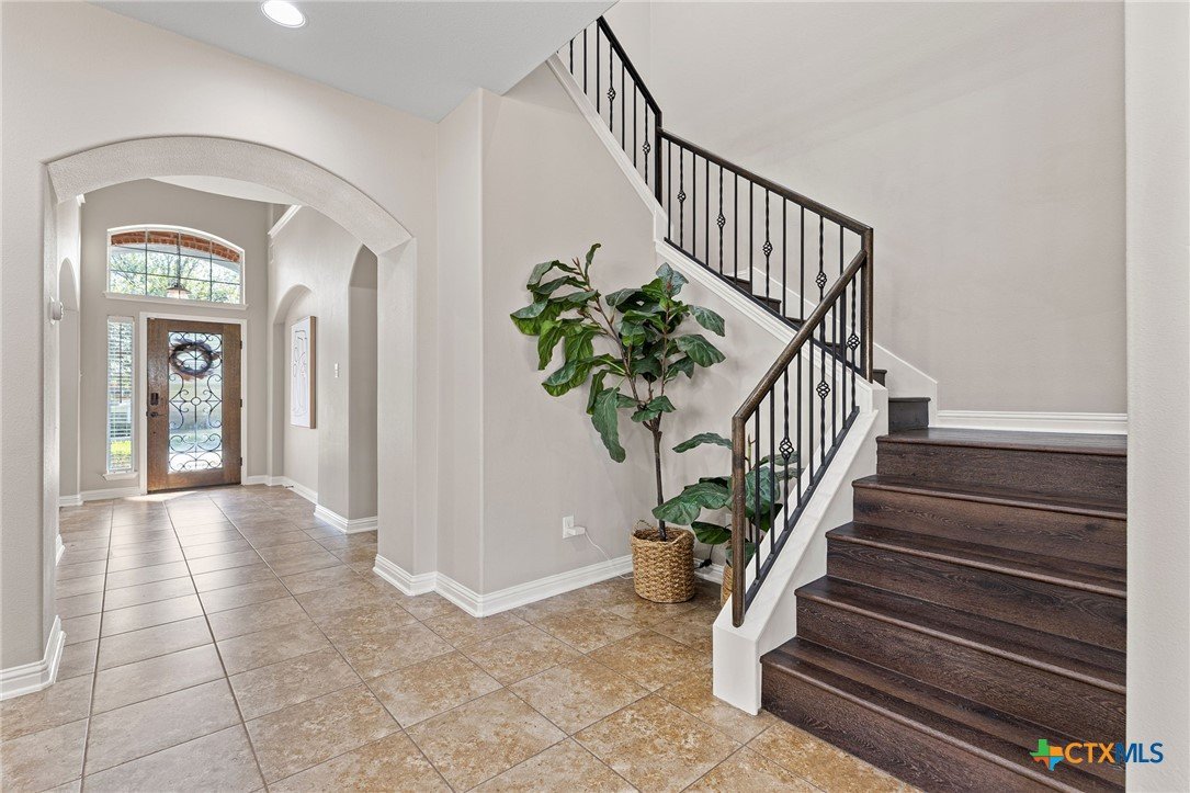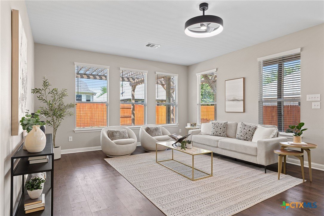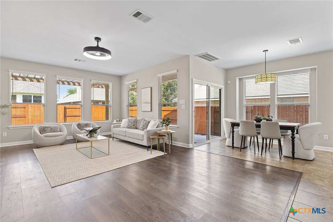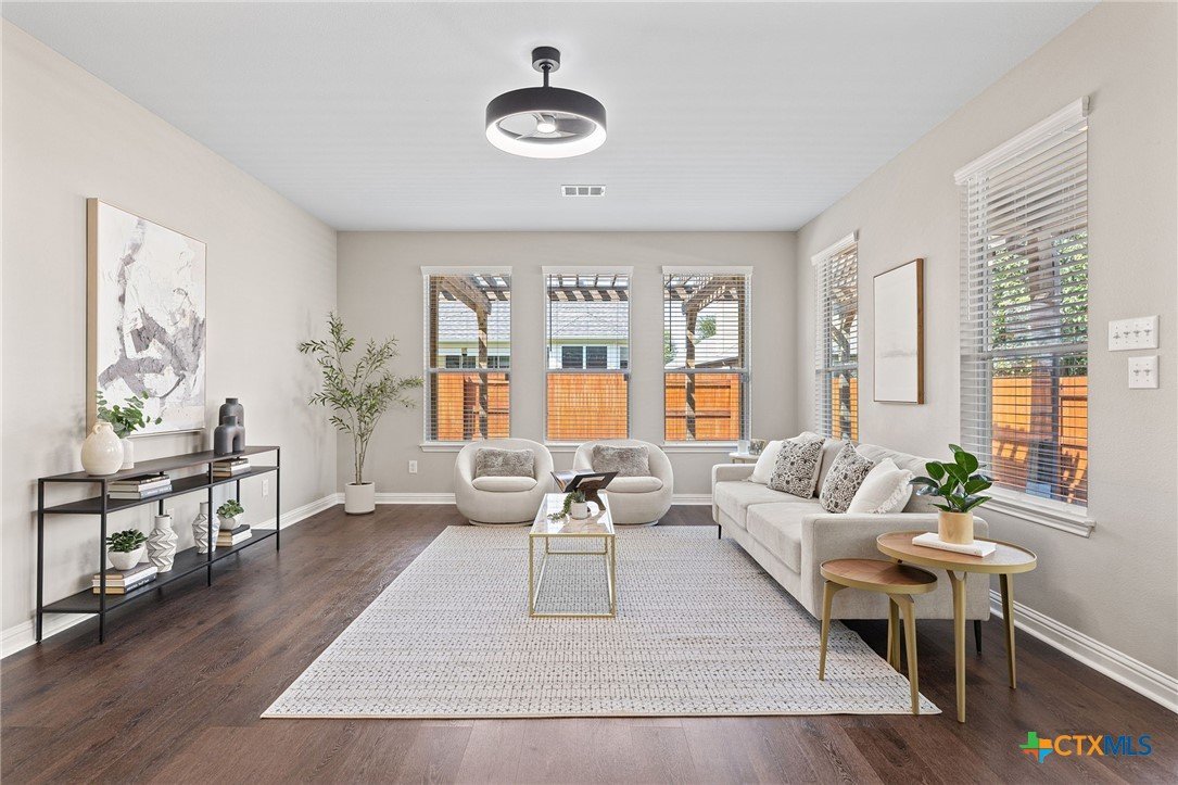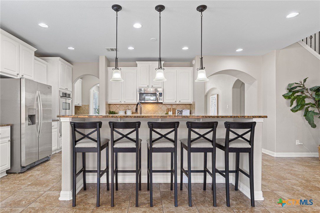Your stunning executive-style home welcomes you with its elegant features and spacious layout. As you enter, you are greeted by the inviting front flex room, perfect for a dining room or office space. The great room offers a backyard view, complete with an extended pergola covering an extra-large patio space, which is excellent for outdoor relaxation and entertaining. The kitchen is a chef's delight, boasting beautiful ivory cabinets, a double oven for culinary convenience, a generous breakfast bar for casual dining, and built-in stainless-steel appliances that add a modern touch. Additional amenities include a butler's pantry for seamless entertaining and a large walk-in pantry for ample storage space. The primary suite is a true retreat, with a spa-like bath featuring a huge walk-in closet with built-in cabinetry, ensuring ample storage and an oversized shower. Also, downstairs is a second bedroom and complete bathroom that offer added convenience for guests. Upstairs is a spacious game room with newly installed luxury vinyl plank flooring that provides plenty of space for recreational activities. There are three freshly carpeted bedrooms and two bathrooms. One of the second-floor bedrooms is large enough to function as a second primary bedroom or media room for multigenerational living needs. A fourth bedroom with beautiful wood floors can double as an elegant office. Overall, this home combines functional flexibility with elegance, offering multiple living spaces and luxurious amenities catering to daily living and entertaining guests. Less than a one-minute drive to lakeside amenities: fishing pond, pickleball court, two parks/playgrounds, splash pad, bi-level pool, community center, and trailhead to nearly five miles of trails around the lake & creek. Less than a 10-minute drive to Toll Road 130 with further easy access to Toll Road 45 and I-35, and less than 15 minutes from shopping and dining in the University Oaks and Hutto areas!