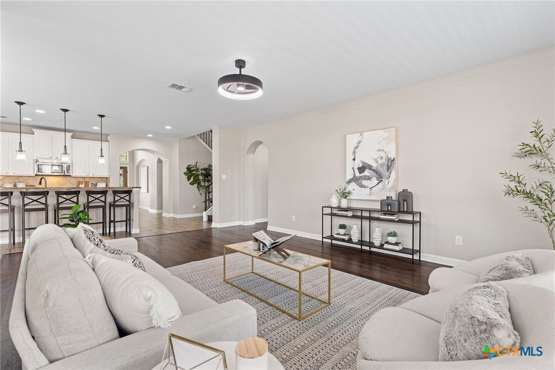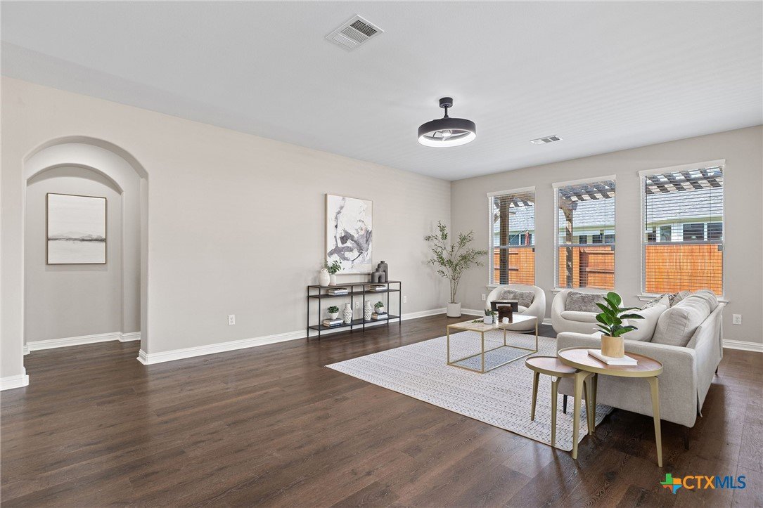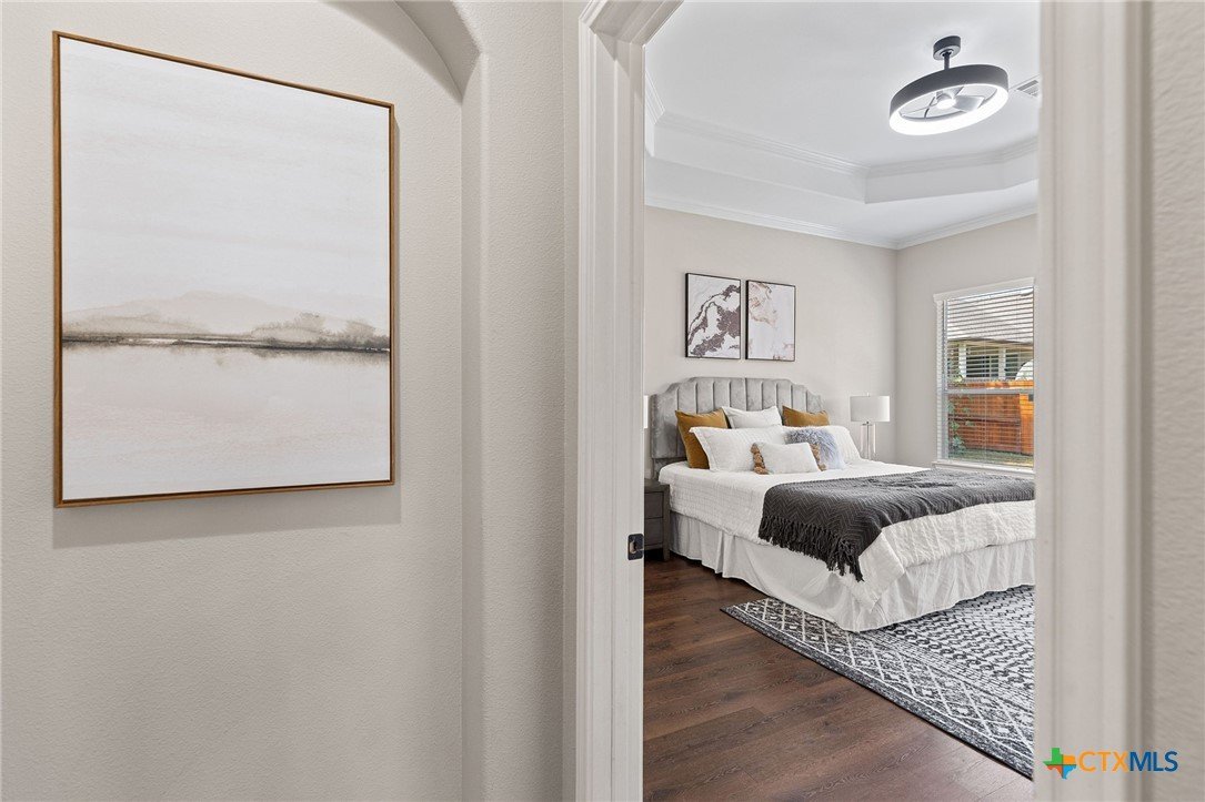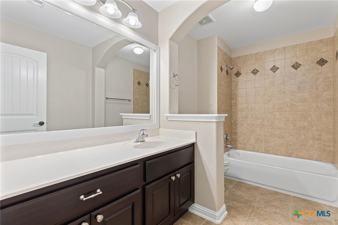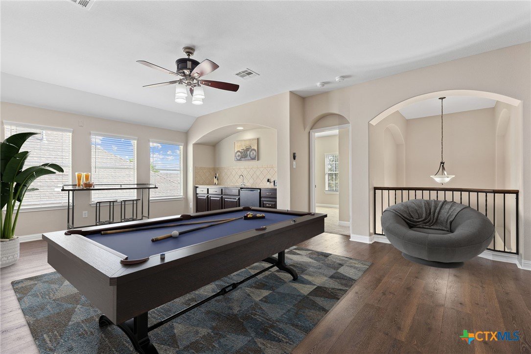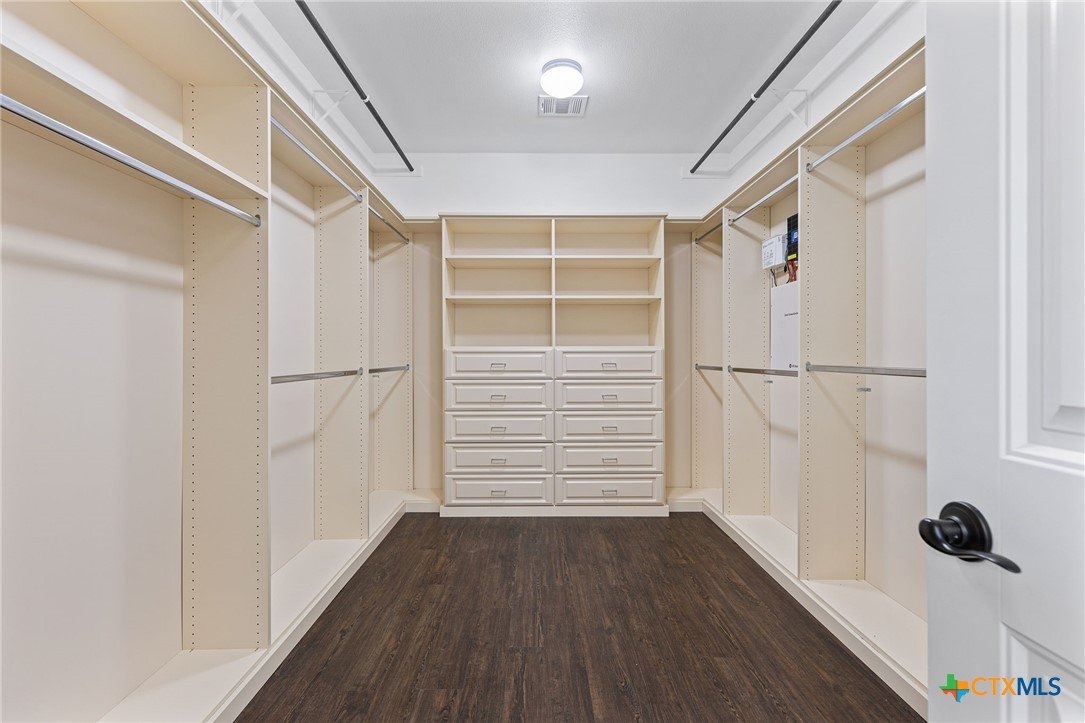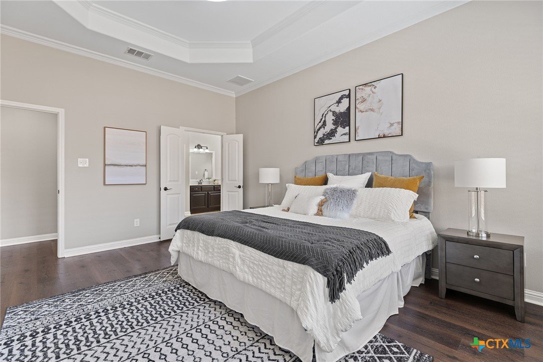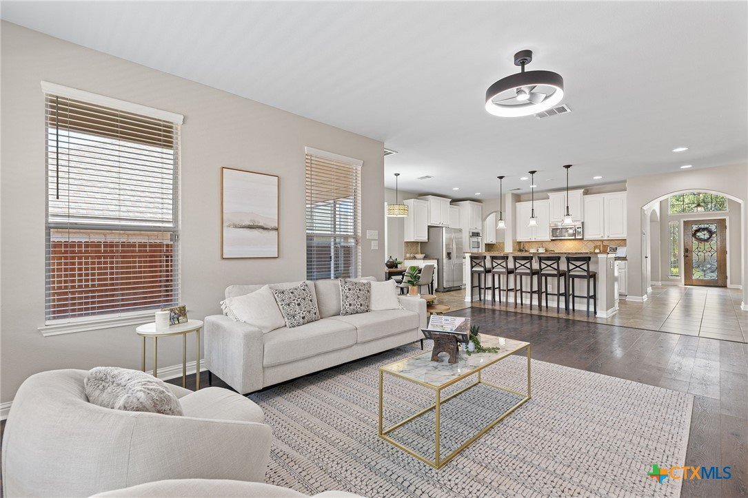 Your stunning executive-style home welcomes you with its elegant features and spacious layout. As you enter, you are greeted by the inviting front flex room, perfect for a dining room or office space. The great room offers a backyard view, complete with an extended pergola covering an extra-large patio space, which is excellent for outdoor relaxation and entertaining. The kitchen is a chef's delight, boasting beautiful ivory cabinets, a double oven for culinary convenience, a generous breakfast bar for casual dining, and built-in stainless-steel appliances that add a modern touch. Additional amenities include a butler's pantry for seamless entertaining and a large walk-in pantry for ample storage space. The primary suite is a true retreat, with a spa-like bath featuring a huge walk-in closet with built-in cabinetry, ensuring ample storage and an oversized shower. Also, downstairs is a second bedroom and complete bathroom that offer added convenience for guests. Upstairs is a spacious game room with newly installed luxury vinyl plank flooring that provides plenty of space for recreational activities. There are three freshly carpeted bedrooms and two bathrooms. One of the second-floor bedrooms is large enough to function as a second primary bedroom or media room for multigenerational living needs. A fourth bedroom with beautiful wood floors can double as an elegant office. Overall, this home combines functional flexibility with elegance, offering multiple living spaces and luxurious amenities catering to daily living and entertaining guests. Less than a one-minute drive to lakeside amenities: fishing pond, pickleball court, two parks/playgrounds, splash pad, bi-level pool, community center, and trailhead to nearly five miles of trails around the lake & creek. Less than a 10-minute drive to Toll Road 130 with further easy access to Toll Road 45 and I-35, and less than 15 minutes from shopping and dining in the University Oaks and Hutto areas!