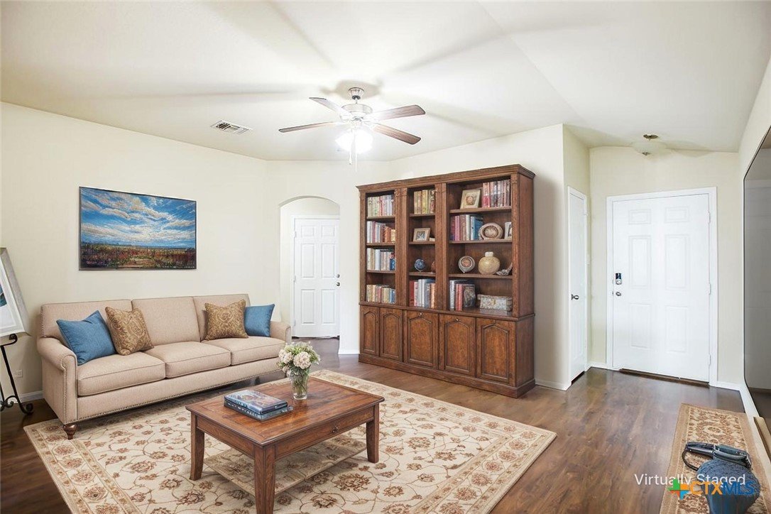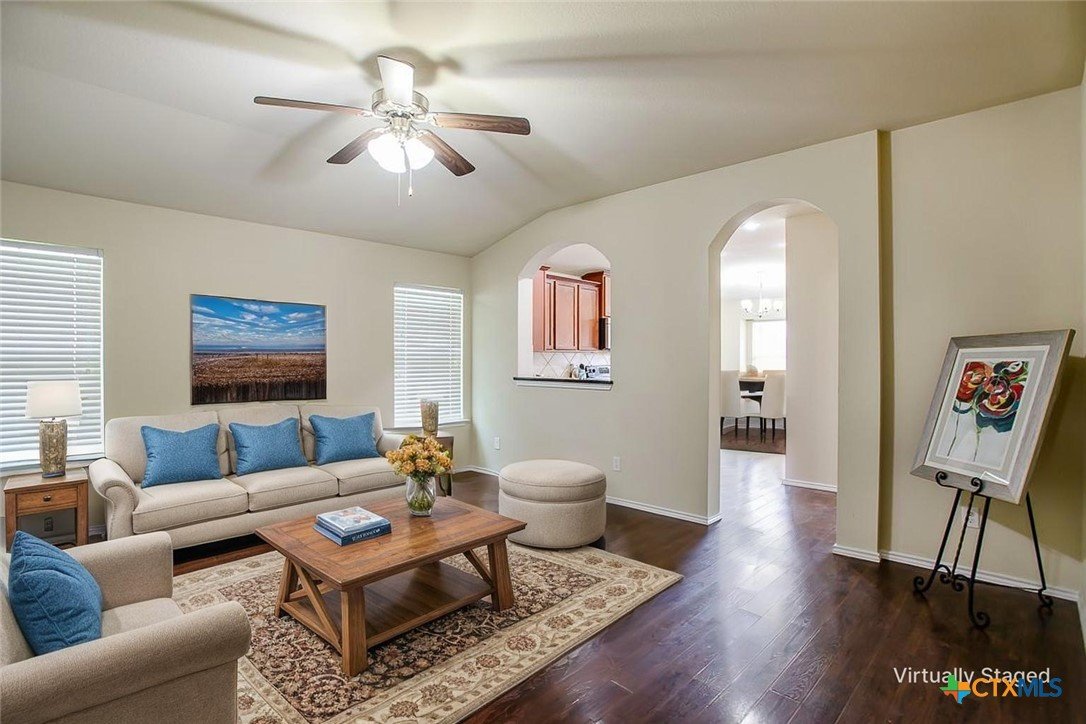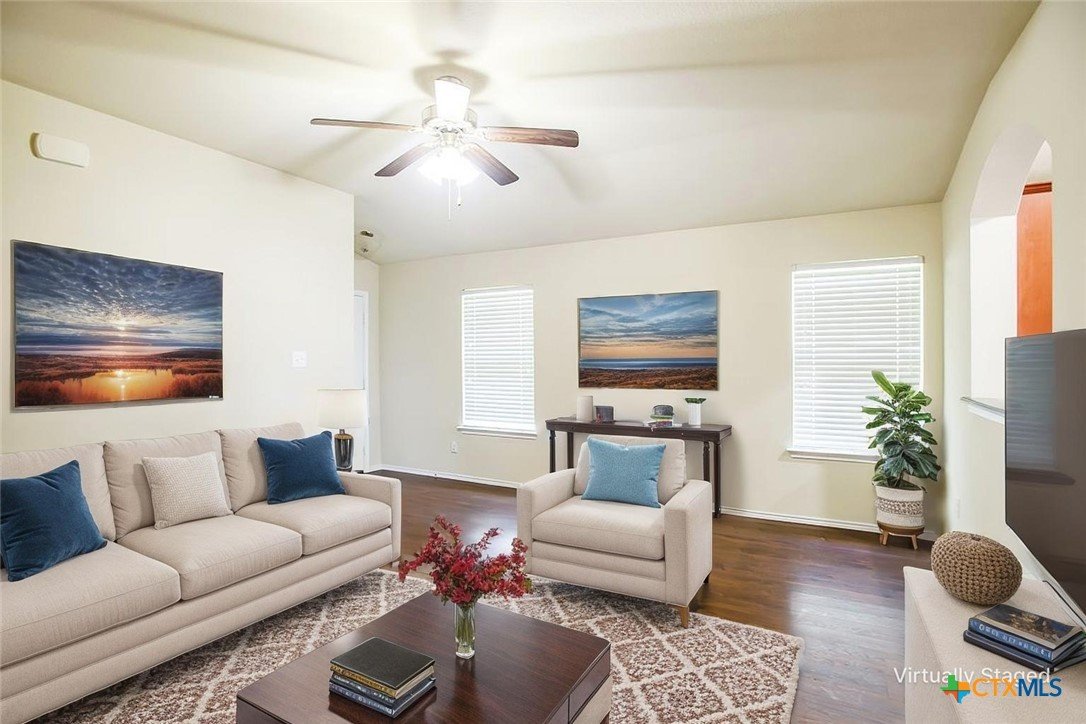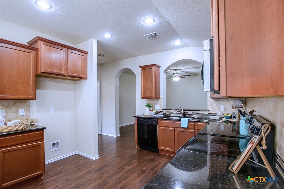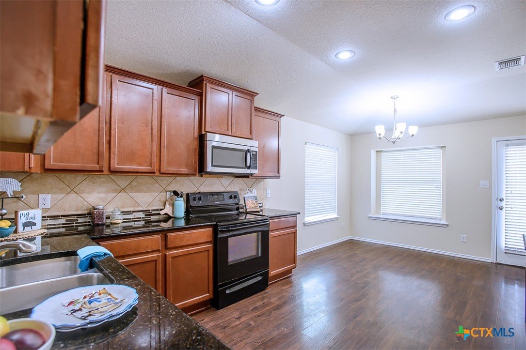 A welcoming shade tree and inviting front porch set the tone for this beautifully updated home, where comfort and style come together effortlessly. Inside, the spacious great room features a high ceiling and rich wood-look tile floors that flow into the open kitchen—complete with granite countertops, abundant cabinetry, and a convenient adjoining dining area. The owner’s suite offers a peaceful retreat with a high ceiling, relaxing soaking tub, separate shower, and a walk-in closet enhanced with built-ins for easy organization. Fresh paint throughout and new carpet in the bedrooms give this home a crisp, move-in-ready feel. Step outside to enjoy a large backyard with a covered patio—perfect for morning coffee, entertaining, or simply unwinding outdoors. Thoughtfully maintained and ready for its next chapter, this home is the perfect blend of comfort, function, and charm.