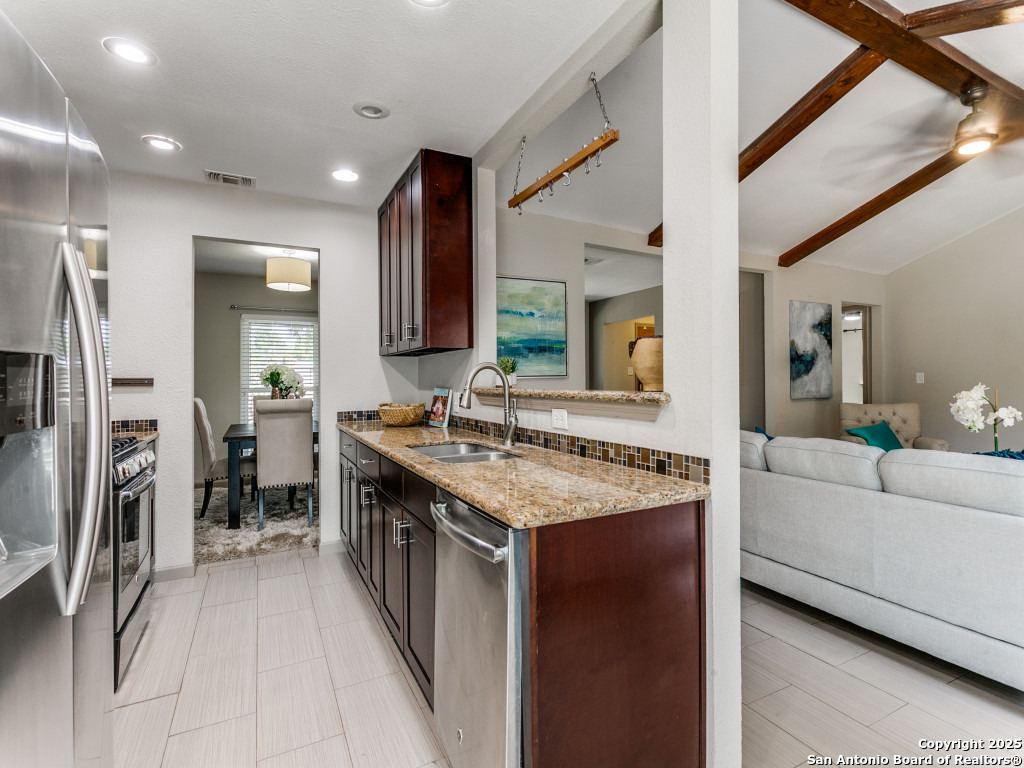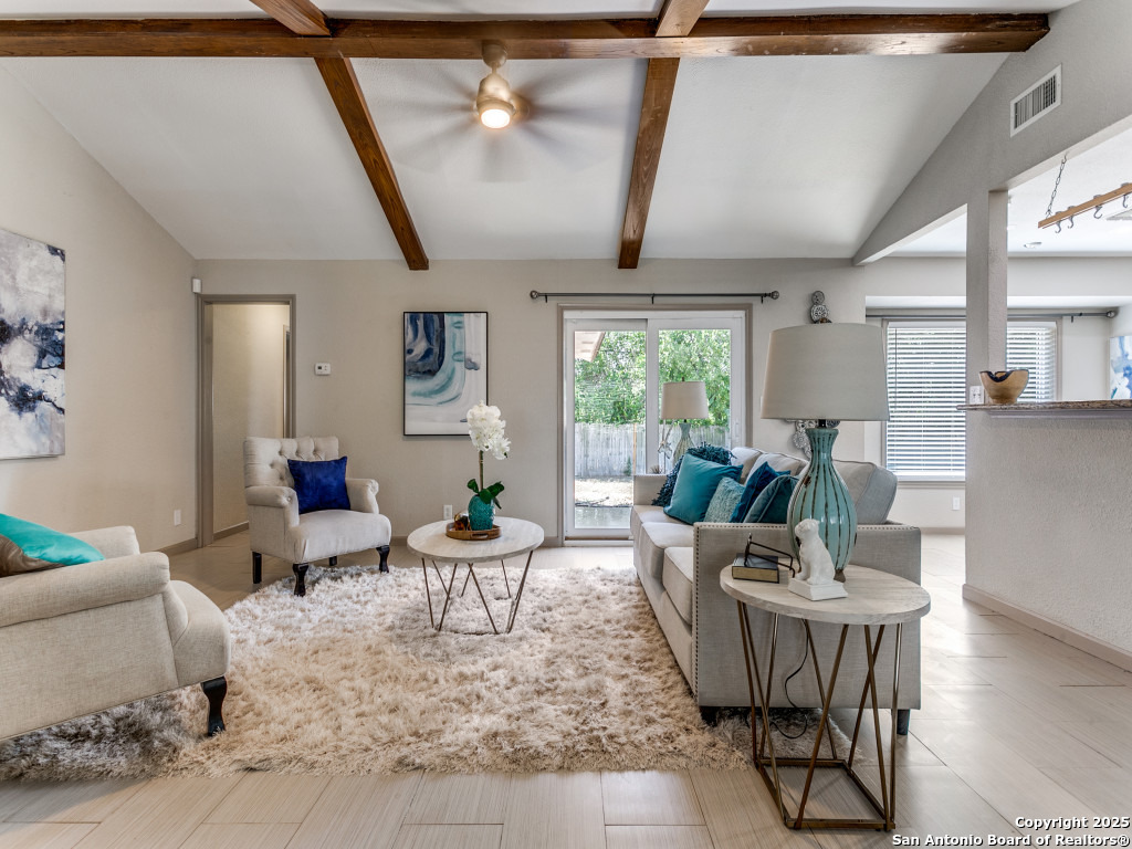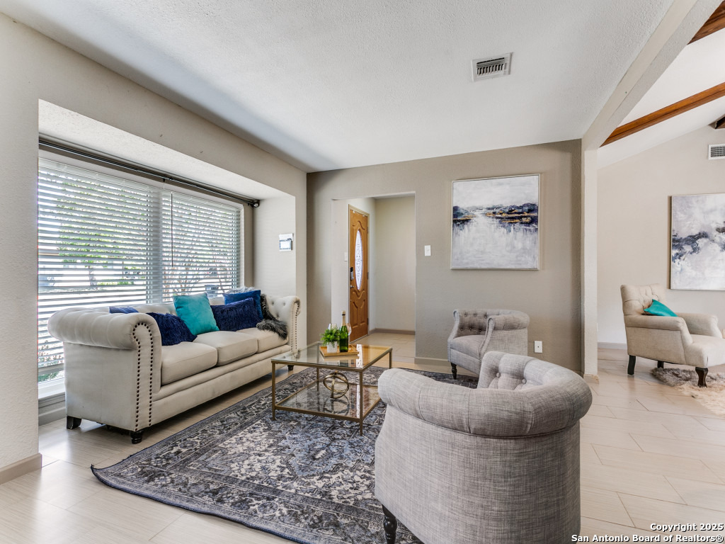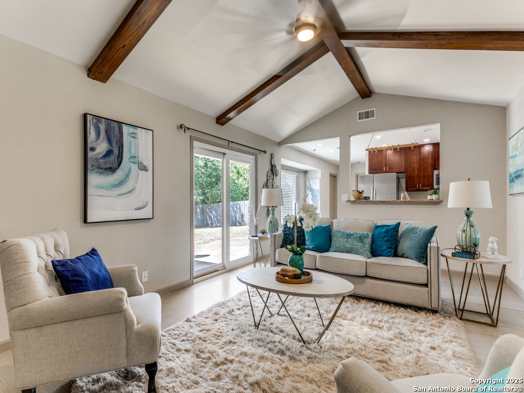 Updated to perfection! The leaded glass entry door welcomes you at the covered porch. Two large windows in living let the sun fill the room with natural light. The vaulted ceiling with wood beams in the living space draws your eyes upward. You will enjoy the ceramic tile flooring throughout for its beauty and easy care. The chef's kitchen features rich granite counters, glass backsplash and gas cooking. All appliances are stainless steel. The primary bedroom is a nice size and the ensuite bath is terrific! The primary bath offers a walk in shower with a special "rain" shower head plus a hand held spray attachment. Both baths have been updated with ceramic tile and fixtures. The secondary bath has a tub. The lot features mature trees, a large patio and a privacy fence. A sprinkler system is in place. Four sides brick.