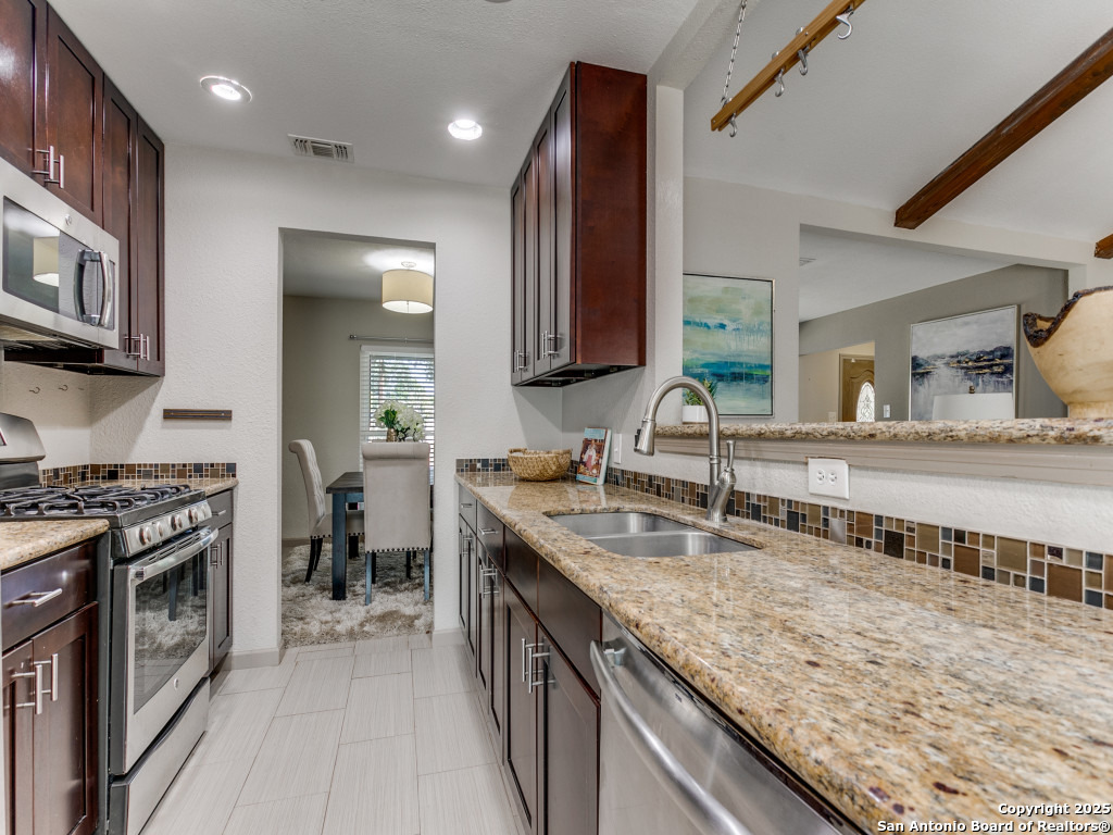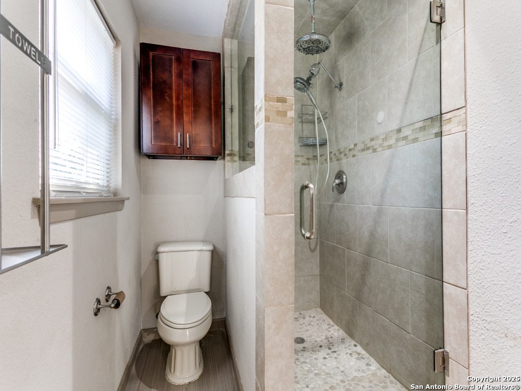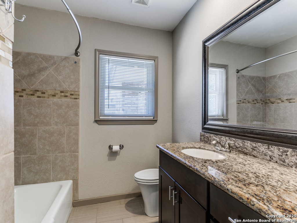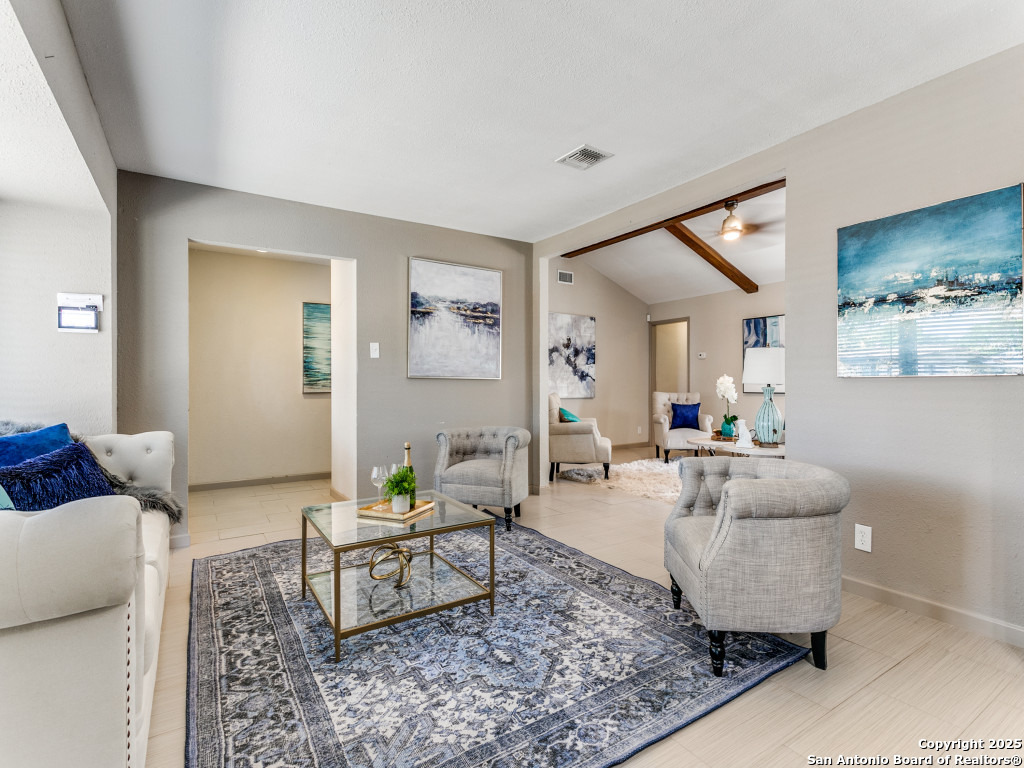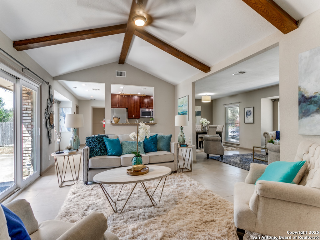 Updated to perfection! The leaded glass entry door welcomes you at the covered porch. Two large windows in living let the sun fill the room with natural light. The vaulted ceiling with wood beams in the living space draws your eyes upward. You will enjoy the ceramic tile flooring throughout for its beauty and easy care. The chef's kitchen features rich granite counters, glass backsplash and gas cooking. All appliances are stainless steel. The primary bedroom is a nice size and the ensuite bath is terrific! The primary bath offers a walk in shower with a special "rain" shower head plus a hand held spray attachment. Both baths have been updated with ceramic tile and fixtures. The secondary bath has a tub. The lot features mature trees, a large patio and a privacy fence. A sprinkler system is in place. Four sides brick.