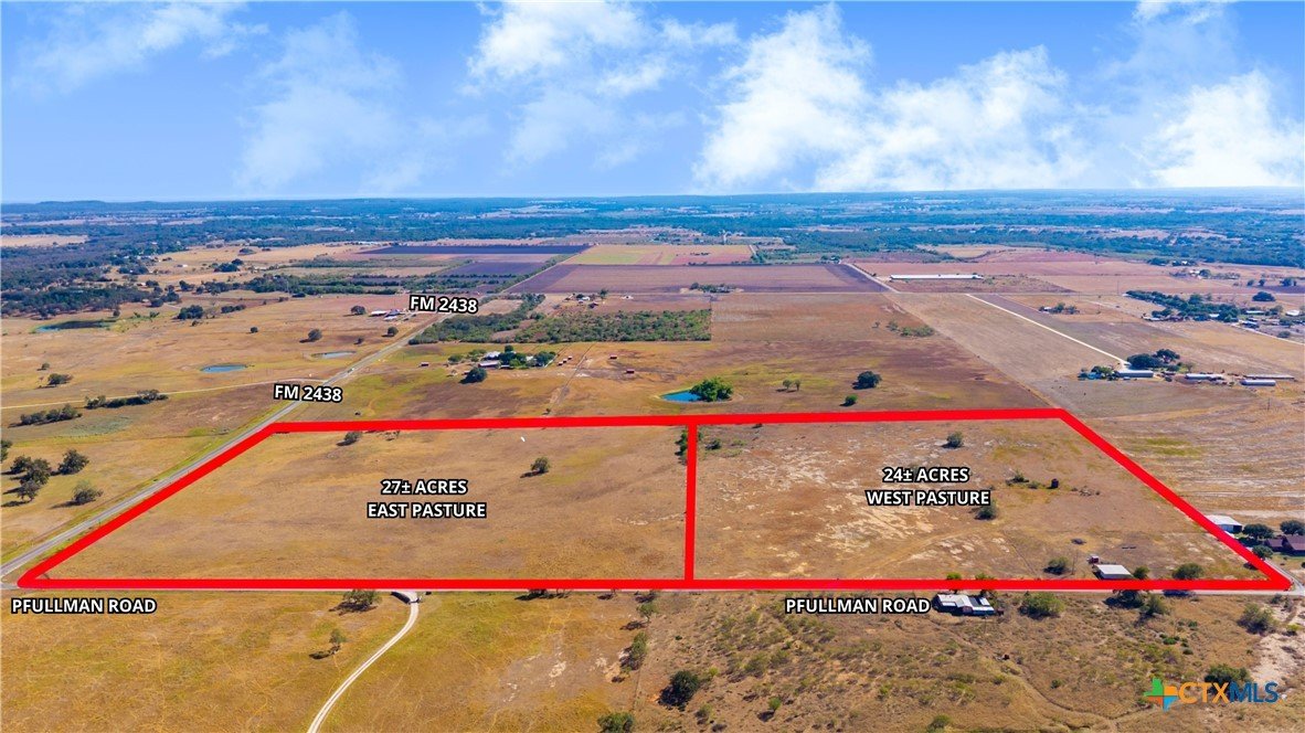 DESCRIPTION: The Pfullman Rd East Pasture offers 27 ± acres of open pastureland with exceptional road frontage off both Pfullman Road and Farm-to-Market Road 2438, providing excellent visibility and accessibility. Its layout and location make it suitable for future subdivision, residential, or agricultural use, and it holds strong potential for long-term development or investment. The property features gently rolling grassland ideal for building sites, small ranch operations, or continued hay production. With its strategic location and ample frontage, this tract could easily transition into a residential ranchette community or serve as a prime landholding for future appreciation. LOCATION: Located just outside the city limits of Seguin, this tract offers 1,063 feet of frontage along Pfullman Road and 1,005 feet of frontage along FM 2438, providing multiple access points and excellent visibility. The property is conveniently located near the big cities of San Antonio and Austin, making it a great candidate for future development or investment. TERRAIN: The land is mostly level to gently sloping with elevations between 440 and 460 feet and consists primarily of open pasture with a few scattered trees, ideal for grazing or potential development. IMPROVEMENTS: The East Pasture is unimproved, offering a blank slate for future projects or agricultural expansion. WATER: This 27 +/- acres lies above the Carrizo-Wilcox Aquifer, a well-known and dependable groundwater source in the region. Nearby wells on adjoining properties typically range from 180 to 220 feet deep with strong yields averaging 25–35 gallons per minute, indicating good water availability for future residential or agricultural use. WILDLIFE: Native species such as deer, dove, and small game are occasionally observed in the area. MINERALS: Some minerals will convey with an acceptable offer. Exact mineral interest to be verified and negotiated at the time of sale.