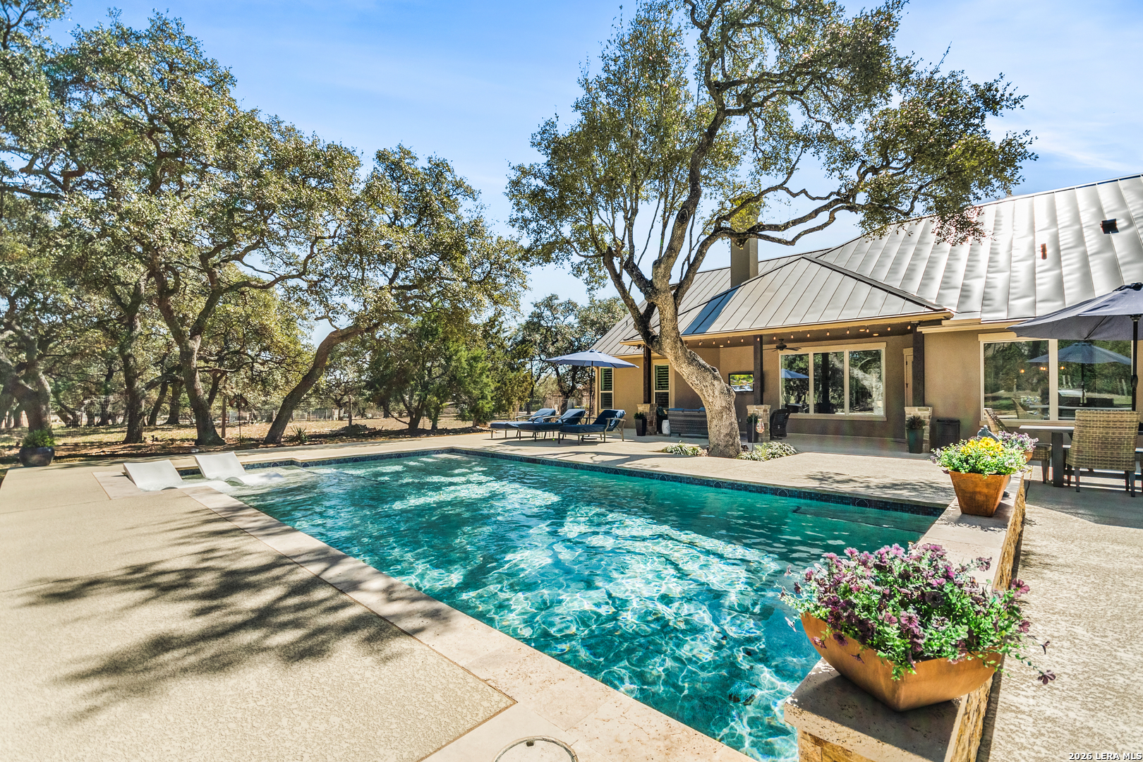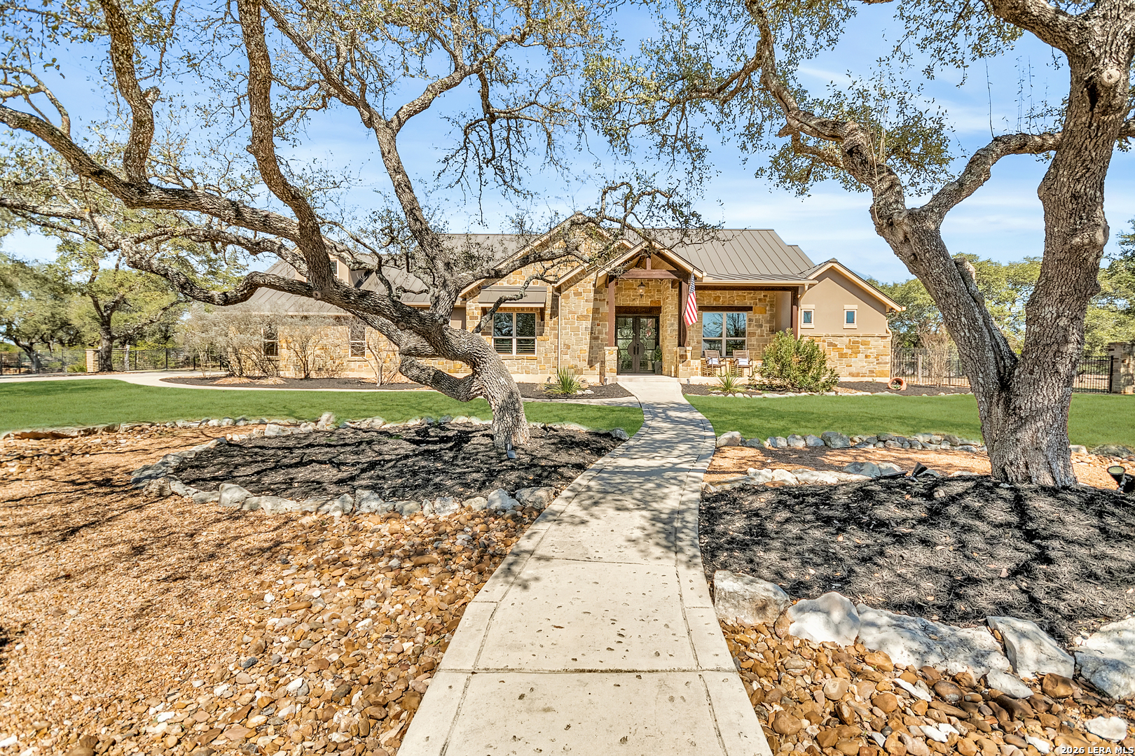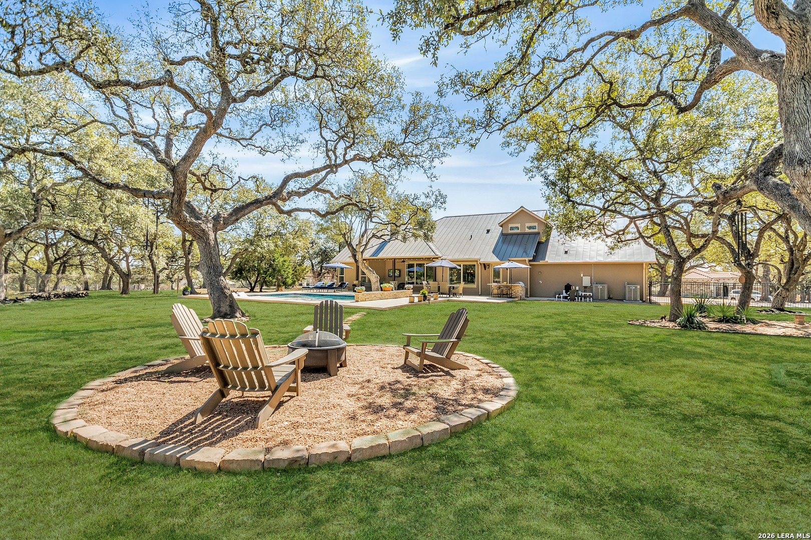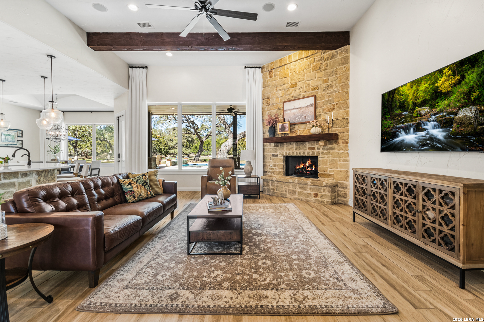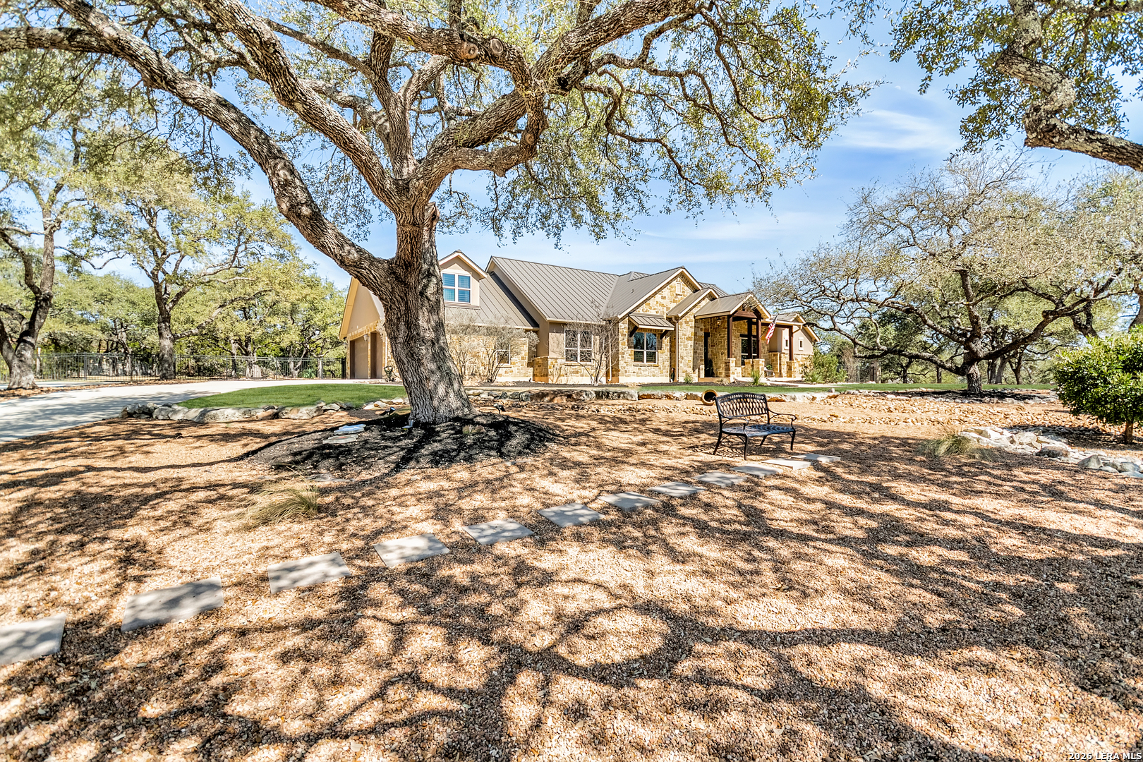 Welcome to this custom 1.5-story home in the gated community of Stone Creek Ranch. This updated residence sits on a private 1.06-acre lot and offers 4 bedrooms and 4 full bathrooms across 3,378 square feet of living space. Built in 2012, the home balances functional living with outdoor enjoyment. Custom glass front doors welcome you to an airy floor plan with porcelain wood-look tile, soaring ceilings, wood beam accents, and a floor-to-ceiling remote stone gas fireplace. The living and dining areas are lined with windows overlooking the backyard and pool, bringing in natural light and Hill Country views. The kitchen has been upgraded with new countertops, sink, and a Bosch oven, and features stainless steel appliances, gas cooking, a center island, a walk-in pantry, a breakfast bar, and a dedicated dining space. A private office near the entry can serve as a fourth bedroom with its own closet. Two secondary bedrooms each include walk-in closets and en suite baths, and a full bath near the kitchen provides convenient access for guests and also serves as a pool bath. The split primary suite is a true retreat with a spacious walk-in closet, dual vanities, an oversized walk-in The split primary suite is a retreat, featuring a spacious walk-in closet, dual vanities, an oversized walk-in shower, and a private flex room, ideal for a home gym, dressing room, or bonus space. Upstairs offers flex space, perfect for an extra bedroom, office, gym, or media room. Outdoors, the property has been transformed into a private retreat with a custom pool built in 2022 to include OmniLogic App that controls water features and multi colored lights, an outdoor shower, an expanded patio, built-in outdoor kitchen, firepit, and mature landscaping that frames the property and adds privacy. Covered patio space, oak trees, and a fenced yard create a secluded setting for gatherings or quiet evenings under the Texas sky. Additional upgrades include a new metal roof (2024), new HVAC, hot water heater, fence, gas fireplace installed in 2022, leaf gutters, built-in garage overhead storage, and additional storage in the garage, wood shutters, custom drapes, and a kitchen upgrade to include new countertops, sink, and Bosch Oven. Located in the desirable Stone Creek Ranch community, this home affords access to premier neighborhood amenities, including clubhouse facilities, pool, fitness center, jogging trails, playgrounds, and more. Residents enjoy a secure gated environment within close proximity to shopping, dining, and award-winning schools in the Boerne ISD.
