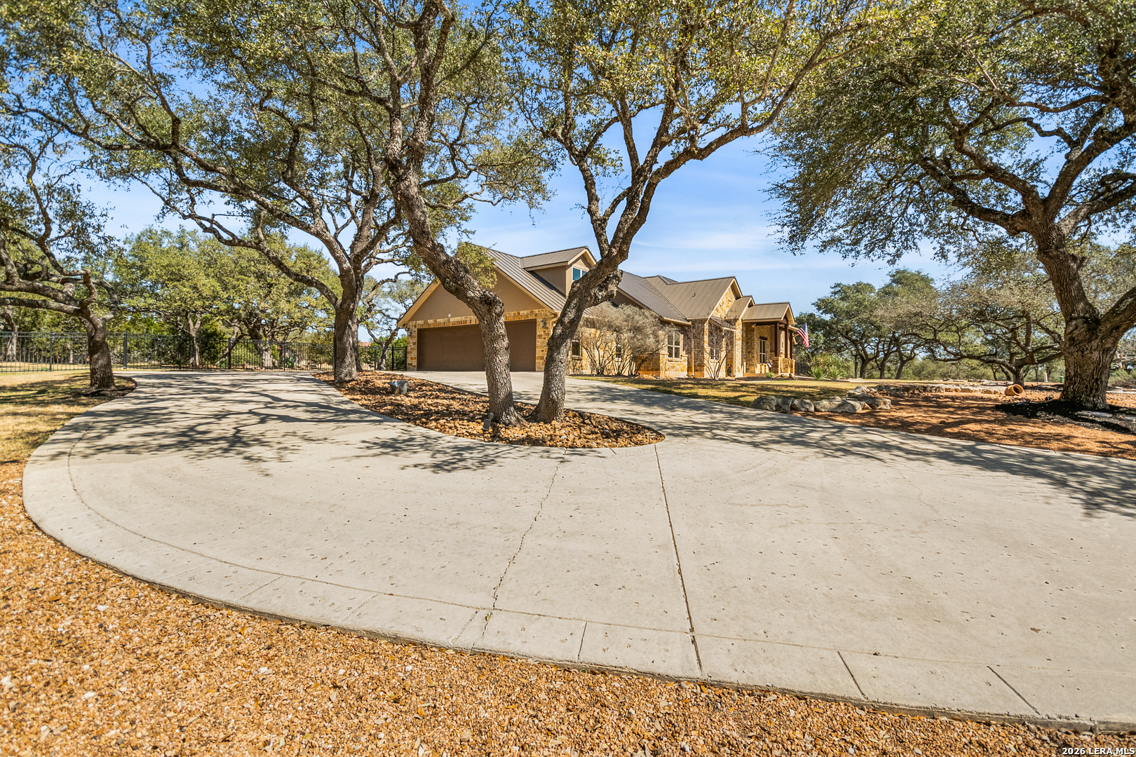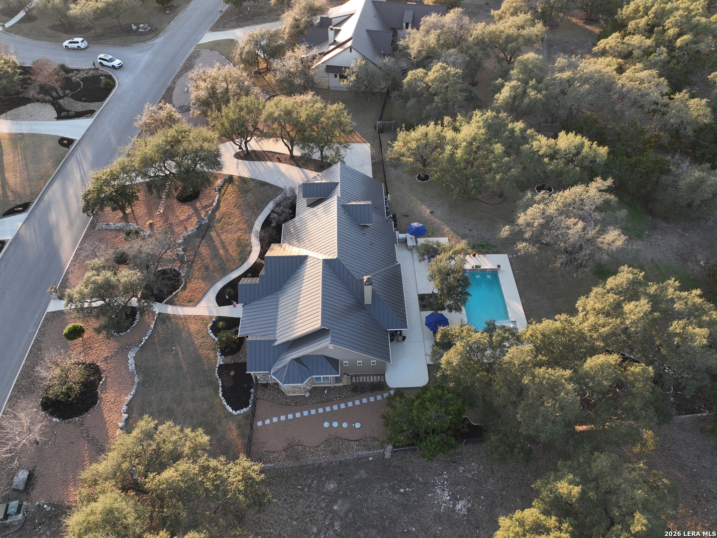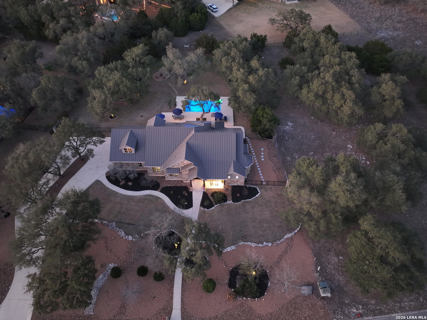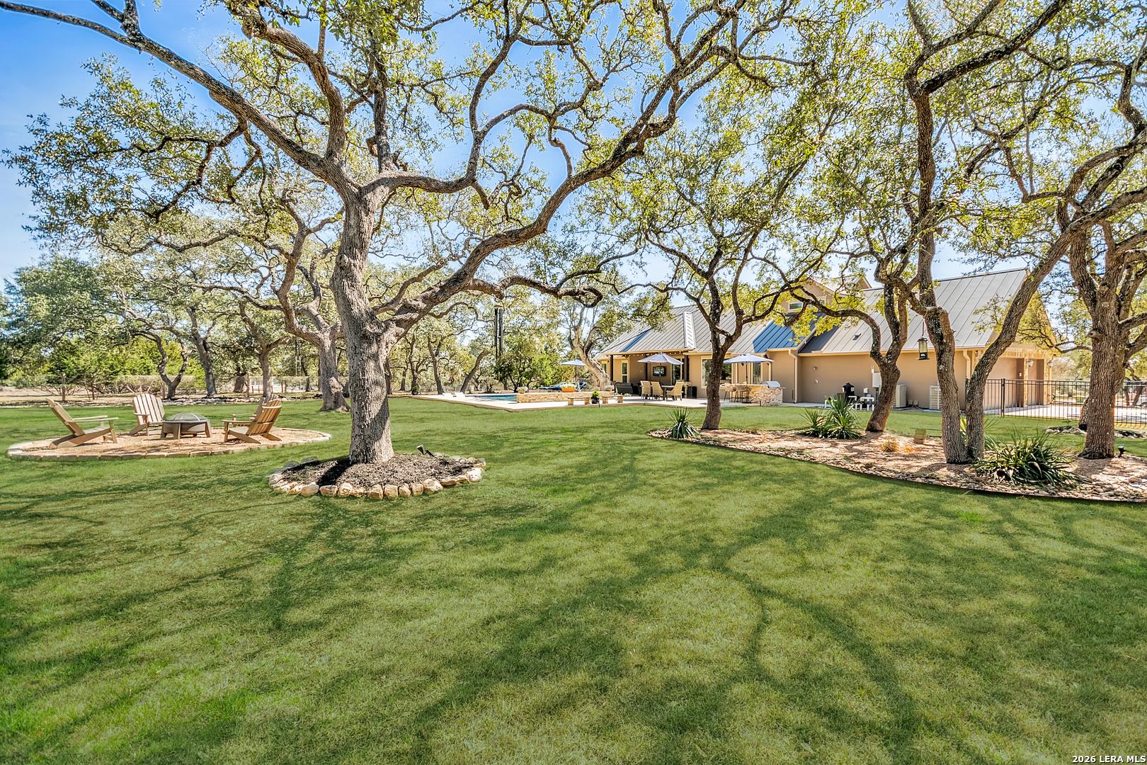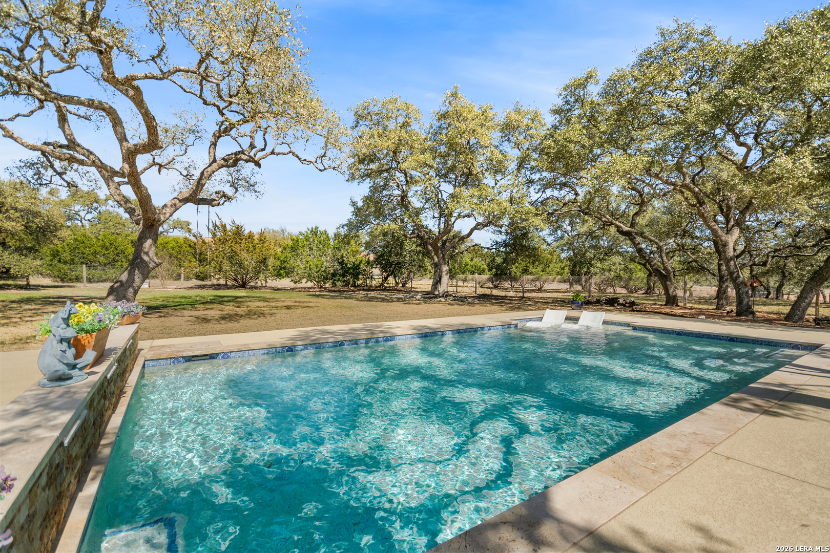 Welcome to this custom 1.5-story home in the gated community of Stone Creek Ranch. This updated residence sits on a private 1.06-acre lot and offers 4 bedrooms and 4 full bathrooms across 3,378 square feet of living space. Built in 2012, the home balances functional living with outdoor enjoyment. Custom glass front doors welcome you to an airy floor plan with porcelain wood-look tile, soaring ceilings, wood beam accents, and a floor-to-ceiling remote stone gas fireplace. The living and dining areas are lined with windows overlooking the backyard and pool, bringing in natural light and Hill Country views. The kitchen has been upgraded with new countertops, sink, and a Bosch oven, and features stainless steel appliances, gas cooking, a center island, a walk-in pantry, a breakfast bar, and a dedicated dining space. A private office near the entry can serve as a fourth bedroom with its own closet. Two secondary bedrooms each include walk-in closets and en suite baths, and a full bath near the kitchen provides convenient access for guests and also serves as a pool bath. The split primary suite is a true retreat with a spacious walk-in closet, dual vanities, an oversized walk-in The split primary suite is a retreat, featuring a spacious walk-in closet, dual vanities, an oversized walk-in shower, and a private flex room, ideal for a home gym, dressing room, or bonus space. Upstairs offers flex space, perfect for an extra bedroom, office, gym, or media room. Outdoors, the property has been transformed into a private retreat with a custom pool built in 2022 to include OmniLogic App that controls water features and multi colored lights, an outdoor shower, an expanded patio, built-in outdoor kitchen, firepit, and mature landscaping that frames the property and adds privacy. Covered patio space, oak trees, and a fenced yard create a secluded setting for gatherings or quiet evenings under the Texas sky. Additional upgrades include a new metal roof (2024), new HVAC, hot water heater, fence, gas fireplace installed in 2022, leaf gutters, built-in garage overhead storage, and additional storage in the garage, wood shutters, custom drapes, and a kitchen upgrade to include new countertops, sink, and Bosch Oven. Located in the desirable Stone Creek Ranch community, this home affords access to premier neighborhood amenities, including clubhouse facilities, pool, fitness center, jogging trails, playgrounds, and more. Residents enjoy a secure gated environment within close proximity to shopping, dining, and award-winning schools in the Boerne ISD.