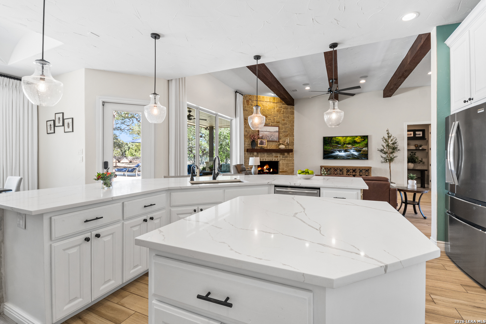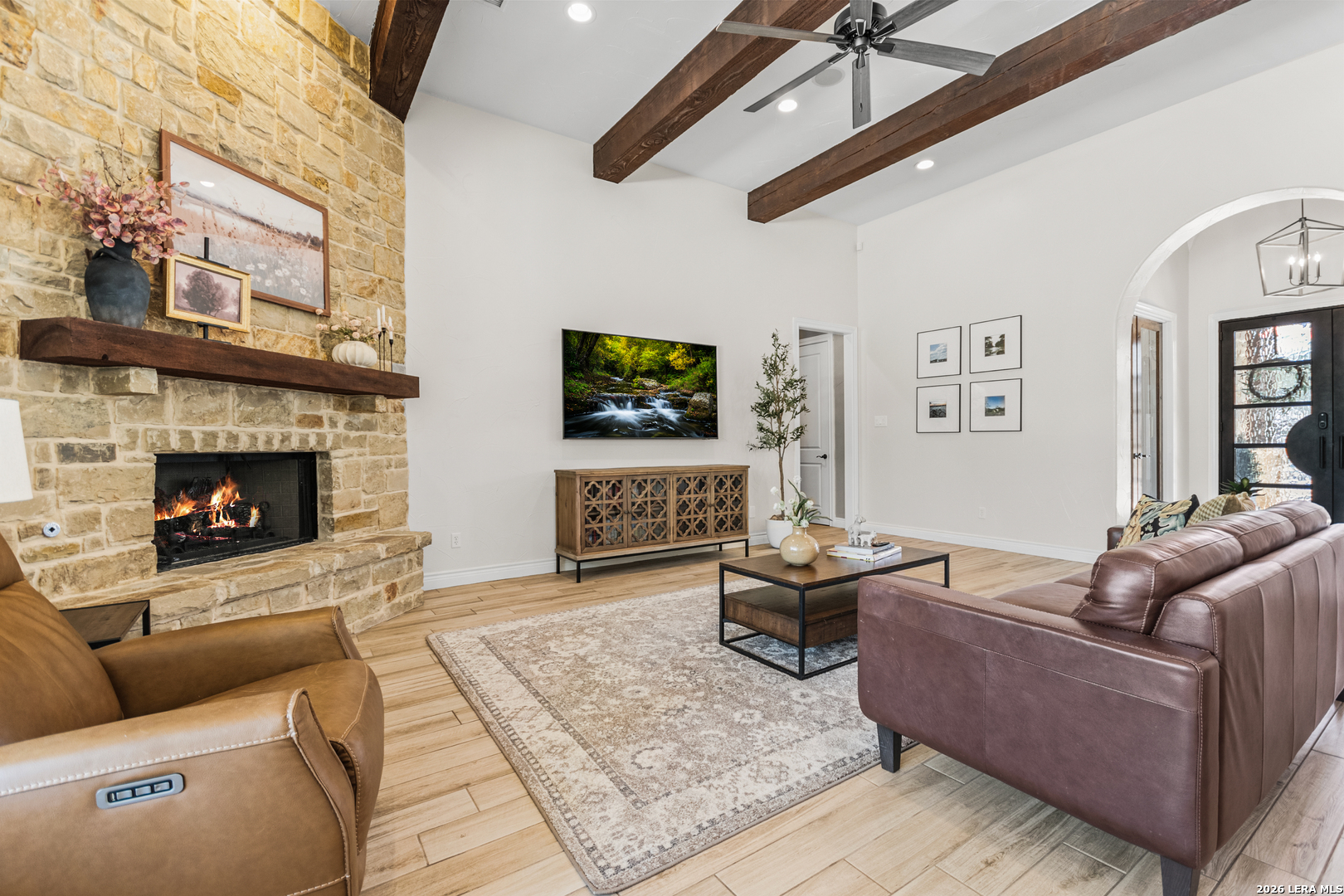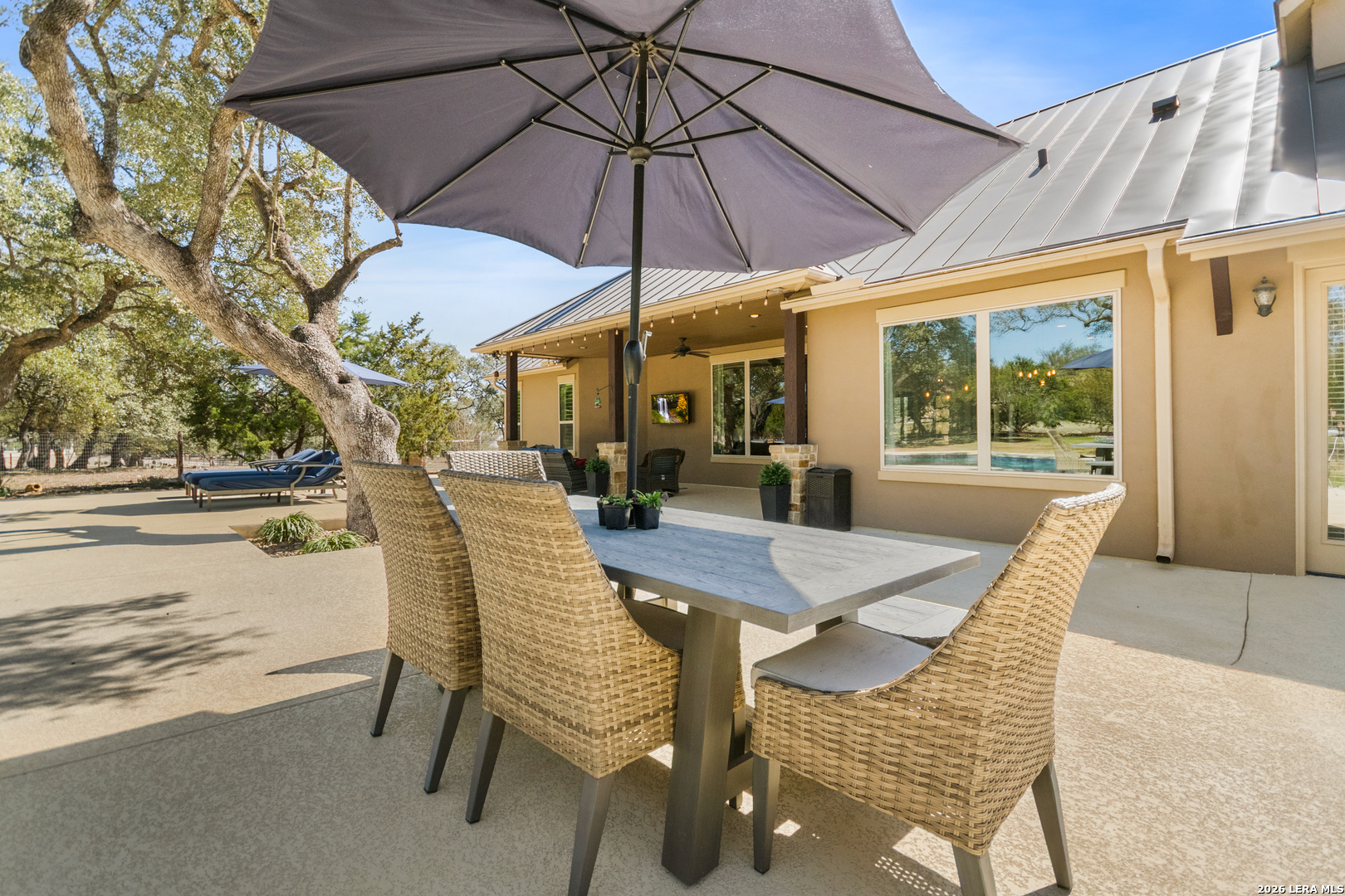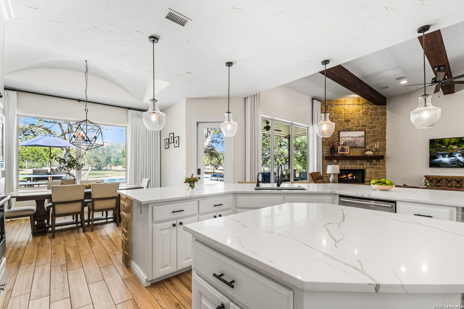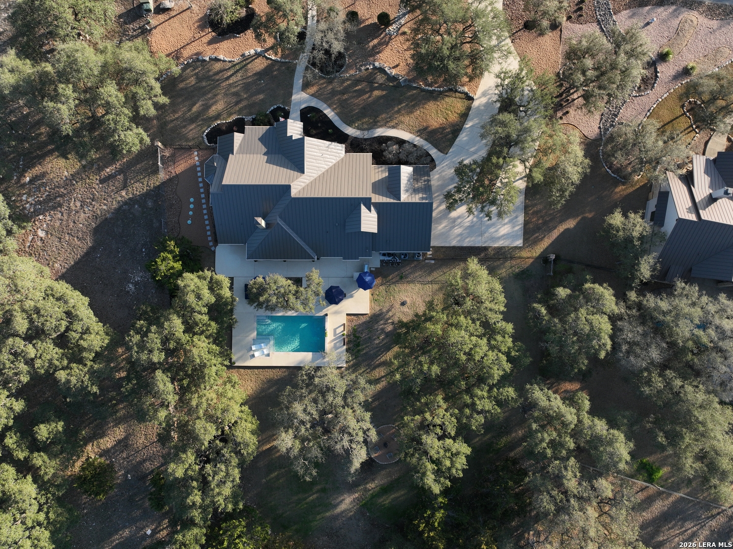 Welcome to this custom 1.5-story home in the gated community of Stone Creek Ranch. This updated residence sits on a private 1.06-acre lot and offers 4 bedrooms and 4 full bathrooms across 3,378 square feet of living space. Built in 2012, the home balances functional living with outdoor enjoyment. Custom glass front doors welcome you to an airy floor plan with porcelain wood-look tile, soaring ceilings, wood beam accents, and a floor-to-ceiling remote stone gas fireplace. The living and dining areas are lined with windows overlooking the backyard and pool, bringing in natural light and Hill Country views. The kitchen has been upgraded with new countertops, sink, and a Bosch oven, and features stainless steel appliances, gas cooking, a center island, a walk-in pantry, a breakfast bar, and a dedicated dining space. A private office near the entry can serve as a fourth bedroom with its own closet. Two secondary bedrooms each include walk-in closets and en suite baths, and a full bath near the kitchen provides convenient access for guests and also serves as a pool bath. The split primary suite is a true retreat with a spacious walk-in closet, dual vanities, an oversized walk-in The split primary suite is a retreat, featuring a spacious walk-in closet, dual vanities, an oversized walk-in shower, and a private flex room, ideal for a home gym, dressing room, or bonus space. Upstairs offers flex space, perfect for an extra bedroom, office, gym, or media room. Outdoors, the property has been transformed into a private retreat with a custom pool built in 2022 to include OmniLogic App that controls water features and multi colored lights, an outdoor shower, an expanded patio, built-in outdoor kitchen, firepit, and mature landscaping that frames the property and adds privacy. Covered patio space, oak trees, and a fenced yard create a secluded setting for gatherings or quiet evenings under the Texas sky. Additional upgrades include a new metal roof (2024), new HVAC, hot water heater, fence, gas fireplace installed in 2022, leaf gutters, built-in garage overhead storage, and additional storage in the garage, wood shutters, custom drapes, and a kitchen upgrade to include new countertops, sink, and Bosch Oven. Located in the desirable Stone Creek Ranch community, this home affords access to premier neighborhood amenities, including clubhouse facilities, pool, fitness center, jogging trails, playgrounds, and more. Residents enjoy a secure gated environment within close proximity to shopping, dining, and award-winning schools in the Boerne ISD.