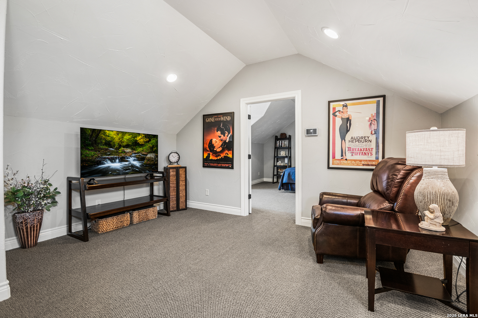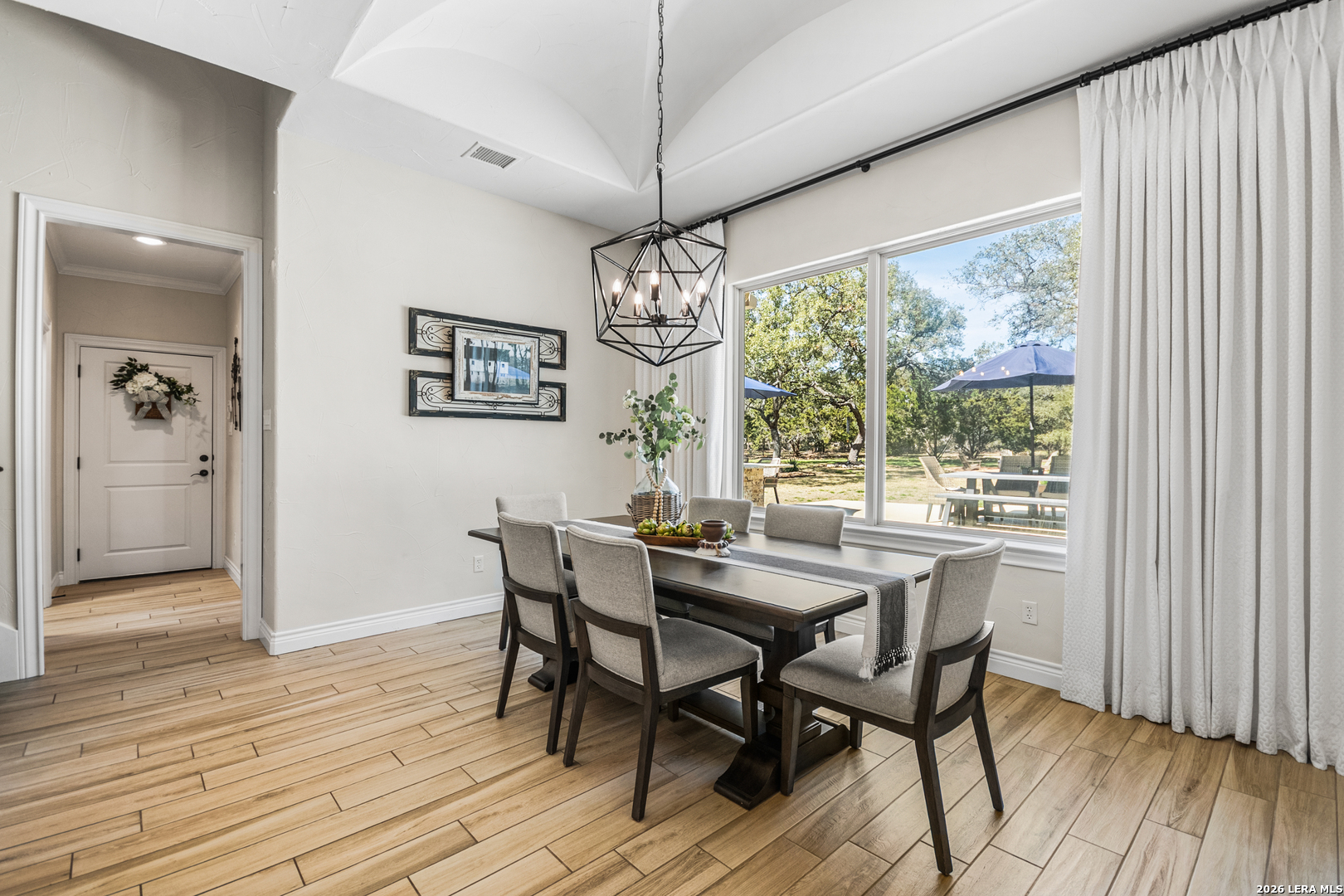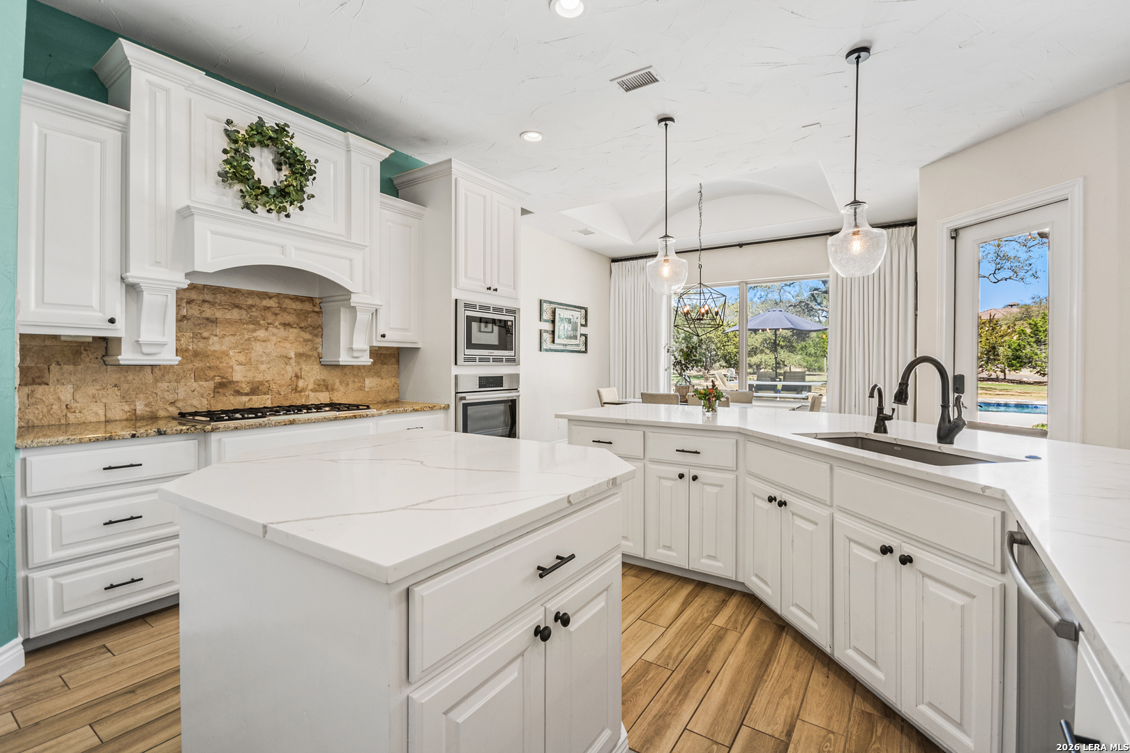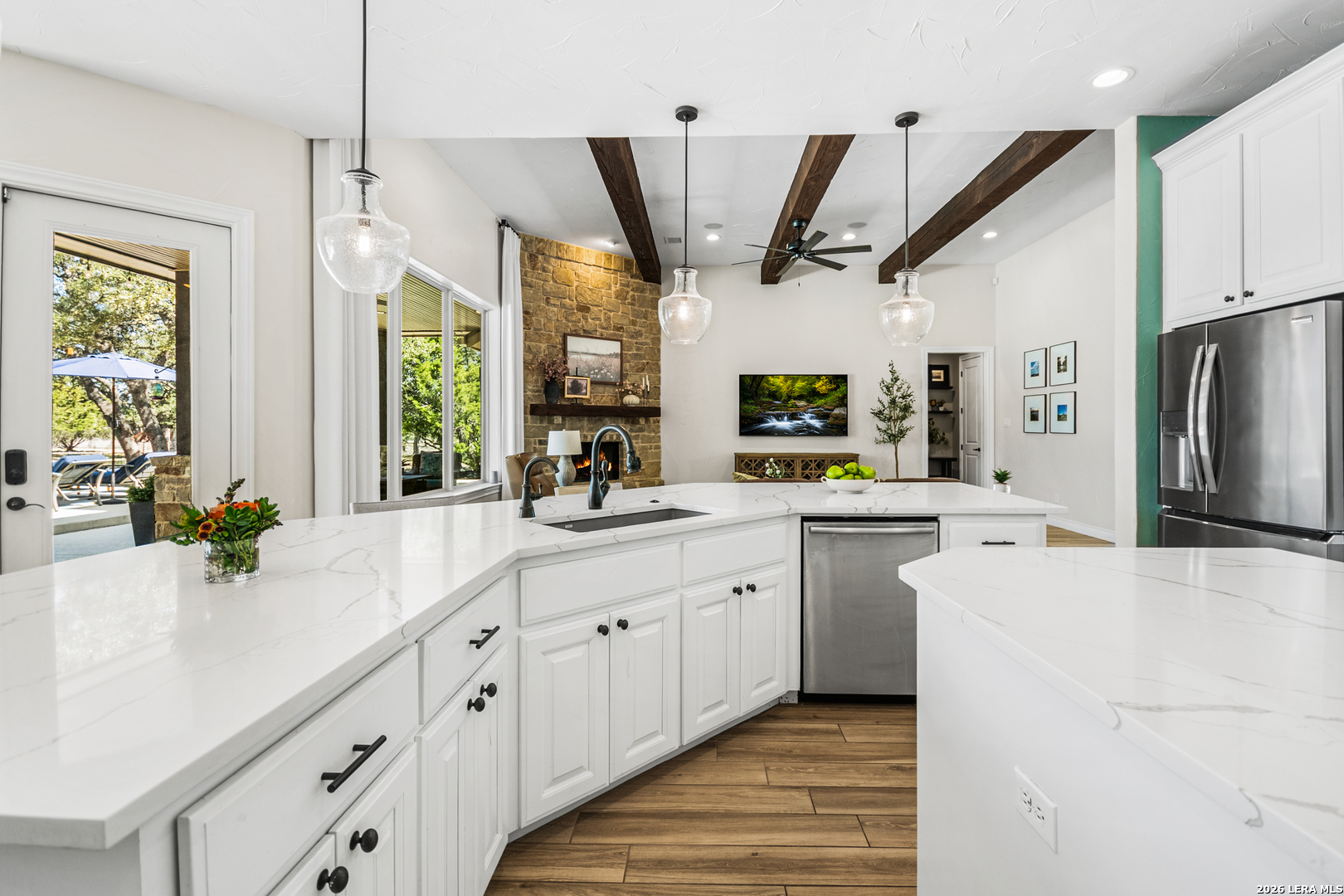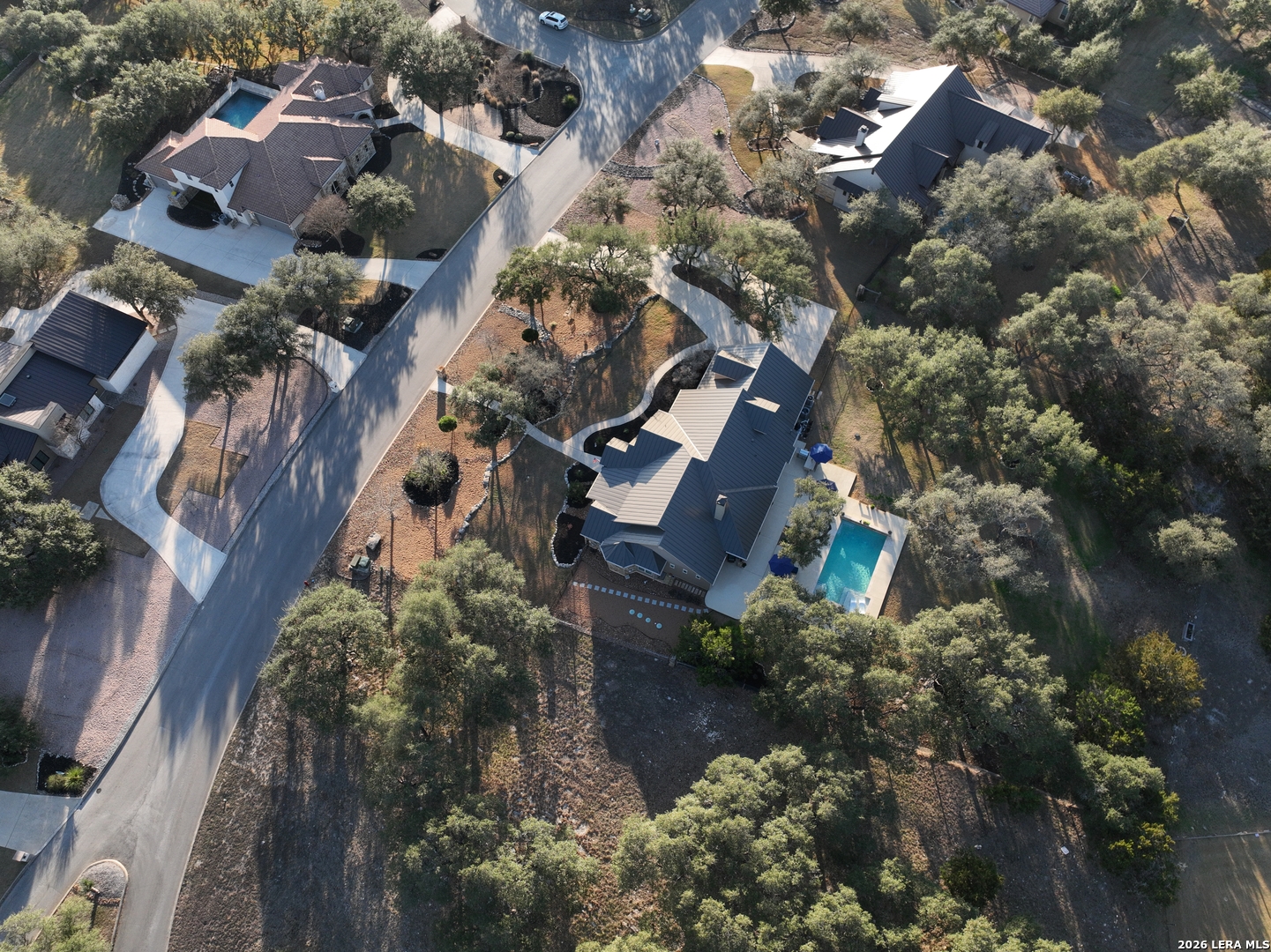 Welcome to this custom 1.5-story home in the gated community of Stone Creek Ranch. This updated residence sits on a private 1.06-acre lot and offers 4 bedrooms and 4 full bathrooms across 3,378 square feet of living space. Built in 2012, the home balances functional living with outdoor enjoyment. Custom glass front doors welcome you to an airy floor plan with porcelain wood-look tile, soaring ceilings, wood beam accents, and a floor-to-ceiling remote stone gas fireplace. The living and dining areas are lined with windows overlooking the backyard and pool, bringing in natural light and Hill Country views. The kitchen has been upgraded with new countertops, sink, and a Bosch oven, and features stainless steel appliances, gas cooking, a center island, a walk-in pantry, a breakfast bar, and a dedicated dining space. A private office near the entry can serve as a fourth bedroom with its own closet. Two secondary bedrooms each include walk-in closets and en suite baths, and a full bath near the kitchen provides convenient access for guests and also serves as a pool bath. The split primary suite is a true retreat with a spacious walk-in closet, dual vanities, an oversized walk-in The split primary suite is a retreat, featuring a spacious walk-in closet, dual vanities, an oversized walk-in shower, and a private flex room, ideal for a home gym, dressing room, or bonus space. Upstairs offers flex space, perfect for an extra bedroom, office, gym, or media room. Outdoors, the property has been transformed into a private retreat with a custom pool built in 2022 to include OmniLogic App that controls water features and multi colored lights, an outdoor shower, an expanded patio, built-in outdoor kitchen, firepit, and mature landscaping that frames the property and adds privacy. Covered patio space, oak trees, and a fenced yard create a secluded setting for gatherings or quiet evenings under the Texas sky. Additional upgrades include a new metal roof (2024), new HVAC, hot water heater, fence, gas fireplace installed in 2022, leaf gutters, built-in garage overhead storage, and additional storage in the garage, wood shutters, custom drapes, and a kitchen upgrade to include new countertops, sink, and Bosch Oven. Located in the desirable Stone Creek Ranch community, this home affords access to premier neighborhood amenities, including clubhouse facilities, pool, fitness center, jogging trails, playgrounds, and more. Residents enjoy a secure gated environment within close proximity to shopping, dining, and award-winning schools in the Boerne ISD.