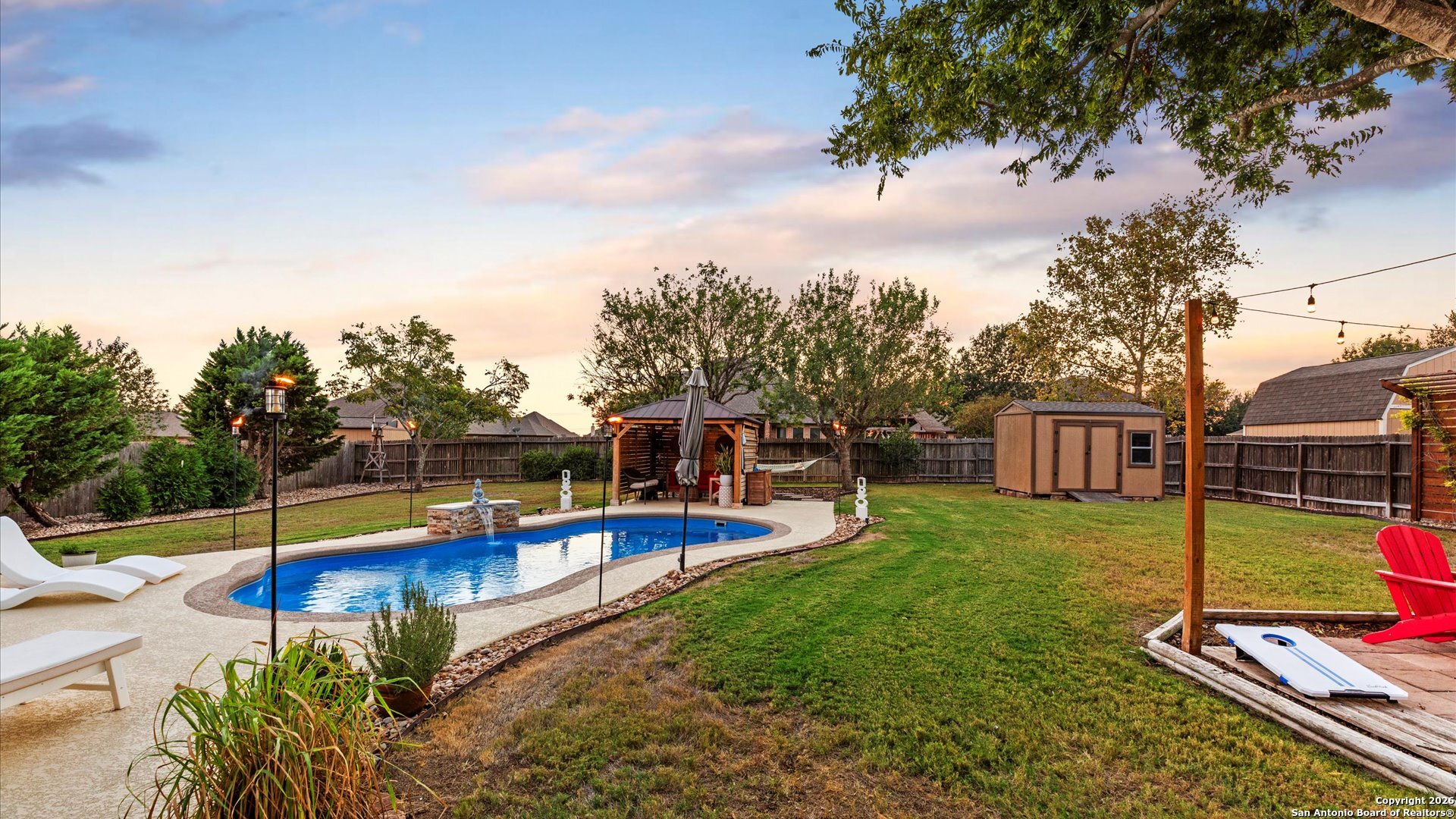 Stunning custom home situated on 1/4+ acre designed for both everyday comfort and unforgettable entertaining. Step outside to the private backyard oasis featuring inground saltwater pool w/ tranquil waterfall, expansive decking for lounging, shaded pergola retreat and charming Biergarden-style yard game space. Inside this home shines w/ fresh interior paint & recent carpet. Primary suite is located on the main floor offering privacy & ease of living. The gourmet kitchen showcases 42in Espresso cabinetry, granite c-tops, stainless appliances and coffee bar area. An oversized laundry w/ utility sink adds everyday functionality. Separate formal dining and private office make the downstairs very spacious. Upstairs, enjoy a spacious game room complete w/ built-in desk workspace and custom sliding barn door for privacy, plus a separate dedicated theatre room fully equipped w/ THX sound system/acoustic boards and comfy seating. *Nest HVAC controls *Custom lighting *Tile downstairs *Sprinkler System *Luscious landscaping *Gated N'hood *Marion ISD *minutes to New Braunfels