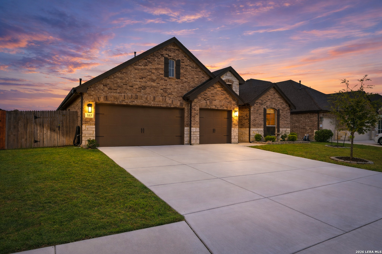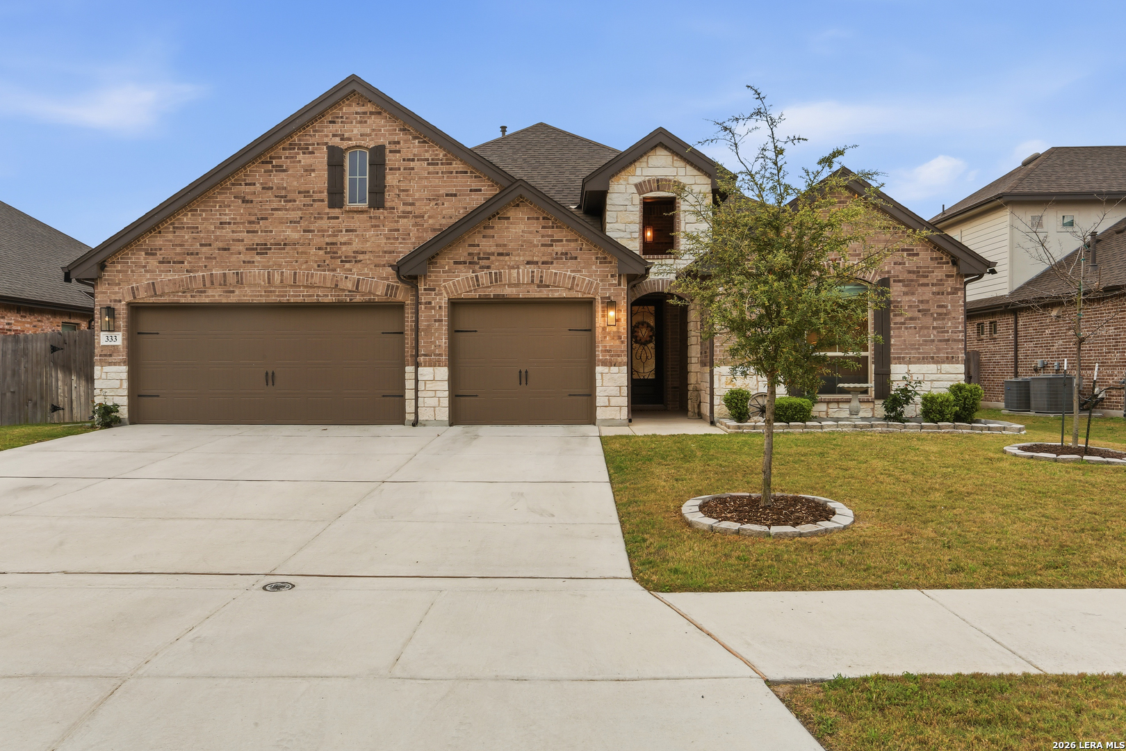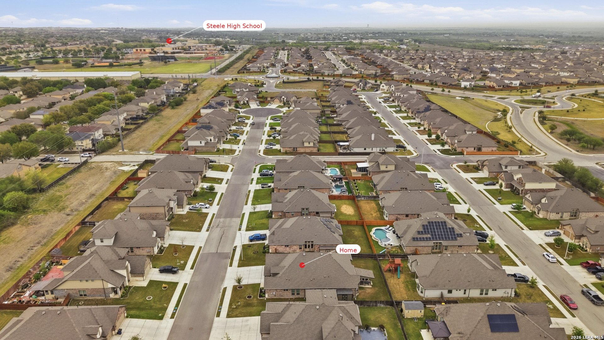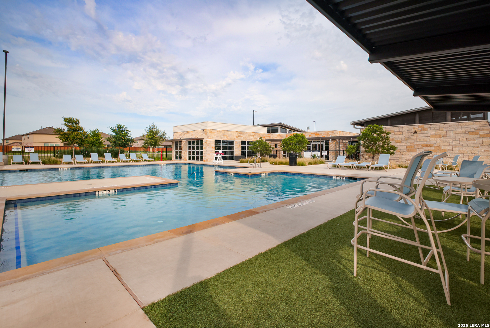 Welcome to this stunning single-story Emerald Homes build in the highly sought-after Steele Creek community, where thoughtful design meets everyday luxury. From the moment you step inside, you're greeted by high ceilings, abundant natural light, and beautiful tile flooring throughout the main living areas-offering both durability and easy maintenance. Just off the entry, a private office with elegant French double glass doors creates the perfect work-from-home space or quiet retreat. The open-concept layout seamlessly connects the living, dining, and kitchen areas-ideal for both entertaining and daily living. The chef's kitchen is the heart of the home, featuring a large granite island with seating, double ovens, gas cooking, 42-inch white cabinetry, ample storage, and convenient pull-out racks. A designated dining space adds both function and style. The spacious primary suite is privately situated at the back of the home and features a beautiful bay window, double tray ceiling, and direct access to the patio. The ensuite bathroom offers dual granite vanities, a soaking tub, a large tiled walk-in shower, and an oversized walk-in closet. On the opposite side of the home, you'll find two secondary bedrooms connected by a Jack & Jill bathroom with separate granite vanities-providing both privacy and convenience. Step outside to enjoy a covered patio plus an extended patio with additional shade-perfect for relaxing or entertaining year-round. The home also features premium Gemstone lighting by Astoria Lighting, allowing you to customize exterior colors for holidays, game days, or everyday ambiance. Additional highlights include a finished 3 car garage with epoxy flooring, full sprinkler system, and gutters, along with a 10-year builder transferable foundation warranty for added peace of mind. Residents of Steele Creek enjoy resort-style amenities including a pool, gym, playground, basketball court, and splash pad. Located in the top-rated SCUCISD and zoned for Byron P. Steele High School, this home offers convenient access to FM 1103, shopping, dining, and is just 15 minutes from JBSA Randolph and approximately 30 minutes to Fort Sam Houston. This home truly checks all the boxes, schedule your private showing today!
