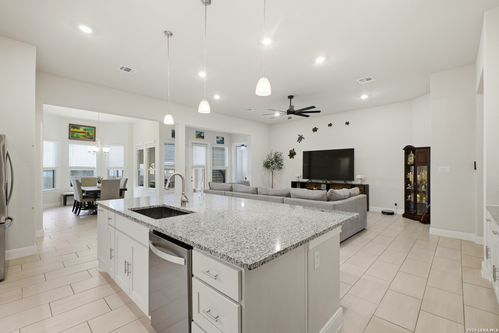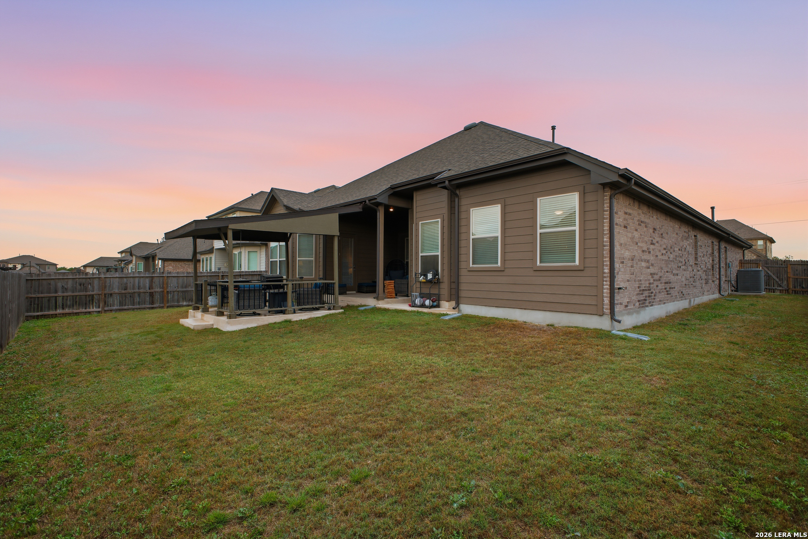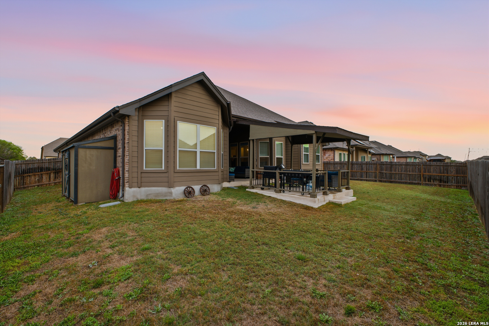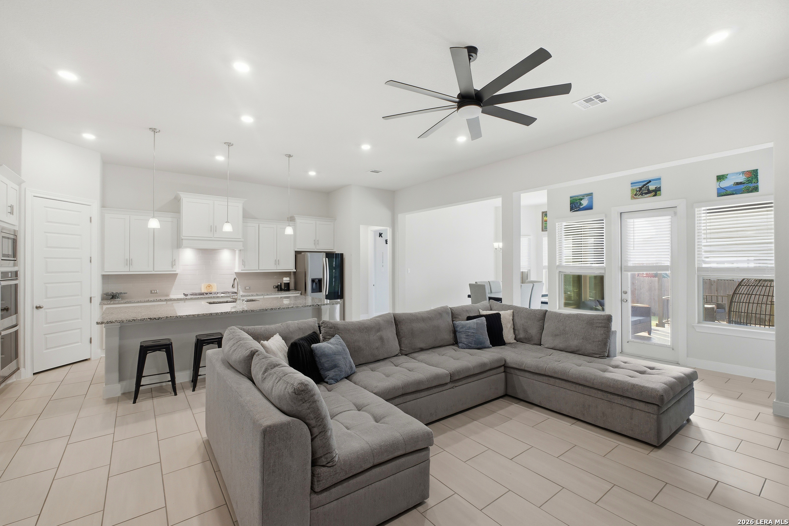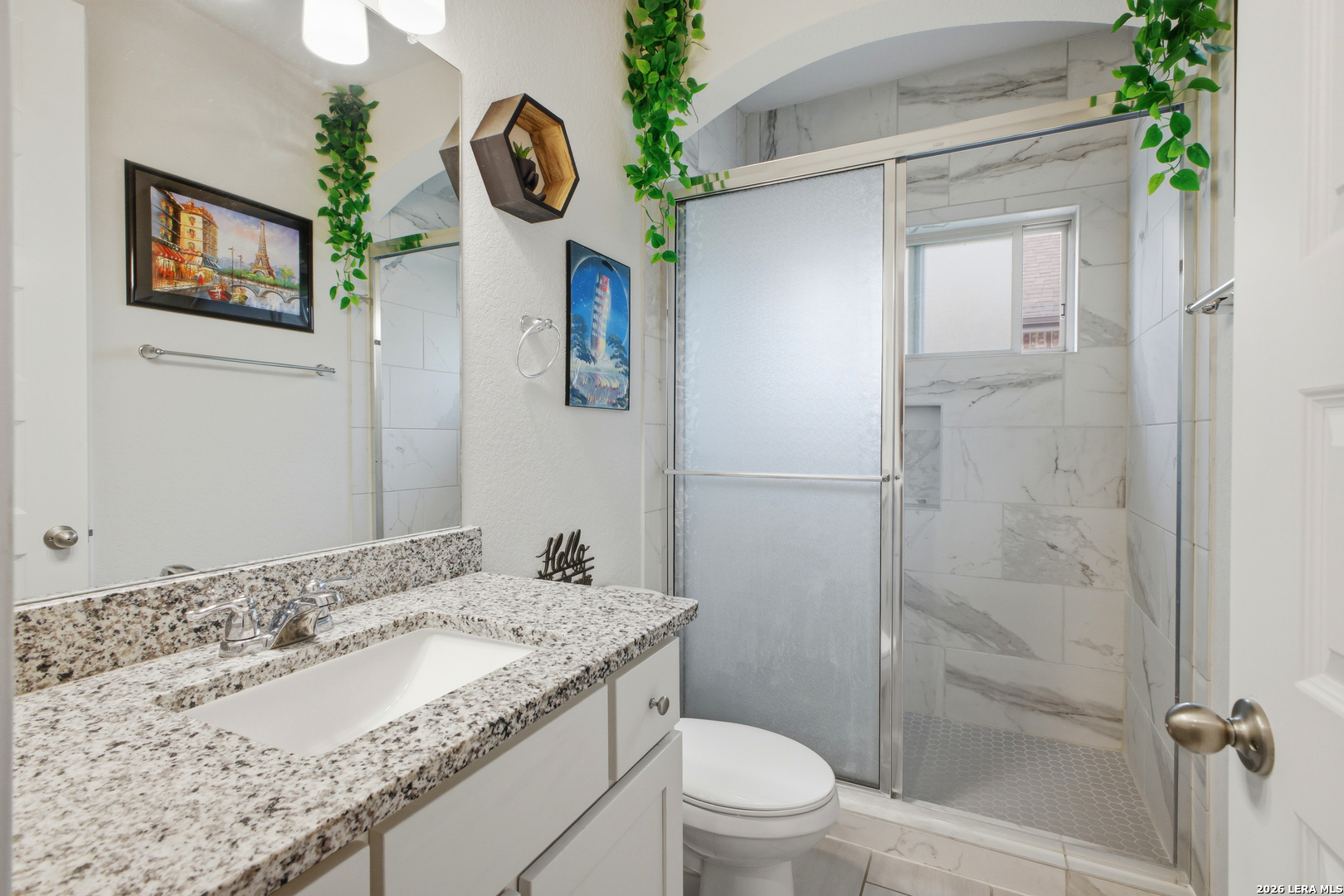 Welcome to this stunning single-story Emerald Homes build in the highly sought-after Steele Creek community, where thoughtful design meets everyday luxury. From the moment you step inside, you're greeted by high ceilings, abundant natural light, and beautiful tile flooring throughout the main living areas-offering both durability and easy maintenance. Just off the entry, a private office with elegant French double glass doors creates the perfect work-from-home space or quiet retreat. The open-concept layout seamlessly connects the living, dining, and kitchen areas-ideal for both entertaining and daily living. The chef's kitchen is the heart of the home, featuring a large granite island with seating, double ovens, gas cooking, 42-inch white cabinetry, ample storage, and convenient pull-out racks. A designated dining space adds both function and style. The spacious primary suite is privately situated at the back of the home and features a beautiful bay window, double tray ceiling, and direct access to the patio. The ensuite bathroom offers dual granite vanities, a soaking tub, a large tiled walk-in shower, and an oversized walk-in closet. On the opposite side of the home, you'll find two secondary bedrooms connected by a Jack & Jill bathroom with separate granite vanities-providing both privacy and convenience. Step outside to enjoy a covered patio plus an extended patio with additional shade-perfect for relaxing or entertaining year-round. The home also features premium Gemstone lighting by Astoria Lighting, allowing you to customize exterior colors for holidays, game days, or everyday ambiance. Additional highlights include a finished 3 car garage with epoxy flooring, full sprinkler system, and gutters, along with a 10-year builder transferable foundation warranty for added peace of mind. Residents of Steele Creek enjoy resort-style amenities including a pool, gym, playground, basketball court, and splash pad. Located in the top-rated SCUCISD and zoned for Byron P. Steele High School, this home offers convenient access to FM 1103, shopping, dining, and is just 15 minutes from JBSA Randolph and approximately 30 minutes to Fort Sam Houston. This home truly checks all the boxes, schedule your private showing today!