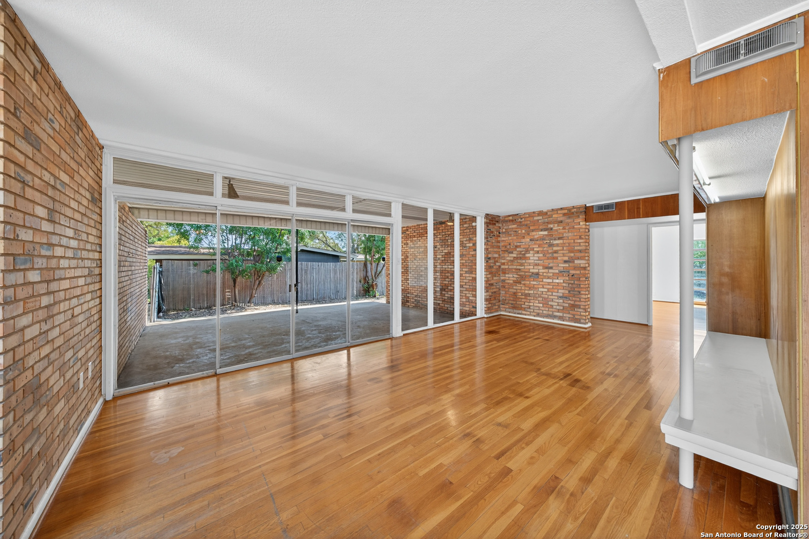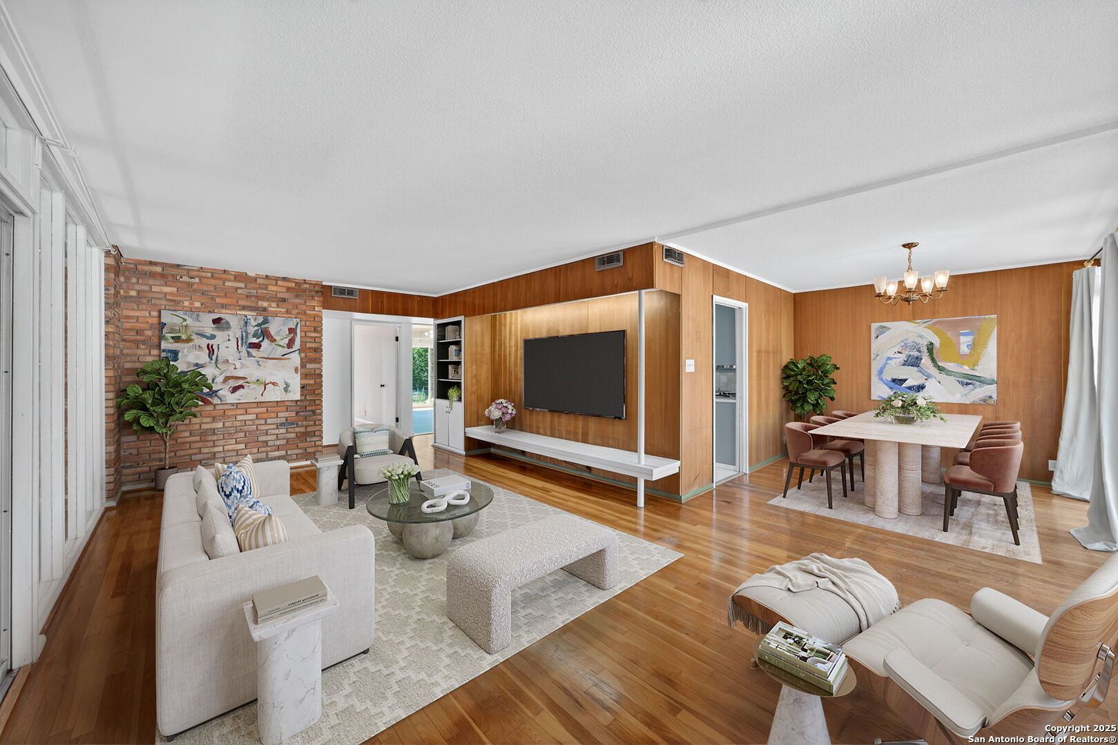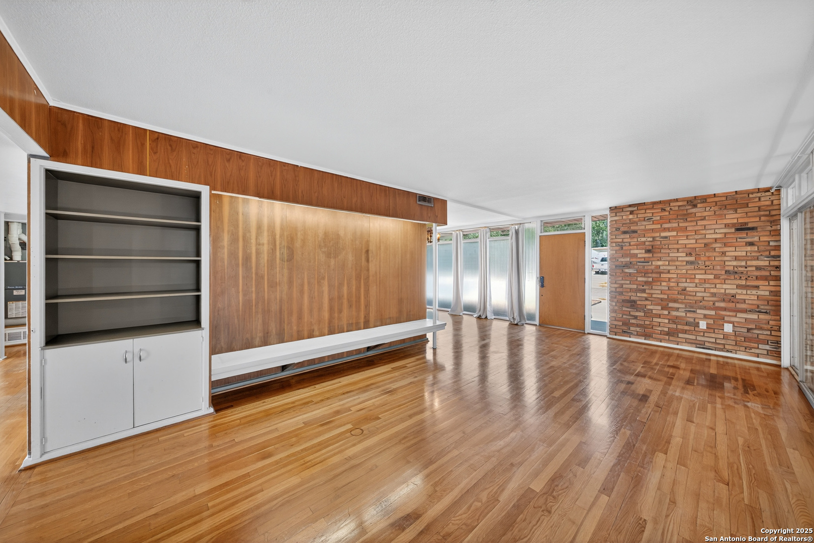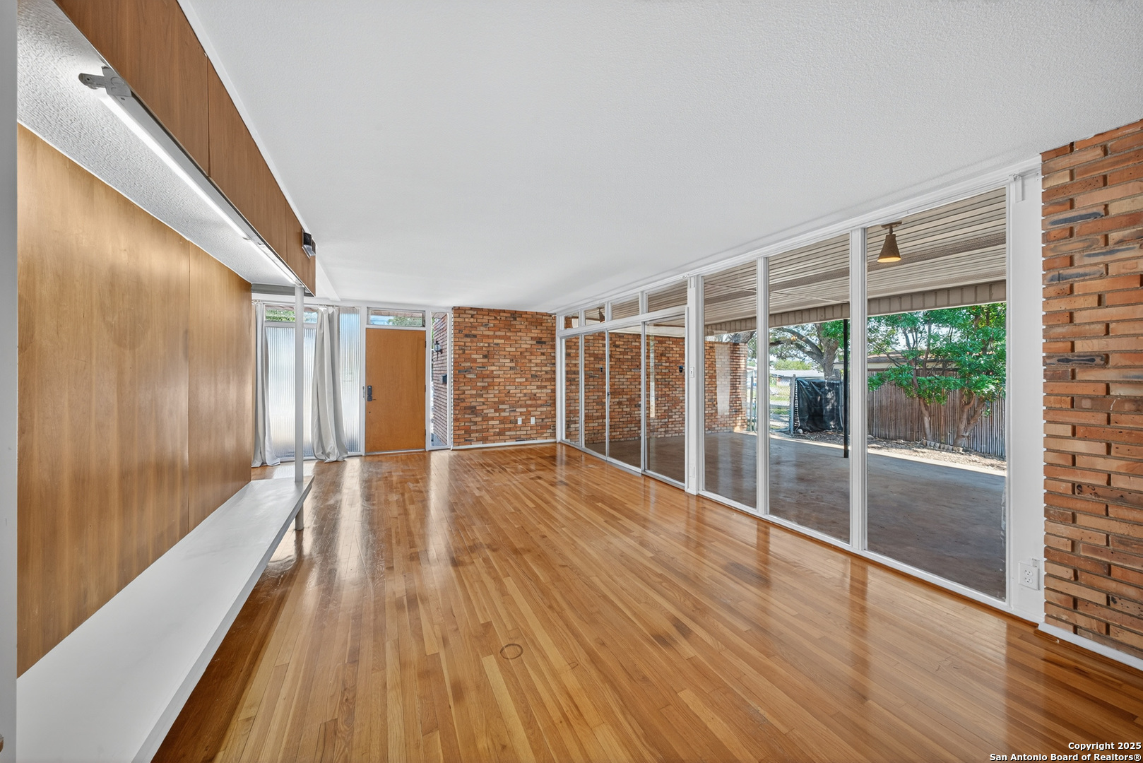 A true mid-century ranch filled with the character and nostalgia of the 1950's. The warm brick interior makes the space feel inviting and grounded, while a 20-foot stretch of floor-to-ceiling windows fills the living area with natural light and creates a beautiful connection between the indoors and the covered patio. Transfer the patio into another living area with outdoor dining, comfortable seating, and a projector for fall movie nights to spend evenings with family and friends. Inside, the original wood paneling adds texture and charm, giving the home a timeless midcentury warmth. The front room, where a 13-foot line of windows stretches across the wall filling it with natural light. Great location in the heart of San Antonio, just minutes from La Cantera, North Star, and Downtown. Wonderful neighbors that exemplify community. This house has warmth, history, and personality that make you feel at home the moment you walk in.