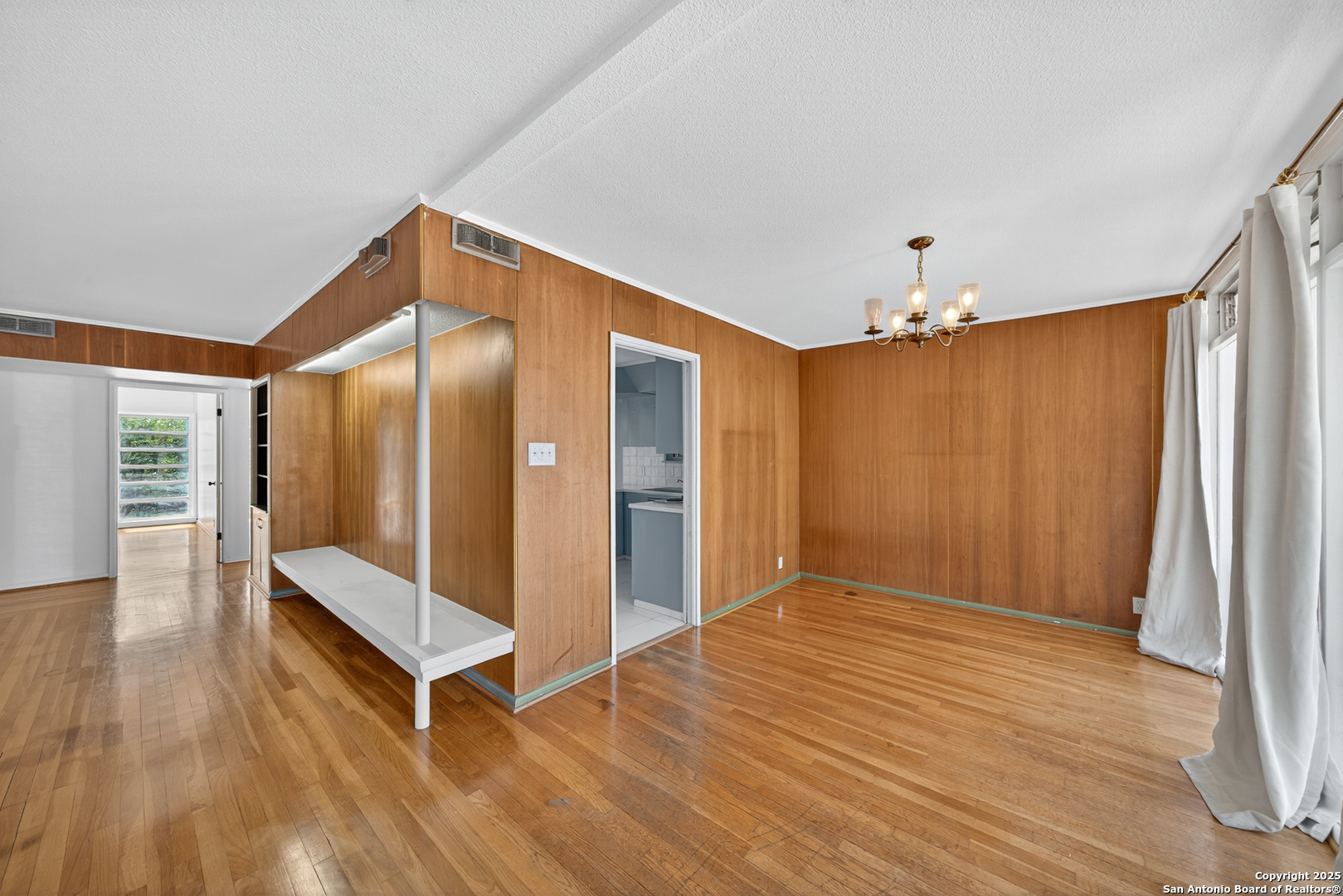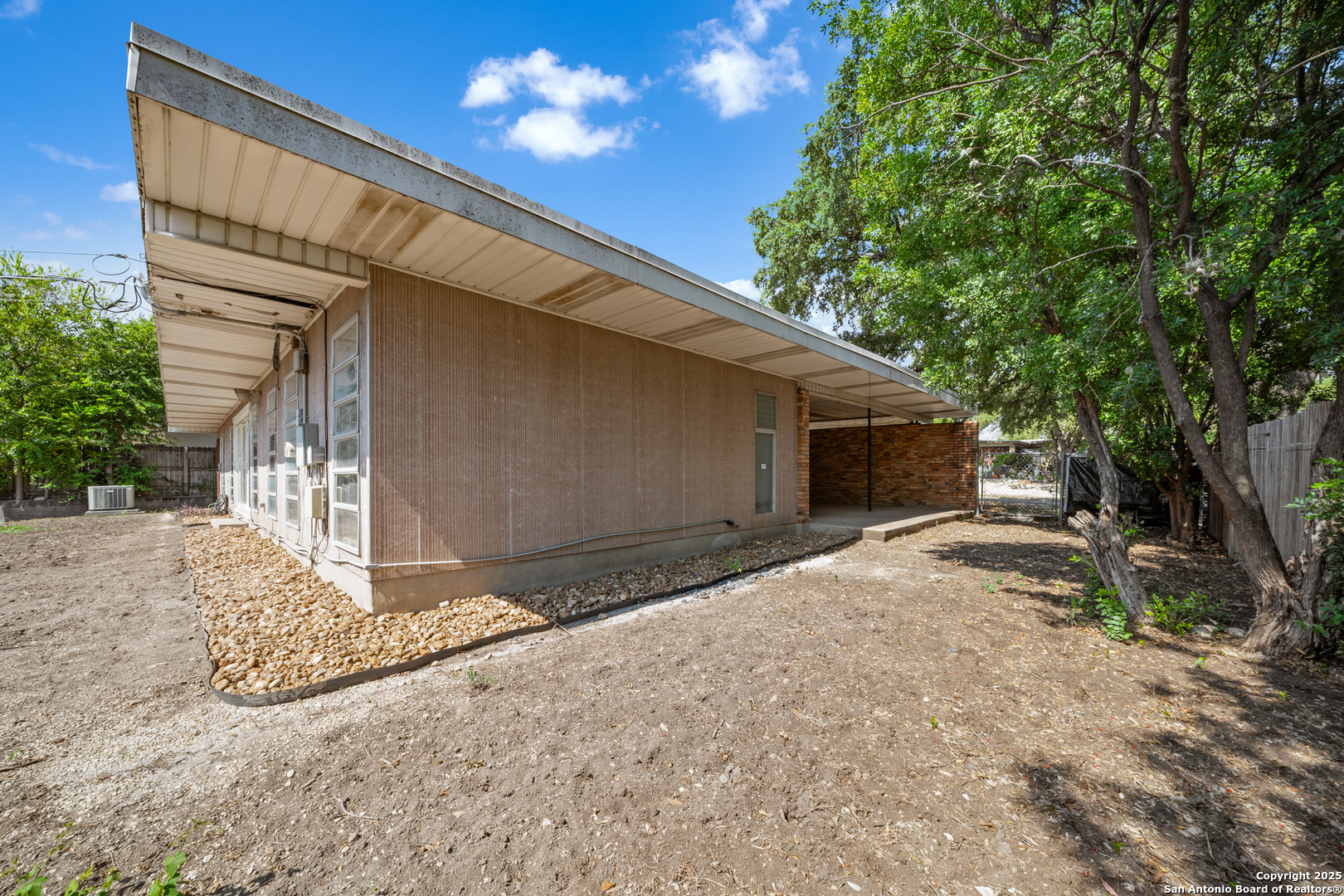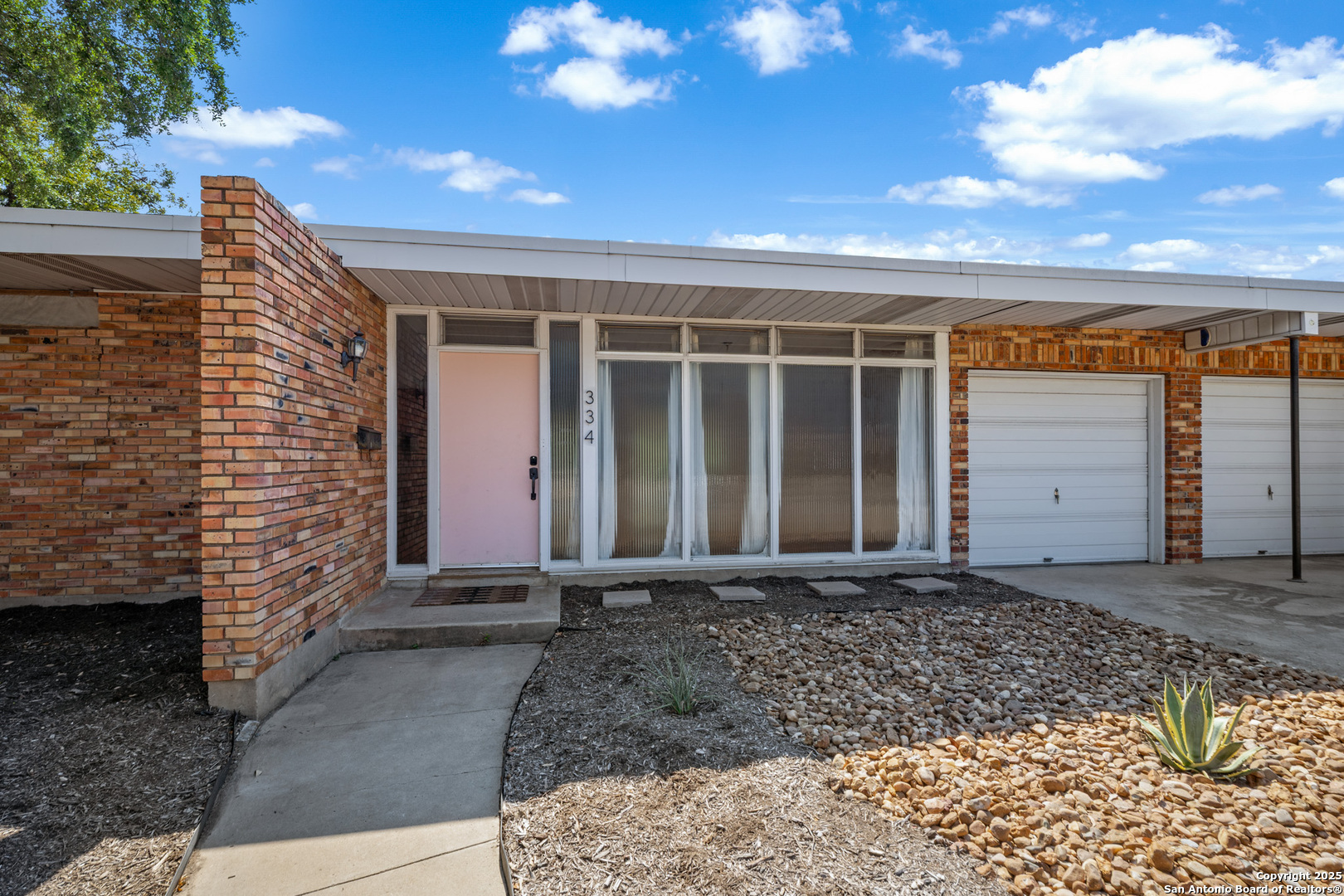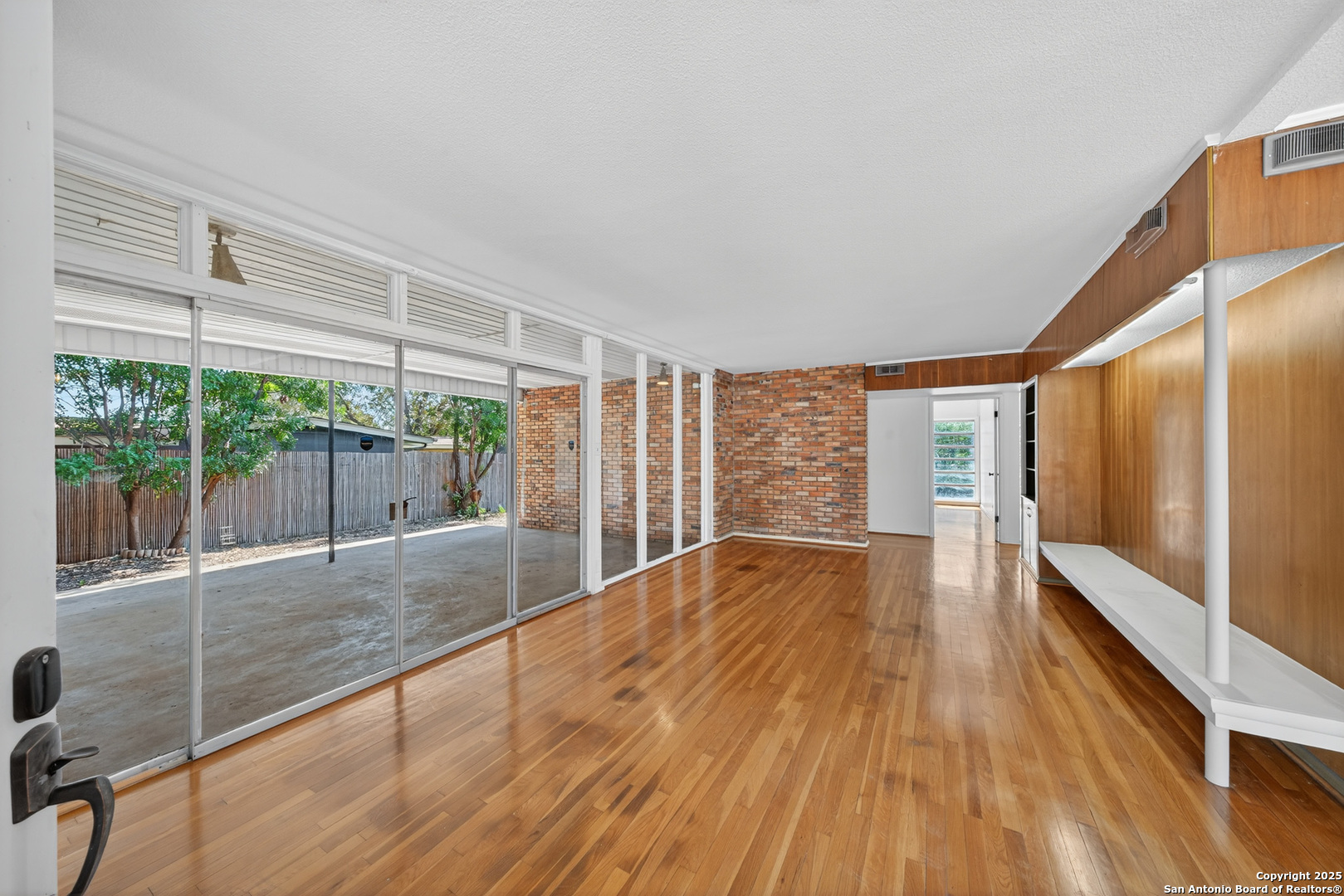 A true mid-century ranch filled with the character and nostalgia of the 1950's. The warm brick interior makes the space feel inviting and grounded, while a 20-foot stretch of floor-to-ceiling windows fills the living area with natural light and creates a beautiful connection between the indoors and the covered patio. Transfer the patio into another living area with outdoor dining, comfortable seating, and a projector for fall movie nights to spend evenings with family and friends. Inside, the original wood paneling adds texture and charm, giving the home a timeless midcentury warmth. The front room, where a 13-foot line of windows stretches across the wall filling it with natural light. Great location in the heart of San Antonio, just minutes from La Cantera, North Star, and Downtown. Wonderful neighbors that exemplify community. This house has warmth, history, and personality that make you feel at home the moment you walk in.