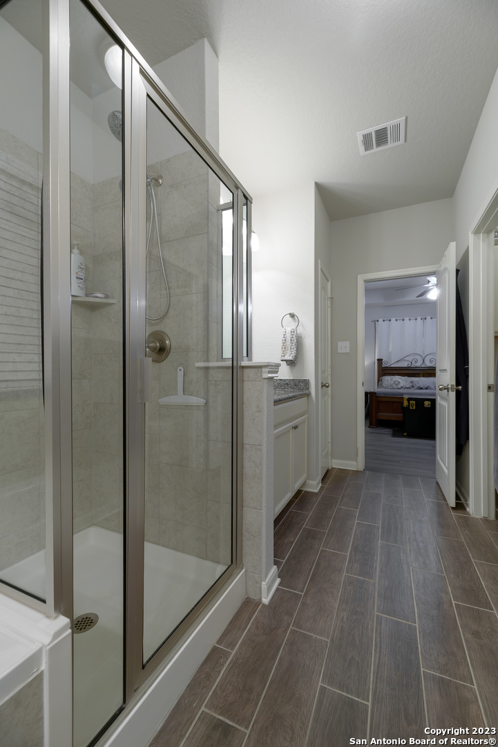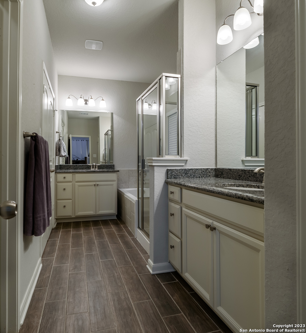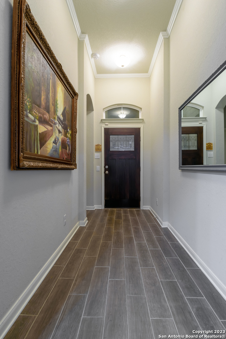 Come see this beautiful single story home on a greenbelt with all the bells and whistles! Gorgeous open floor plan with secluded primary suite and tray ceilings. So many upgrades! This home includes granite countertops, crown molding, wood-look tile floors, a whole house 24KW GENERAC generator, solar screens, an "Elfa" system in the master closet, and so much more! The neighborhood boasts wonderful amenities including pool, playground, trails and more. Just a couple minutes to the elementary school. Welcome home!
