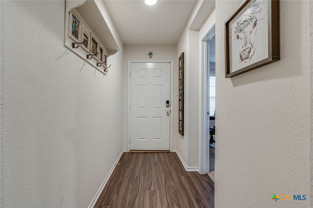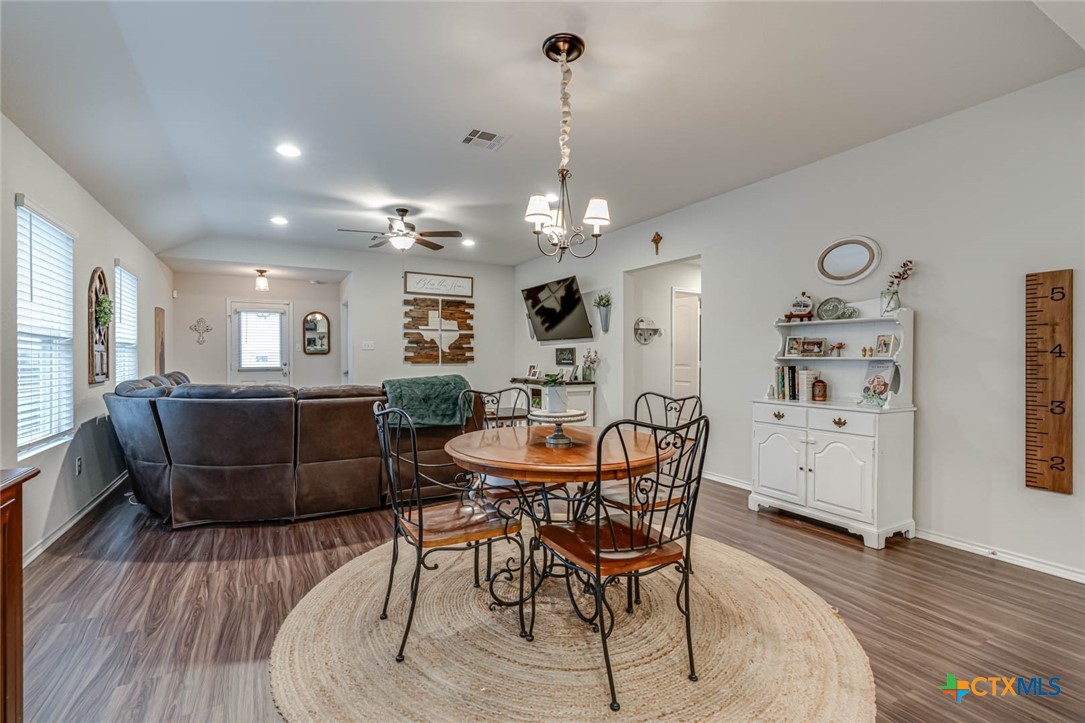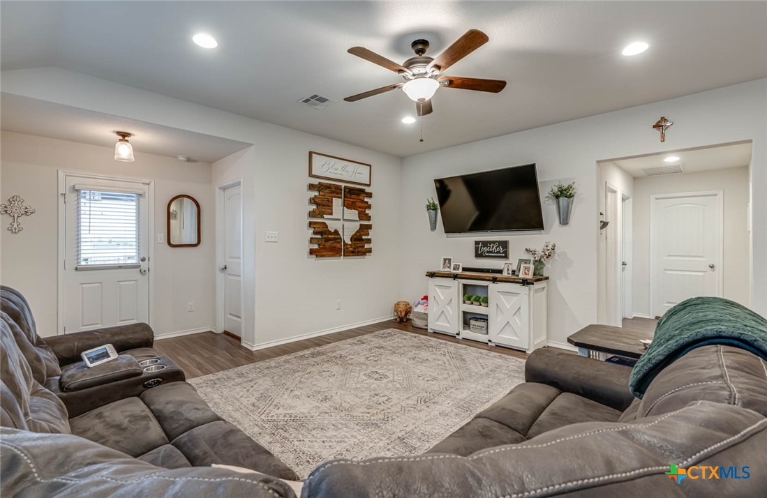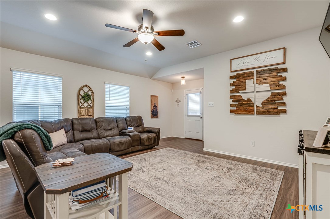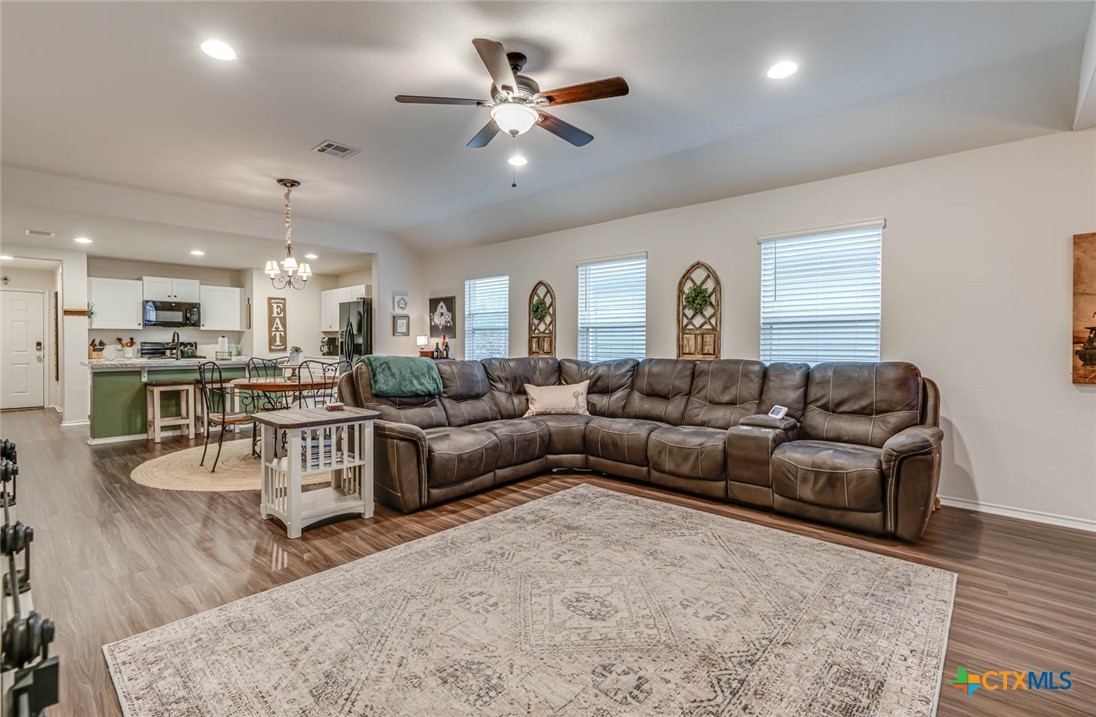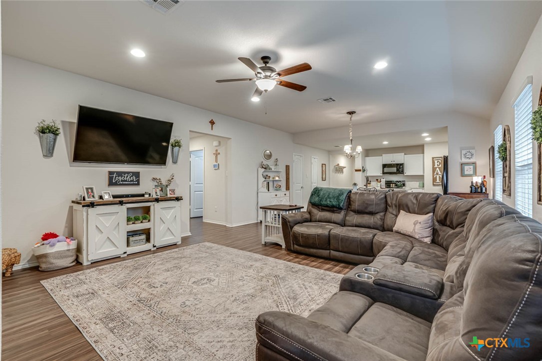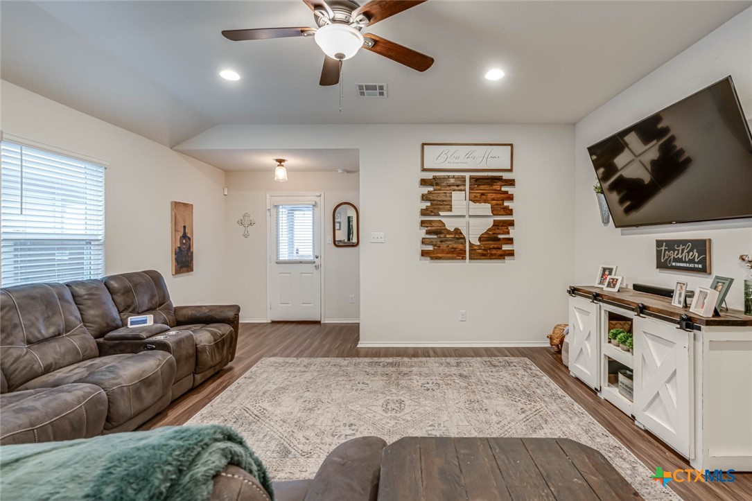 This beautifully maintained home offers the perfect blend of comfort, style, and functionality. As you approach, you’re greeted by a well-manicured lawn, leading to an inviting front entryway. Inside, the open floor plan captures attention with its neutral paint colors and stunning luxury vinyl flooring that flows throughout the space. The living area is bright and airy, featuring custom wood paneling, modern recessed lighting, sleek finishes and large windows that flood the space with natural light. The kitchen is a true highlight, featuring a spacious island perfect for entertaining or casual dining. With high-end finishes, it offers both style and practicality. Adjacent to the kitchen are the dining and living areas, making it an ideal space for gatherings. The master suite offers a spacious layout with ample closet space. The large master shower is luxurious and modern. Additionally, the home boasts a large utility room, providing extra storage and convenience. Step outside onto the extended deck with plenty of room for seating and enjoying the privacy of the well maintained backyard which offers a serene escape, perfect for outdoor activities, gardening, or simply relaxing. Unbeatable location situated right off of I 35 in a quiet neighborhood. A stone’s throw from Historic Gruene and downtown New Braunfels for food, entertainment, recreation and more.