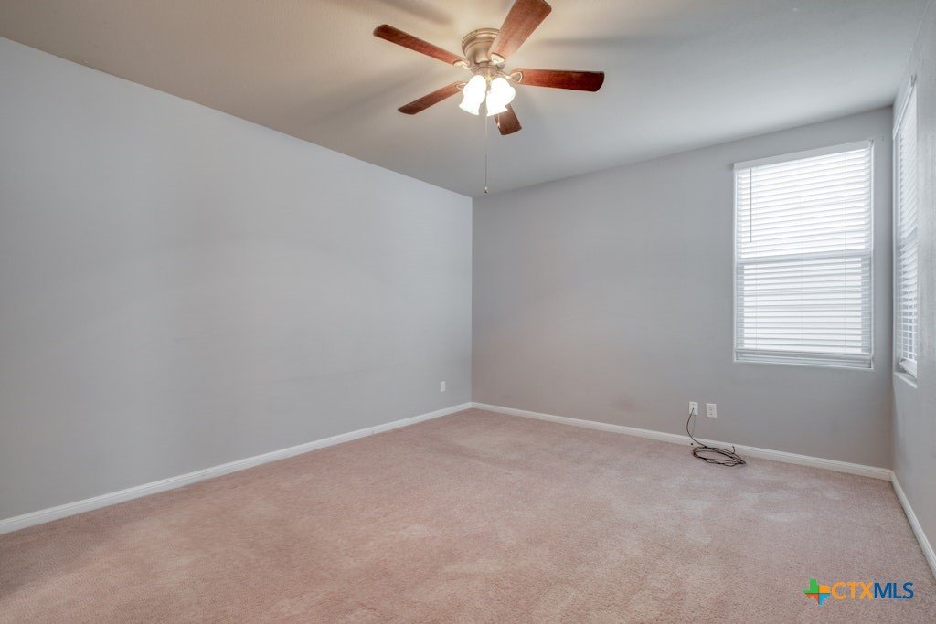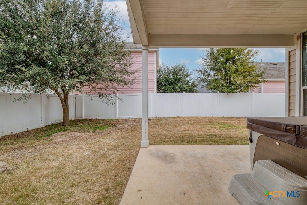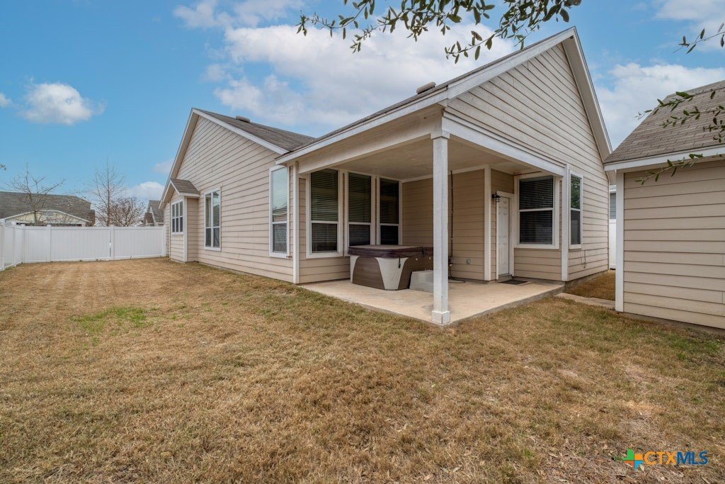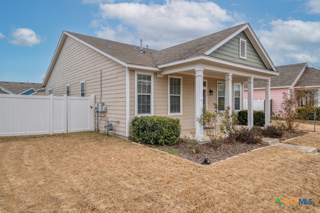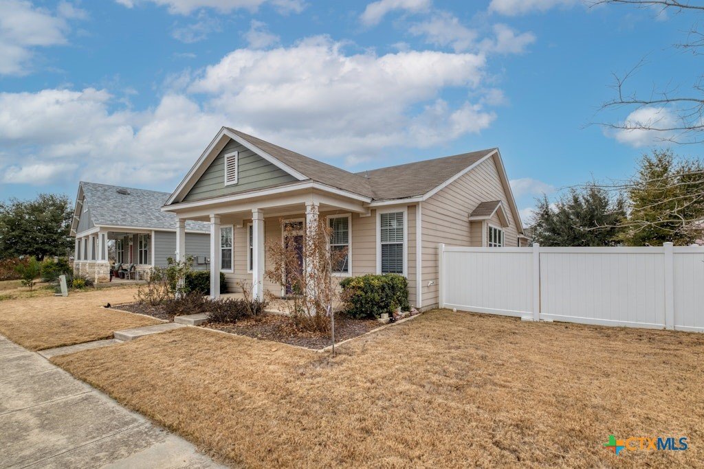Beautiful one story, open 3BR/2BA plan with added flex room with double french doors, perfect for a studio/office/exercise room. With an abundance of natural light, ceramic tile throughout the main living spaces and carpeted bedrooms, this home is ready for new owners! Huge living/kitchen space full of windows ~ large primary bedroom features walk-in closet and custom upgraded tiled shower. Spacious secondary rooms as well. HVAC is approx. 2 years old, and Water Heater is approx. 1 year old. Covered back patio and large side yard make this home perfect for children and pets! 2 car garage with alley access. Enjoy direct access to the Blanco River and lots of walking and hiking trails!