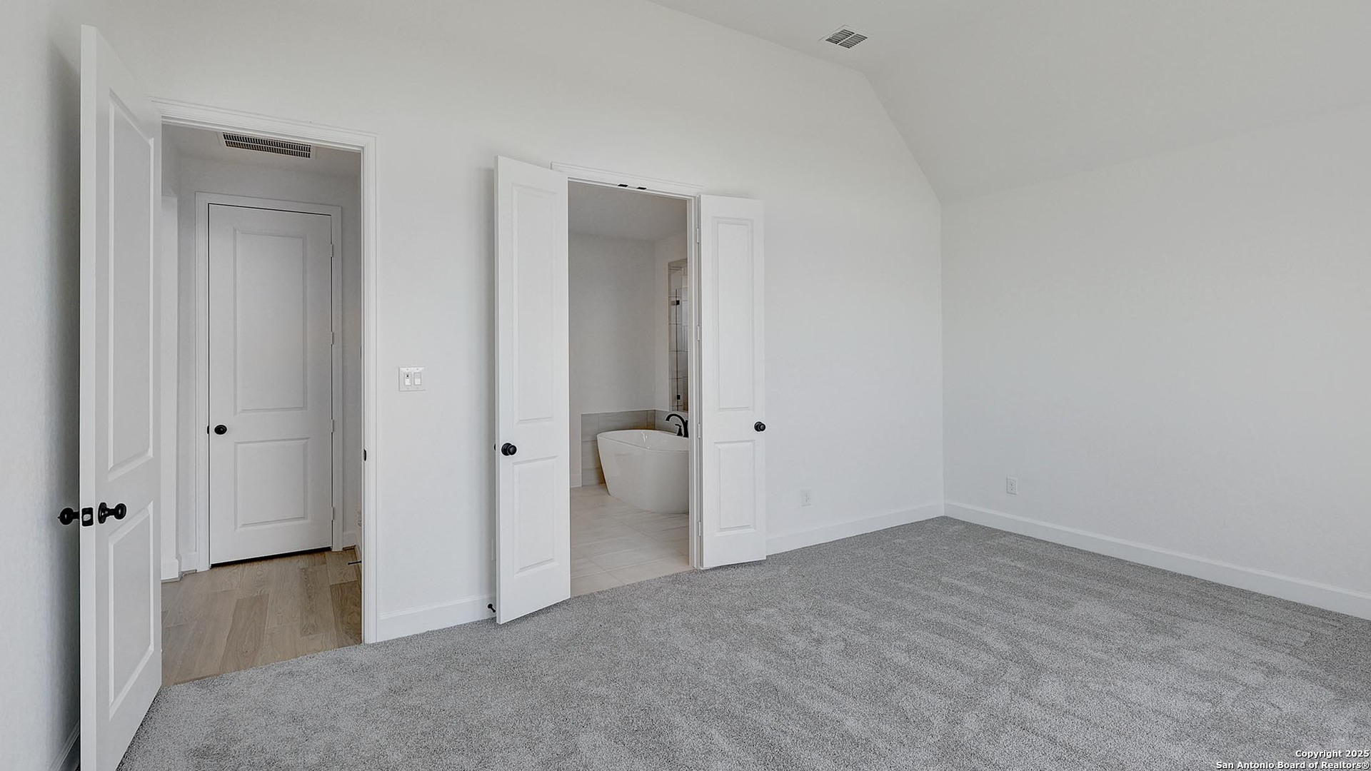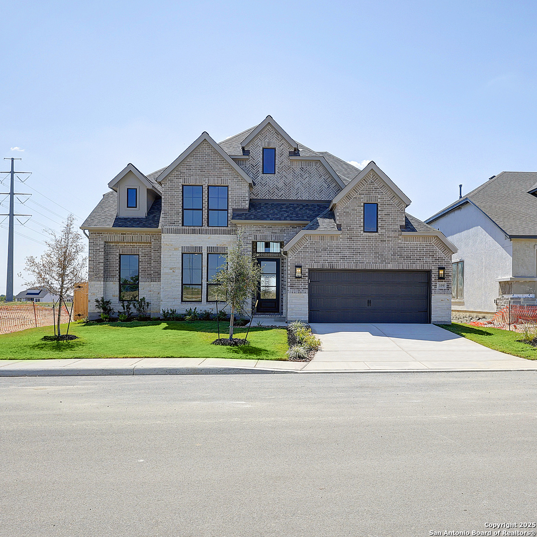 Home office with French doors set at two-story entry. Formal dining room opens to curved staircase. Kitchen and morning area open to two-story family room. Kitchen features generous island with built-in seating space and 5-burner gas cooktop. Family room features a wood mantel fireplace and wall of windows. Primary bedroom features 12-foot ceiling. Primary bath includes dual vanity, freestanding tub, separate glass-enclosed shower and oversized walk-in closet with access to utility room. A second bedroom is downstairs. A game room, media room and secondary bedrooms are upstairs. Extended covered backyard patio and 5-zone sprinkler system. Mud room off three-car garage.