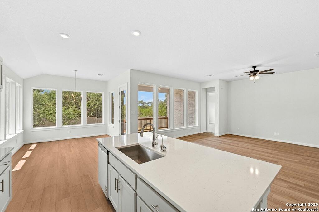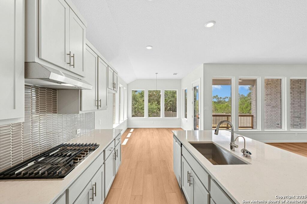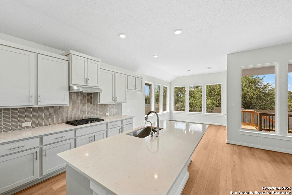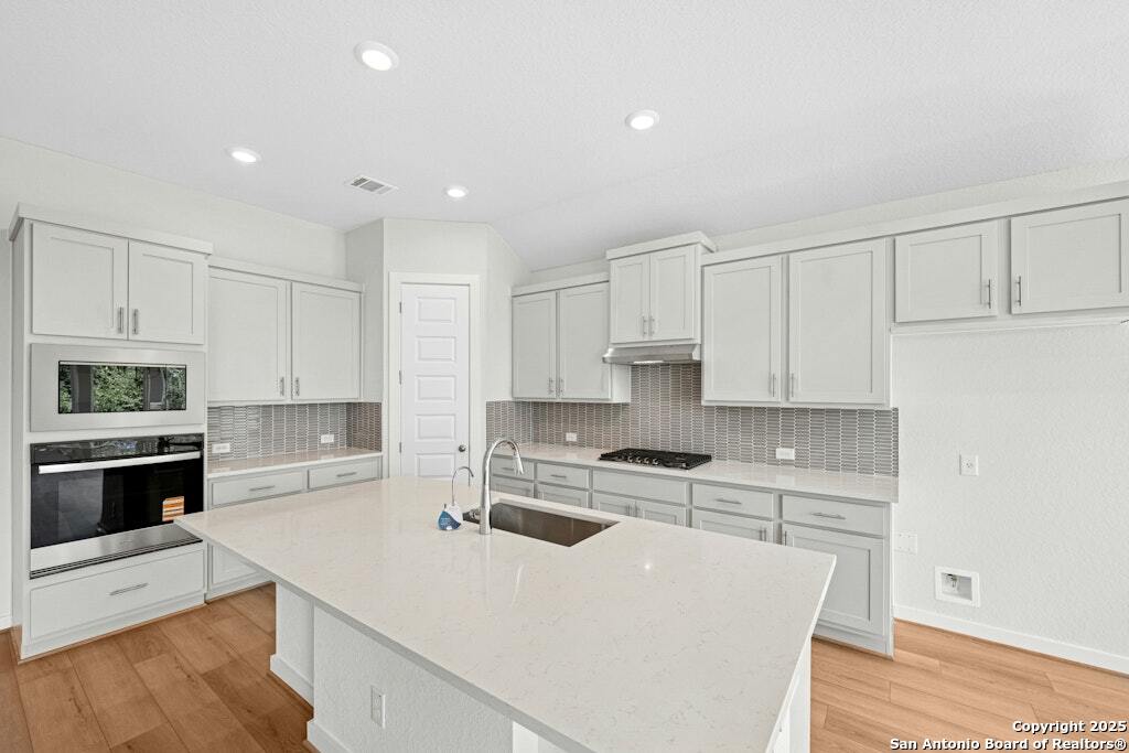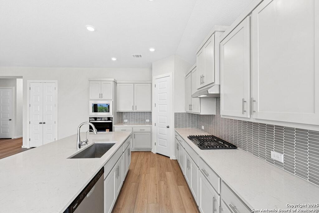 ** MOVE IN READY! ** Discover refined living at 339 Sugarcane in the sought-after New Braunfels area. This impressive 2,284 square foot residence offers the perfect balance of comfort and style with its thoughtfully designed floor plan featuring 4 bedrooms and 3 bathrooms. Step inside and be welcomed by the gallery entrance adorned with a modern chandelier fixture that sets the tone for the contemporary aesthetic throughout. The home showcases premium Vinyl Plank flooring in the sophisticated Barkley shade, unifying the main living spaces with warmth and durability. The heart of this home is undoubtedly the kitchen, where culinary enthusiasts will appreciate the sleek white cabinetry paired with elegant quartz countertops. A professional-grade 30-inch gas cooktop provides the perfect platform for creating memorable meals, while the deep stainless steel sink adds both functionality and style. The dining area, illuminated by another eye-catching modern chandelier, creates an inviting space for family gatherings and entertaining guests. The thoughtful continuation of white cabinetry and quartz countertops throughout the home maintains a cohesive design that feels both fresh and timeless. Whether you're hosting friends or enjoying quiet family evenings, this New Braunfels home delivers the perfect setting for creating lasting memories. With its blend of contemporary finishes and practical layout, 339 Sugarcane represents an exceptional opportunity to embrace the Texas Hill Country lifestyle with modern sophistication.