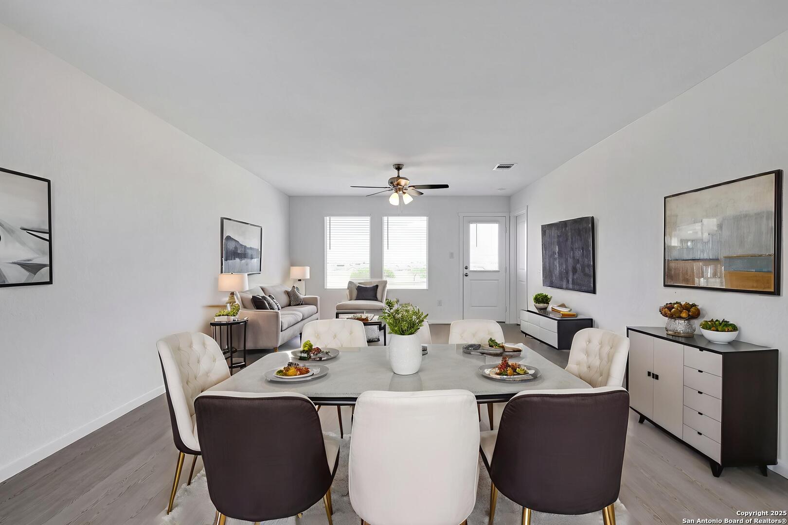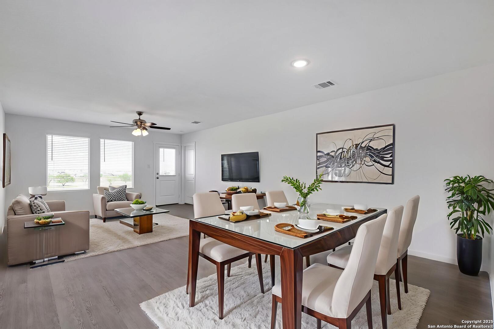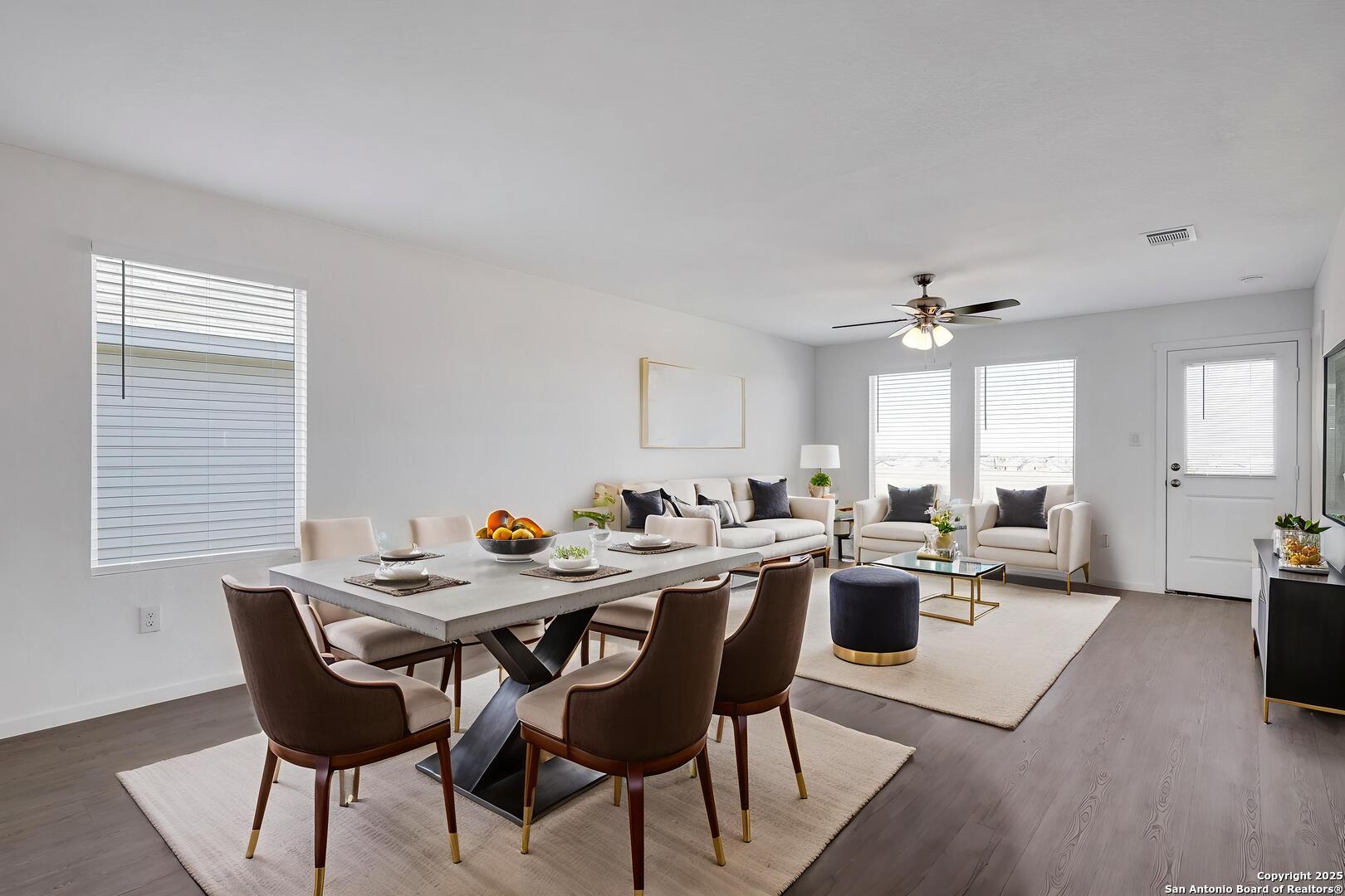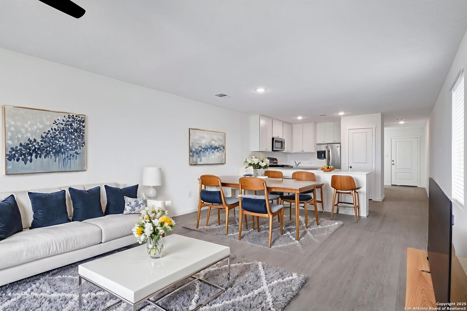 ***$500 MOVE IN SPECIAL***Welcome to this stunning new residence in the desirable Voss Farms community. Designed with open-concept living in mind, the home features luxury vinyl flooring throughout the main living areas for both style and durability. The kitchen stands out with its expansive peninsula, providing abundant space for cooking and entertaining. The primary suite offers a true retreat, complete with a ceiling fan for added comfort and a well-appointed en suite bath. Step outside to discover what makes this property unique-tranquil views of fields, trees, and open nature with no rear neighbors. Residents of Voss Farms enjoy access to community amenities including a pool and playground. Situated in New Braunfels, this location places you near vibrant attractions such as Schlitterbahn Water Park, Fisher Park, Landa Park, the Historic Gruene District, and more.