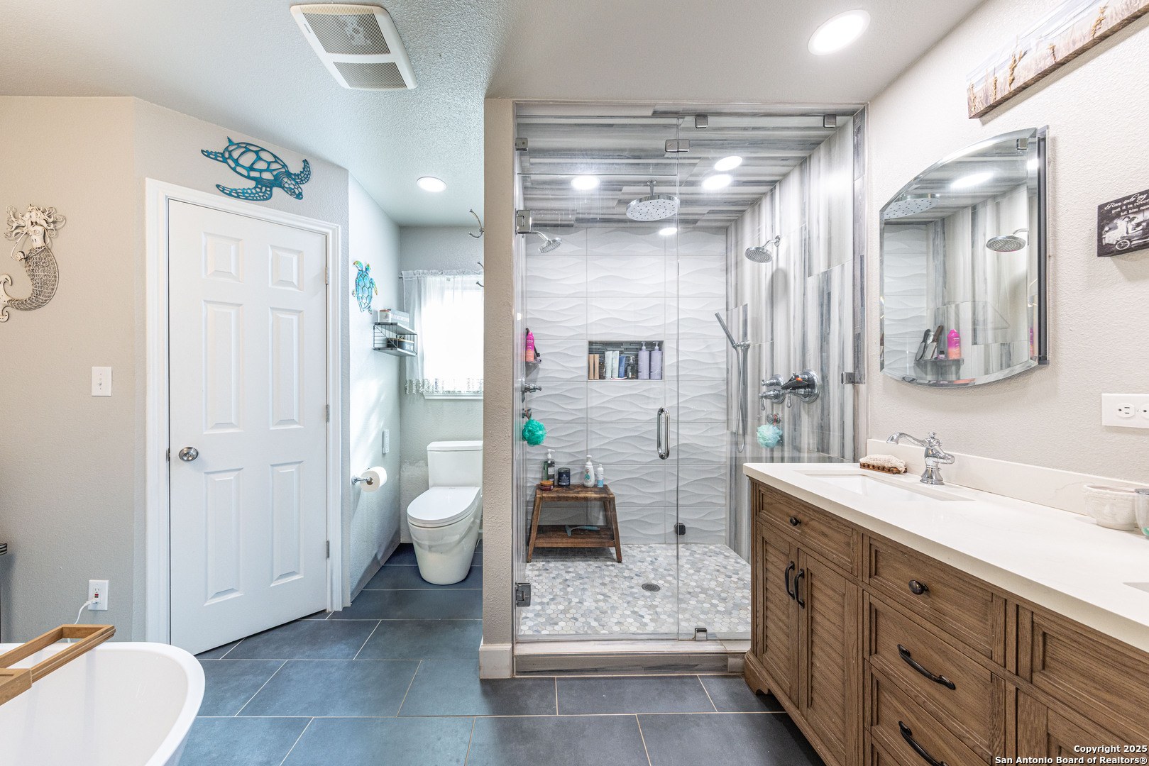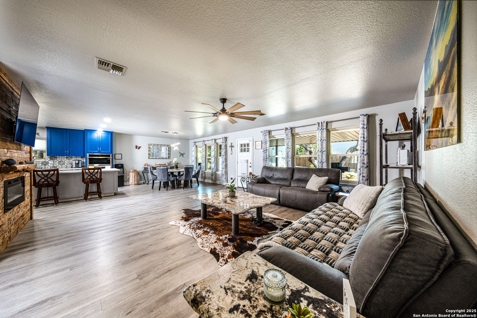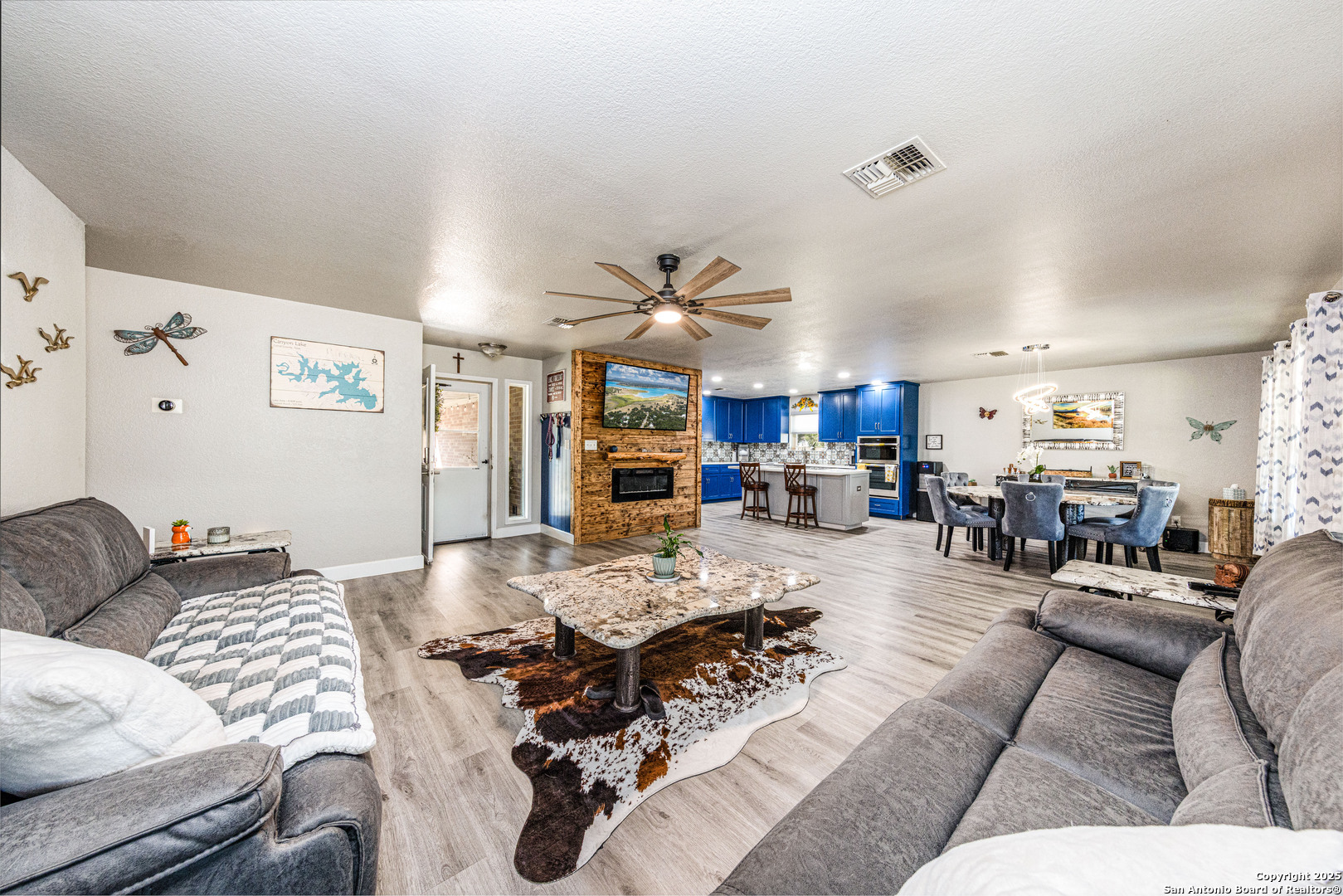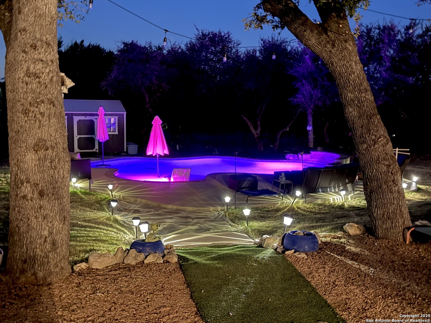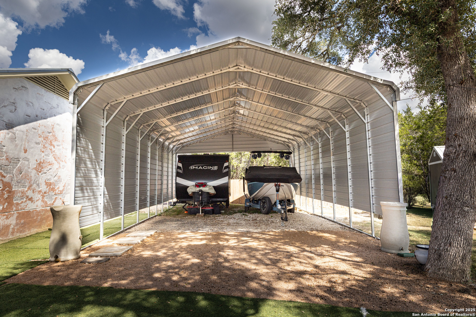 This stunning home truly has it all! Featuring 3 bedrooms and 2 bathrooms, measuring at 2020 sqft. It also boasts an office space that can easily serve as a 4th bedroom, complete with thoughtfully designed shelving. Step inside to find an inviting open concept layout that includes a high-end kitchen, equipped with modern stainless steel appliances and a spacious kitchen island featuring an induction stove. Recently remodeled just over four years ago, this home exudes contemporary charm. The master bedroom is a true retreat, offering a luxurious bathroom complete with a soaking tub and a full steam shower. All plumbing has been upgraded to Pex, and Ethernet drops are strategically placed throughout the home for added convenience. Cozy up by one of the two fireplaces, with an electric one inside and a wood-burning option on the patio. Outdoor living is elevated with two expansive covered patios, leading to a spectacular inground pool. The property also includes a large RV carport with its own near by electric meter and cleanout, perfect for accommodating your vehicles and recreational toys. Canyon Lake Boat Ramp 23 is just 5 min away. Don't overlook the three spacious storage buildings, one of which houses the private well. The entire property is completely fenced, featuring two automatic gates, and there are no HOA or ACC restrictions to contend with. All new windows and metal roof added in 2024. As an added option, the adjacent lot is also available for purchase by another owner, presenting an exciting opportunity to expand this already enchanting oasis.