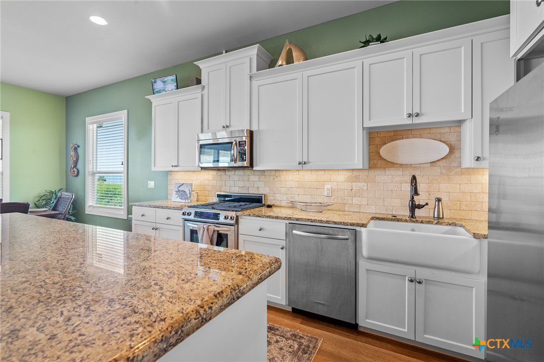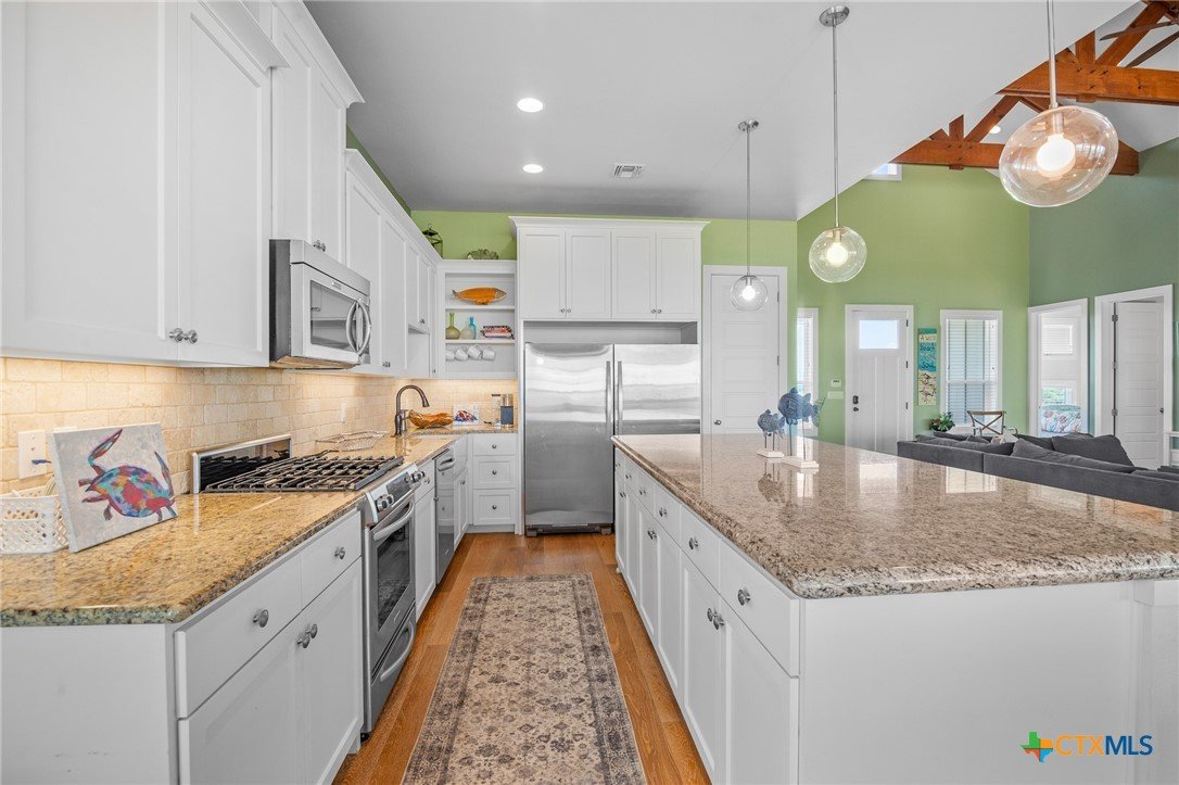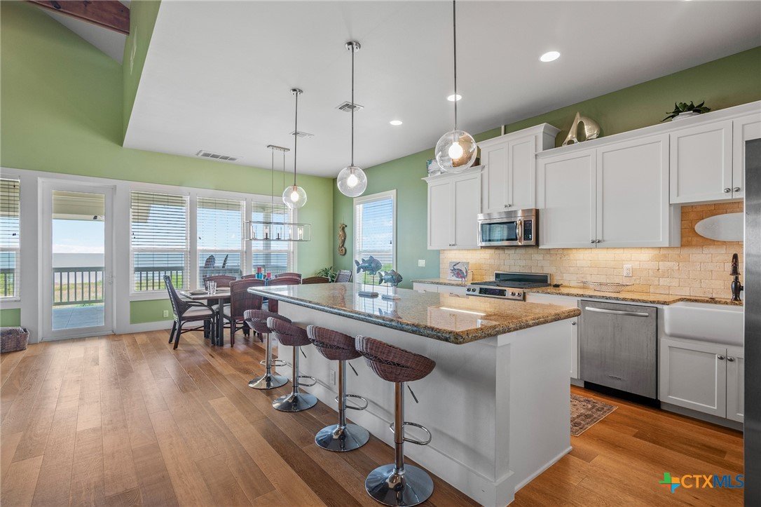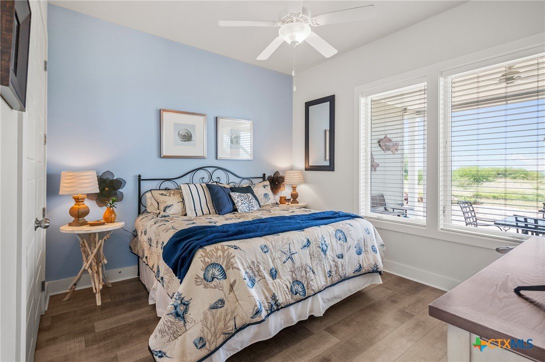 Nestled along the tranquil shores of San Antonio Bay in Seadrift, TX, this exceptional waterfront home is a blend of luxury, comfort, and natural beauty. Upon entering the second floor, you are welcomed with an open concept living area, a charming fireplace adding warmth and elegance. The expansive kitchen features abundant counter space and cabinetry, ideal for the avid cook. A guest bedroom and the primary bedroom with an ensuite. Step out to the covered patio, take a deep breath and take it all in where unobstructed, panoramic views of the sparkling bay await you. The downstairs area provides two bedrooms, a stylish guest bath featuring a walk-in shower, and a second living area complete with a wet bar, tackle closet and laundry room. Outside, the lower-level covered patio leads to a firepit, an outdoor shower, and a scenic walkway to the bay. The gated community offers access to a scenic walking path, two 400-foot piers, and a covered picnic area. A fish cleaning station and boat slips are readily available. Whether you're searching for a peaceful personal retreat or an inviting space to entertain friends and family, this waterfront fully furnished home offers the ultimate setting for coastal living. Don’t miss your opportunity to experience life by the bay.
