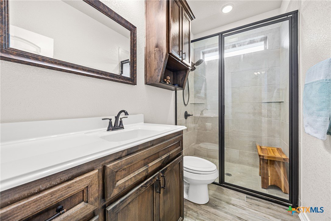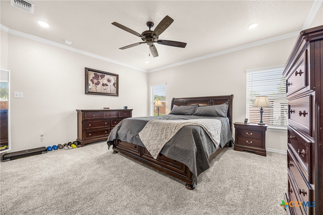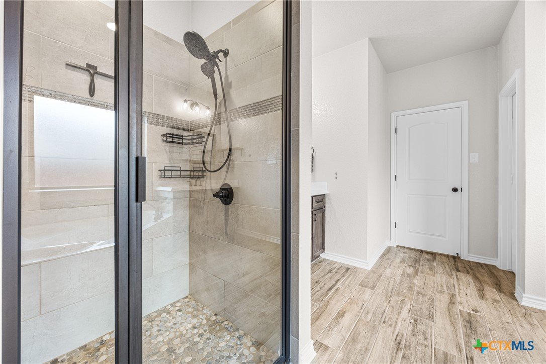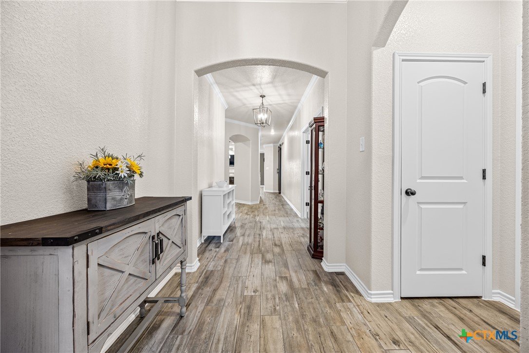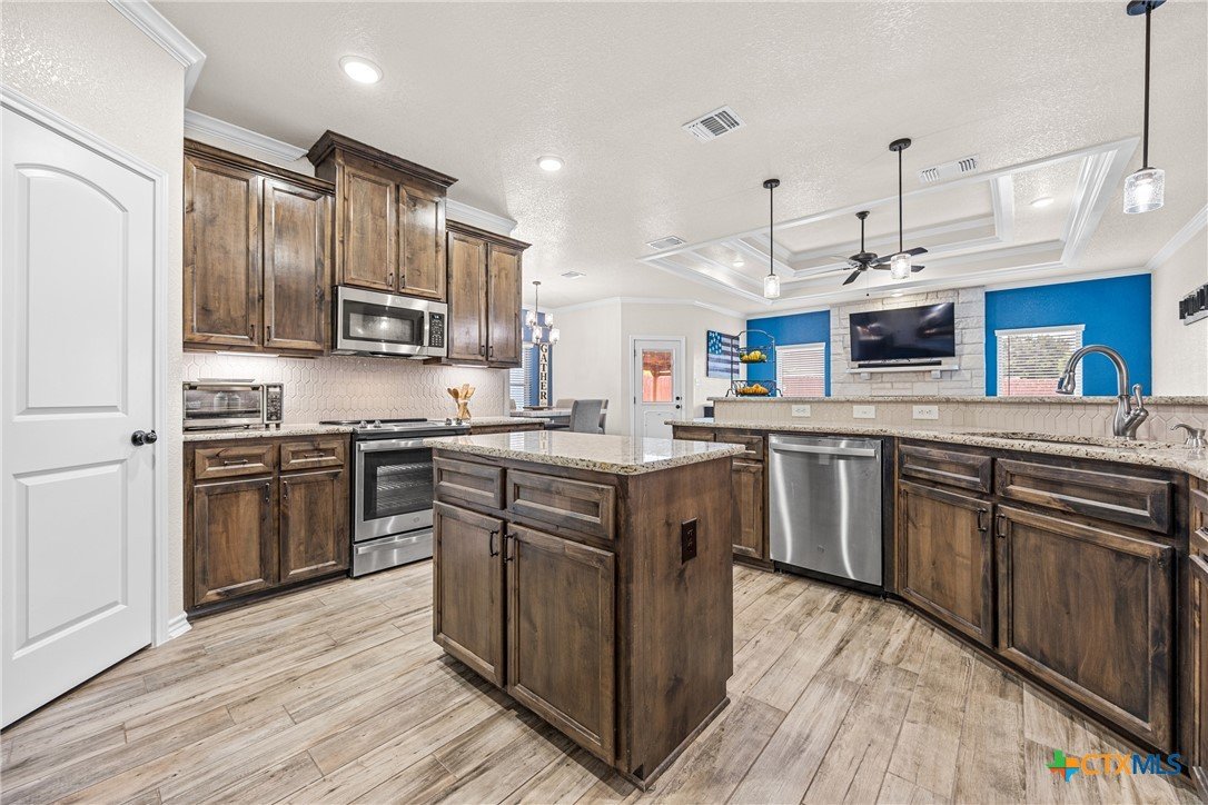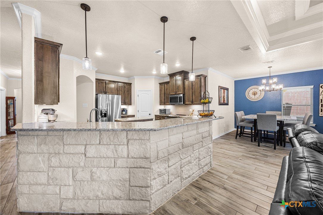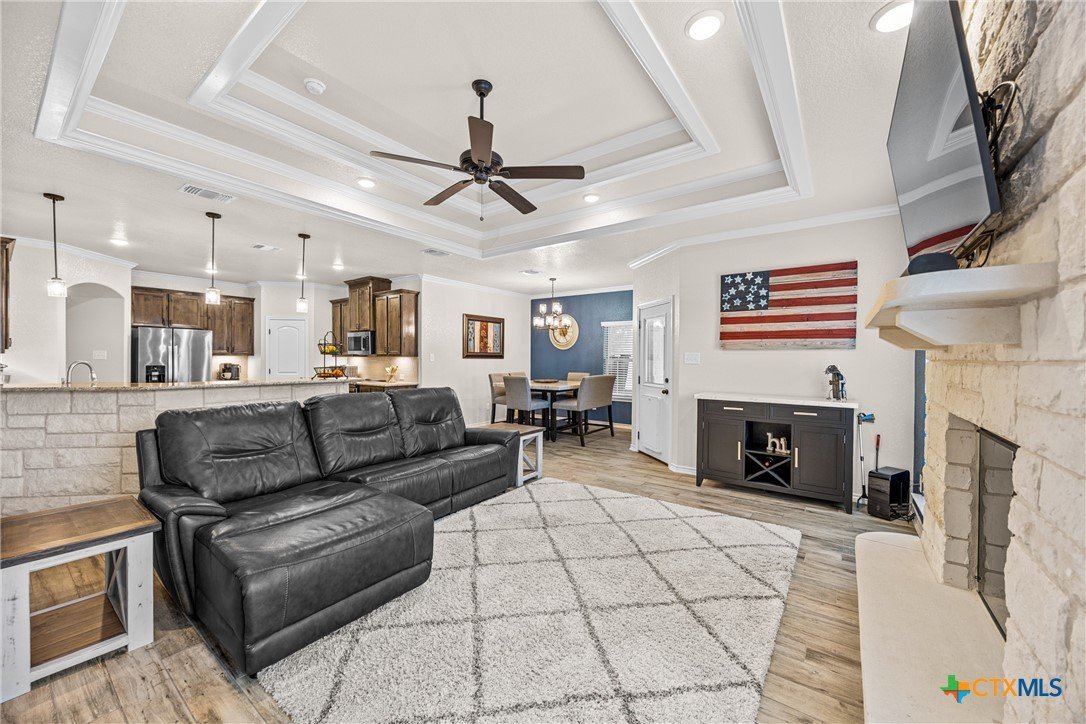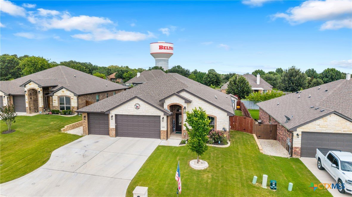 Welcome to 3424 Waggoner Dr in Belton, Texas—a stunning Carothers-built home nestled in a quiet, highly sought-after neighborhood of Dawson Ranch and zoned to top-rated Belton ISD. This thoughtfully designed residence features 4 spacious bedrooms, 3 full bathrooms, a dedicated office, and an incredible backyard retreat. From the moment you arrive, the home’s curb appeal shines with its three-car garage, detailed brick and stone exterior, and extended driveway. Inside, you’re greeted by a grand entryway with arched openings, wood-look tile flooring, and elegant crown molding throughout the main living spaces. The open-concept living room centers around a stone fireplace, tray ceiling with recessed lighting, and an effortless flow into the kitchen and dining spaces. The kitchen boasts granite countertops, rich wood cabinetry, stainless steel appliances, and a center island ideal for entertaining. Retreat to the private primary suite, with a custom barn door, and be sure to look up at the double tray ceiling with accent lighting. The Primary Bathroom has dual vanities, a soaking tub, a walk-in shower with pebble flooring, and a walk-in closet. Three additional bedrooms offer flexibility for guests or family, and the separate office with French doors provides the perfect remote work setup or flex space. Step outside and fall in love with your backyard oasis—featuring an extended concrete patio, custom pergola, and a private hot tub perfect for relaxing or entertaining year-round. The fully fenced yard offers space to play, gather, or garden with obscured view of any neighbors. Ideally located just minutes from shopping, dining, and recreation, this home is convenient to both Temple and Belton amenities, and it’s zoned for Lake Belton High School and other highly rated Belton ISD schools. This is the move-in ready home you've been waiting for—high-end finishes, functional layout, and an outdoor lifestyle you'll love.