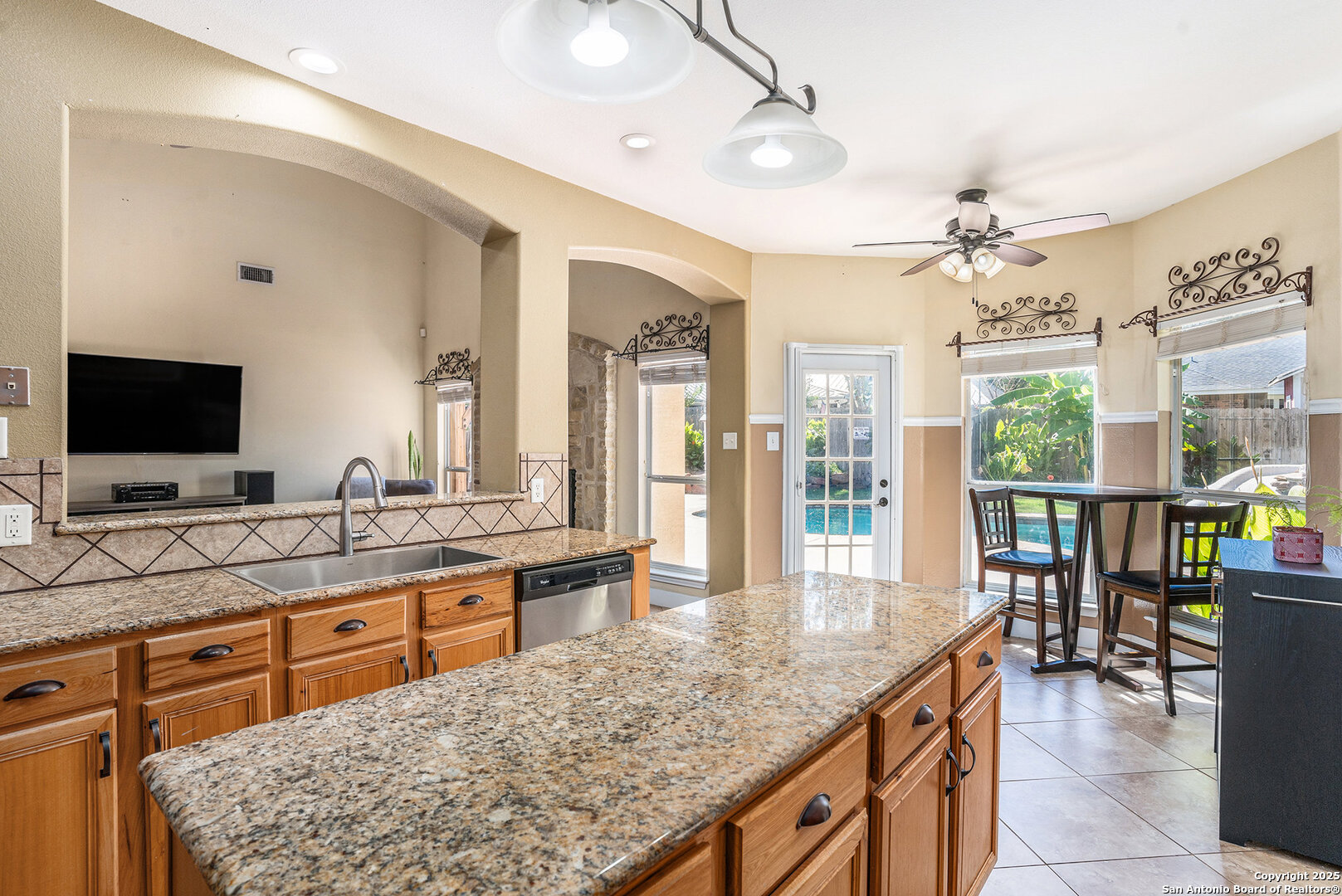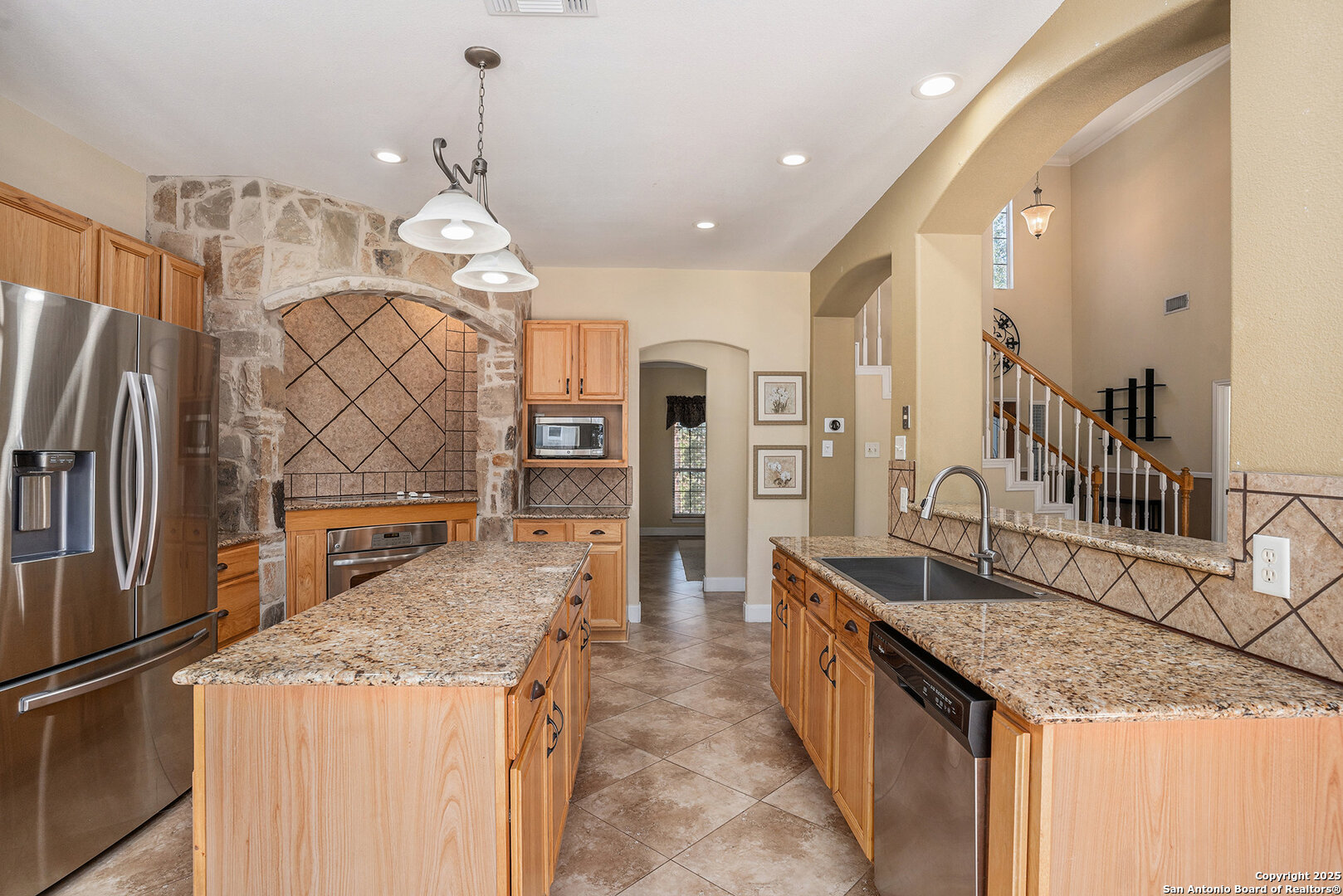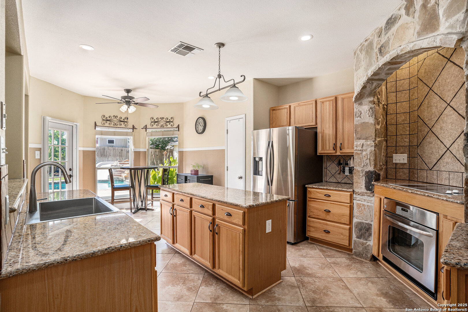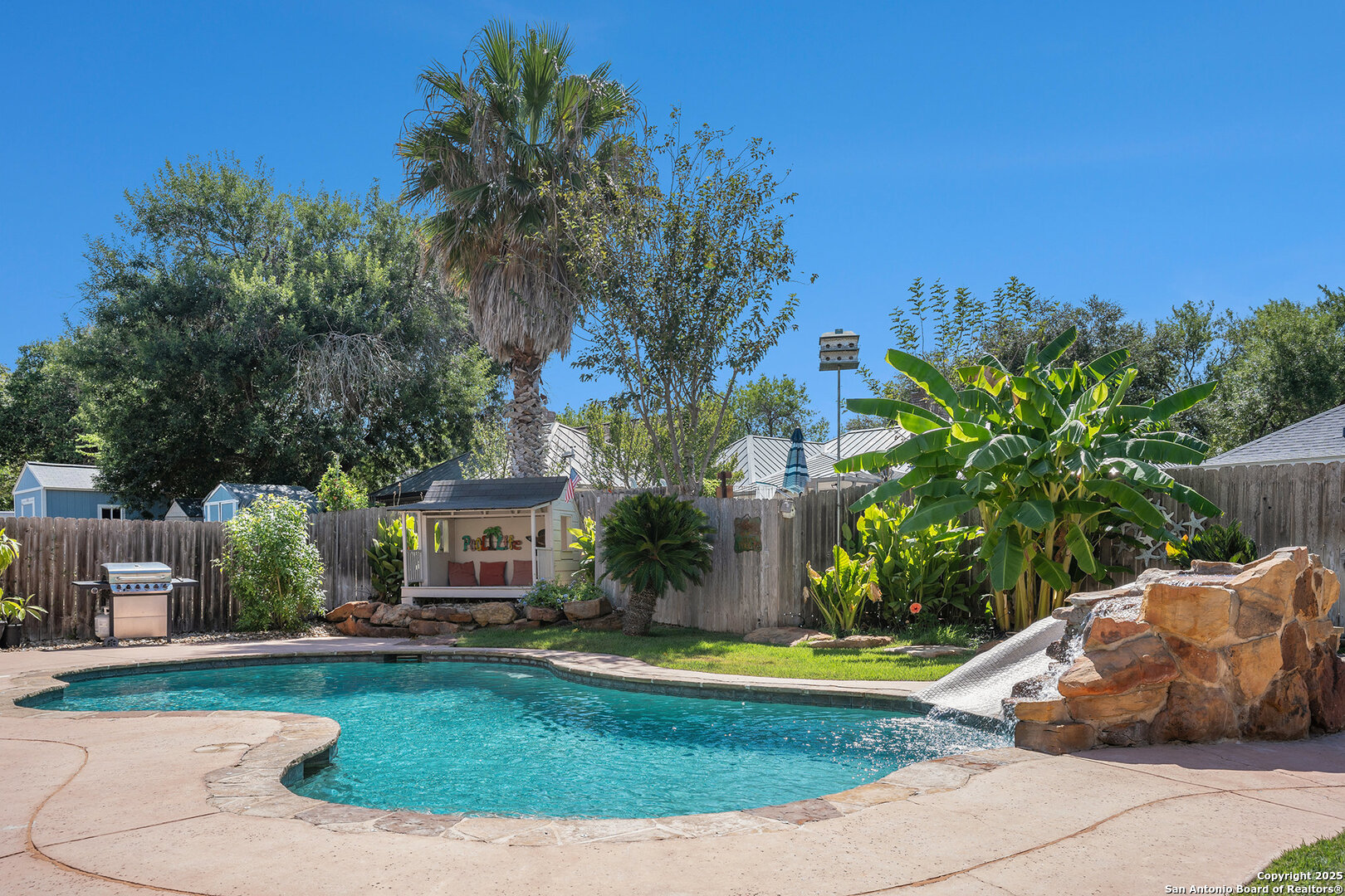 Backyard Oasis with Pool & Updates! This 5-bedroom 3 full bath home offers high ceilings, stone fireplace, and a spacious kitchen with granite counters, island, breakfast bar, stone accent wall, and an oversized refrigerator that stays with the property. All bathrooms have been beautifully updated, and the downstairs master retreat features lots of space, a spa-like bath, and a bay-window sitting area. An additional downstairs bedroom is perfect for guests, office space, or multi-generational living. Upstairs, three more bedrooms that also feature a hideaway room. Enjoy summers with a sparkling pool, slide, playhouse, palms, and detached garage. Additional upgrades include newer HVAC systems and hot water heaters, new kitchen sink, and new irrigation system/timer. Schedule your tour today!