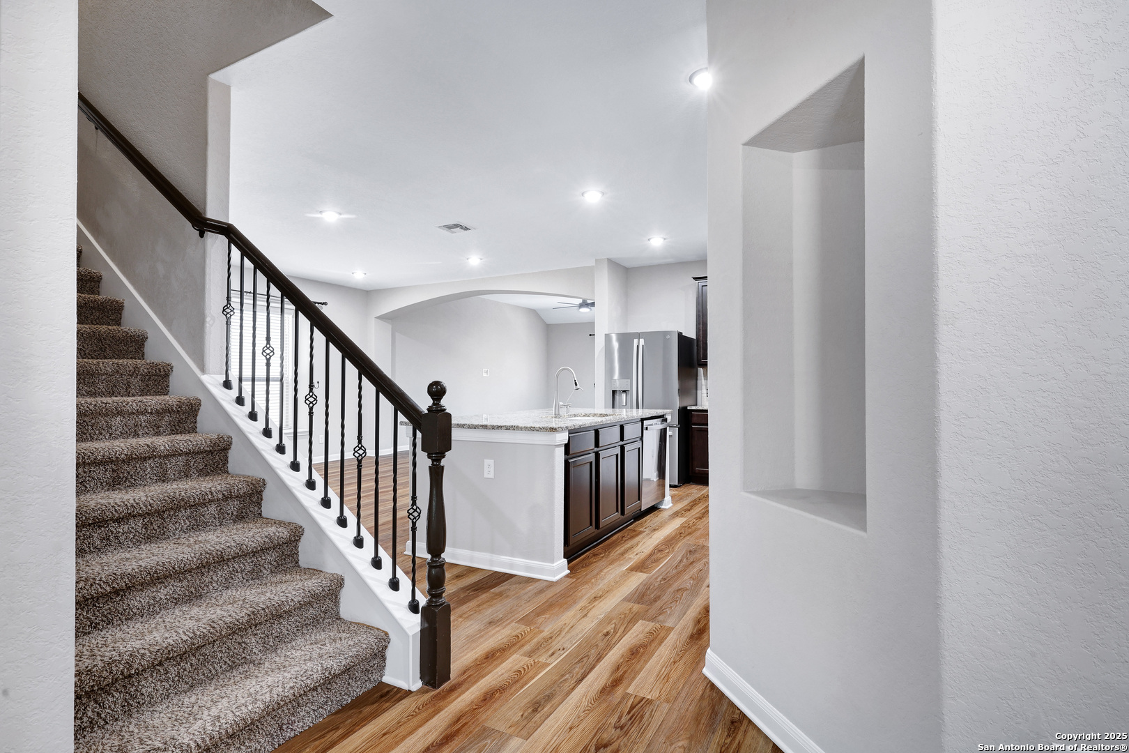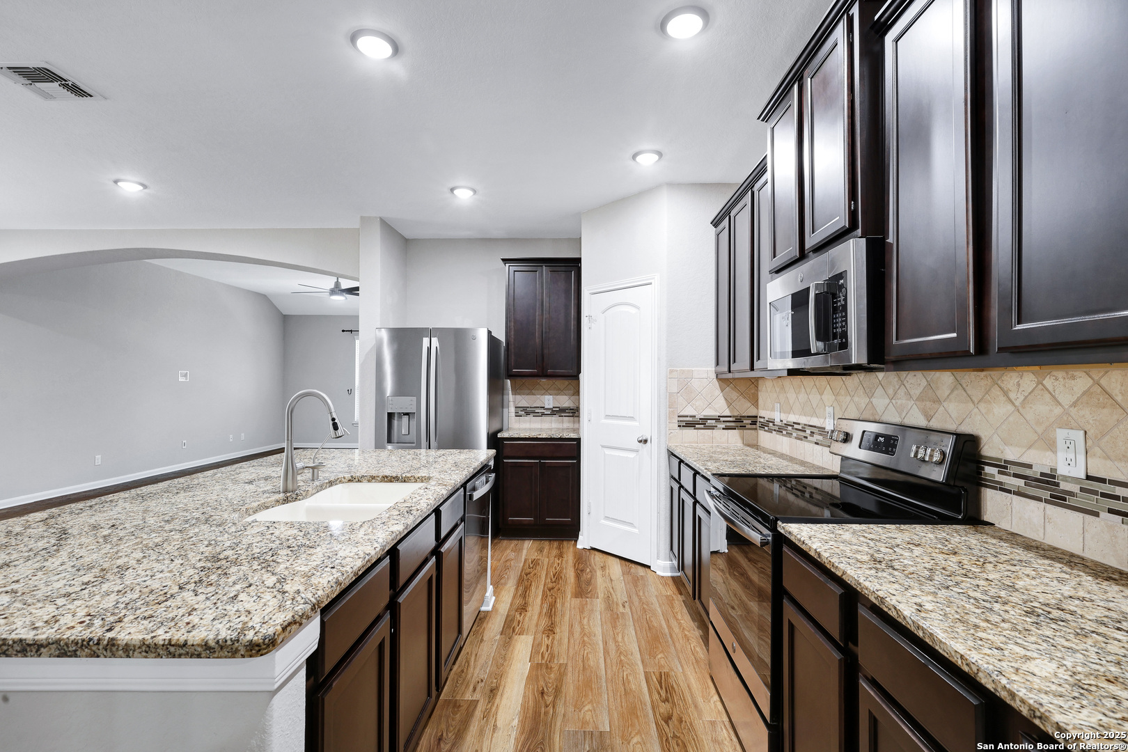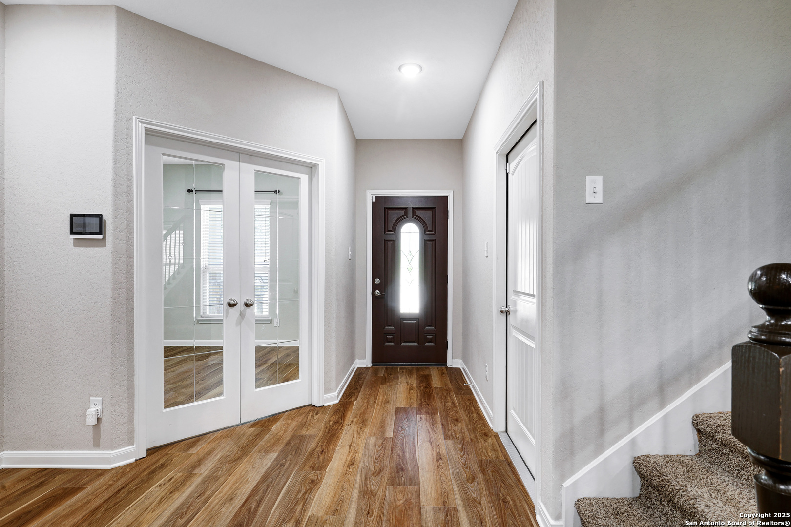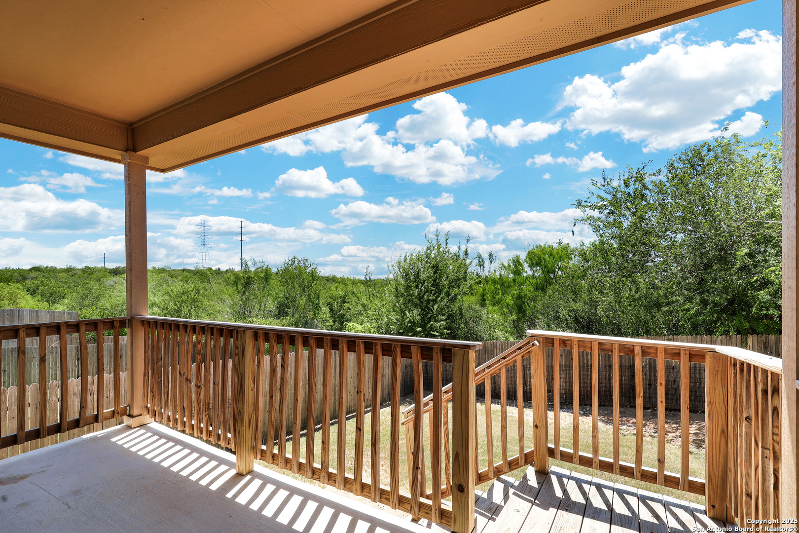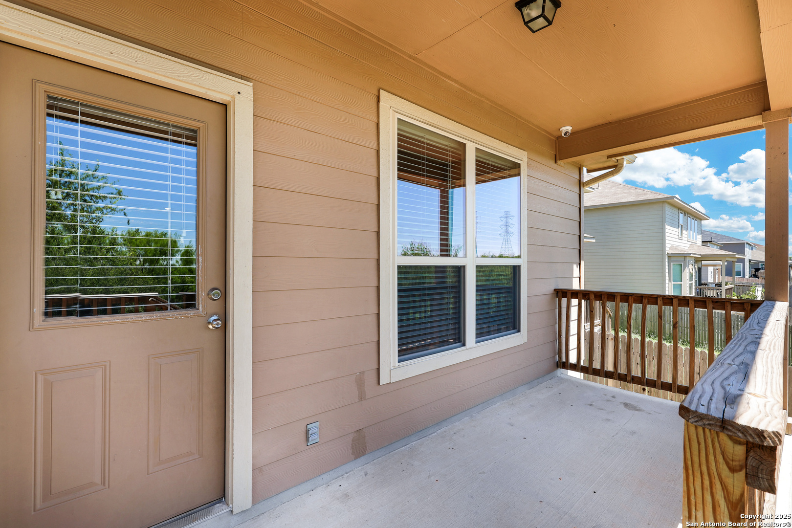 Located in the desirable Champions Manor subdivision, this impressive two-story home offers both style and comfort. The striking stucco and stone exterior is accented by mature landscaping, creating exceptional curb appeal. Inside, an open-concept layout welcomes you with rich wood flooring throughout the main living areas, creating a warm and inviting atmosphere. The kitchen is a standout feature, complete with all major appliances-including a refrigerator-and an oversized center island that offers additional prep space and bar-style seating. A dedicated office and convenient half bath are also located on the main floor. The first-level primary suite provides tranquil backyard views with no rear neighbors thanks to the greenbelt setting. The attached en suite features a walk-in closet, double vanity, garden tub, and separate walk-in shower. Upstairs, you'll find a versatile additional living space, a second suite with a private bathroom, plus two more well-proportioned bedrooms and a guest bath. Step outside to enjoy a covered patio and the privacy of a tree-lined greenbelt view. Extras include a washer, dryer, and water softener-making for an easy and comfortable move-in experience. With quick access to Lackland AFB, this home offers a convenient location for commuting. You'll also appreciate the charm of a peaceful, countryside setting without sacrificing proximity to dining, shopping, and major roads. This home offers the perfect blend of space, convenience, and natural beauty.
