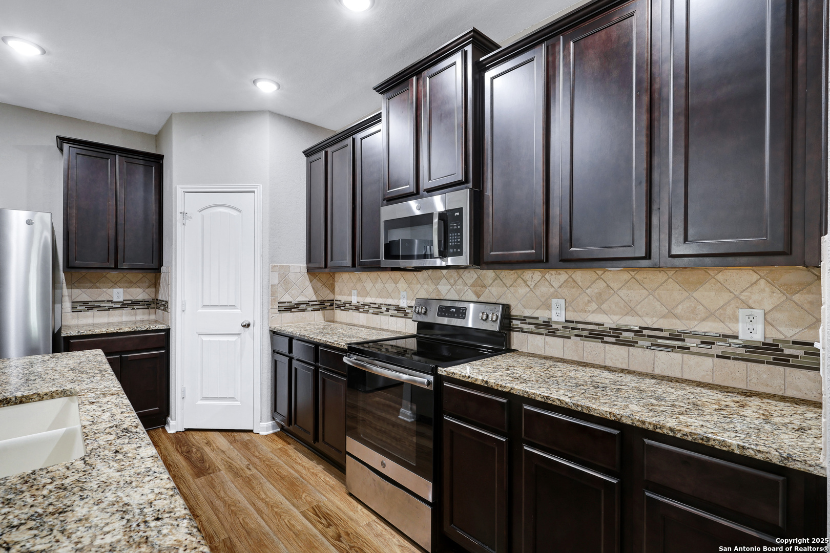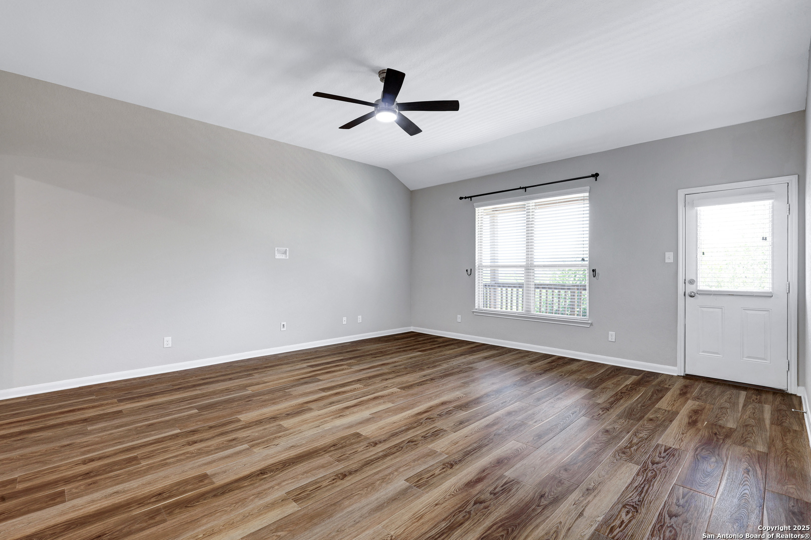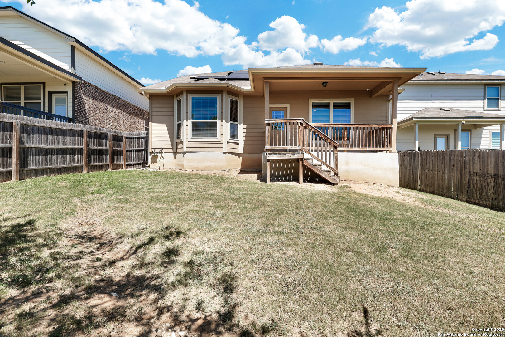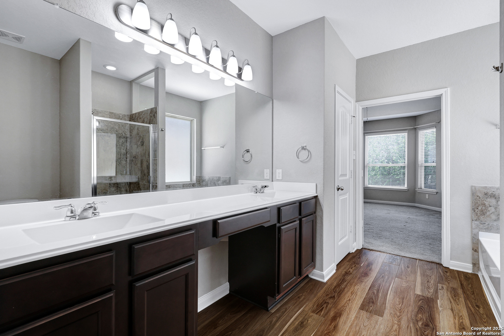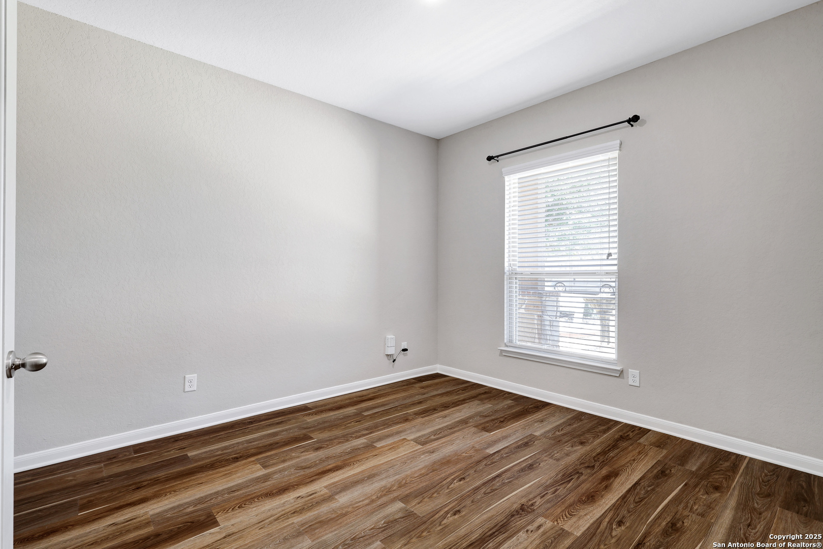 Located in the desirable Champions Manor subdivision, this impressive two-story home offers both style and comfort. The striking stucco and stone exterior is accented by mature landscaping, creating exceptional curb appeal. Inside, an open-concept layout welcomes you with rich wood flooring throughout the main living areas, creating a warm and inviting atmosphere. The kitchen is a standout feature, complete with all major appliances-including a refrigerator-and an oversized center island that offers additional prep space and bar-style seating. A dedicated office and convenient half bath are also located on the main floor. The first-level primary suite provides tranquil backyard views with no rear neighbors thanks to the greenbelt setting. The attached en suite features a walk-in closet, double vanity, garden tub, and separate walk-in shower. Upstairs, you'll find a versatile additional living space, a second suite with a private bathroom, plus two more well-proportioned bedrooms and a guest bath. Step outside to enjoy a covered patio and the privacy of a tree-lined greenbelt view. Extras include a washer, dryer, and water softener-making for an easy and comfortable move-in experience. With quick access to Lackland AFB, this home offers a convenient location for commuting. You'll also appreciate the charm of a peaceful, countryside setting without sacrificing proximity to dining, shopping, and major roads. This home offers the perfect blend of space, convenience, and natural beauty.