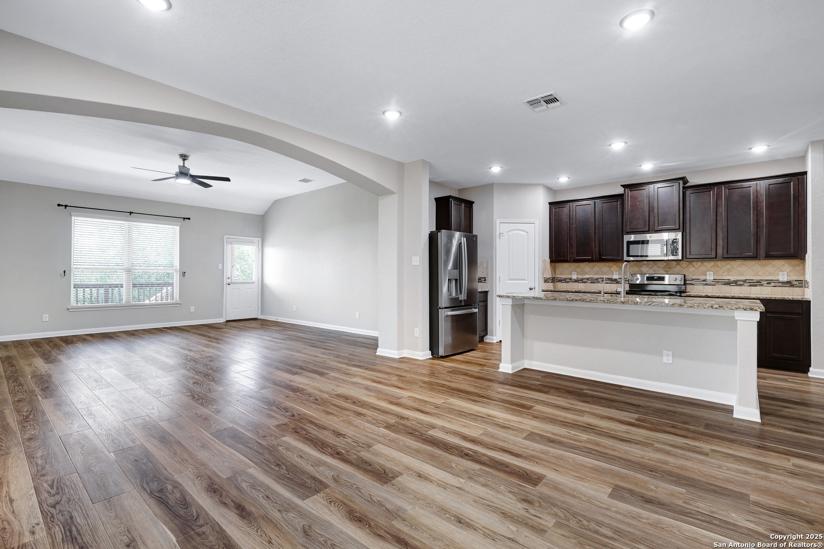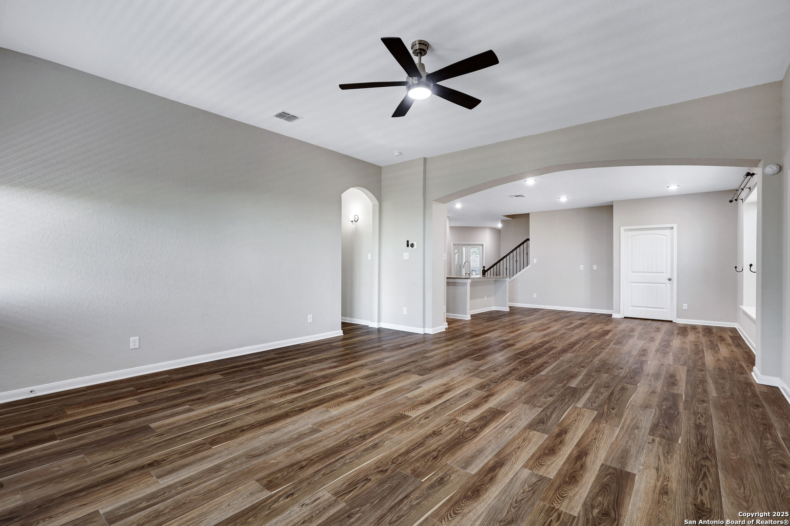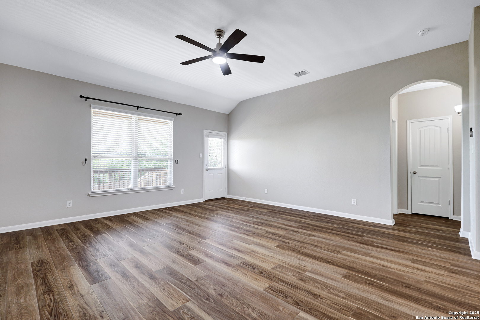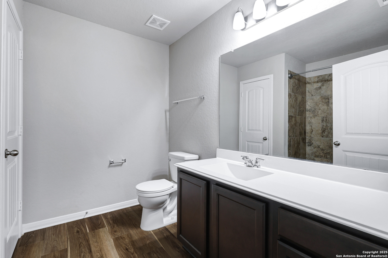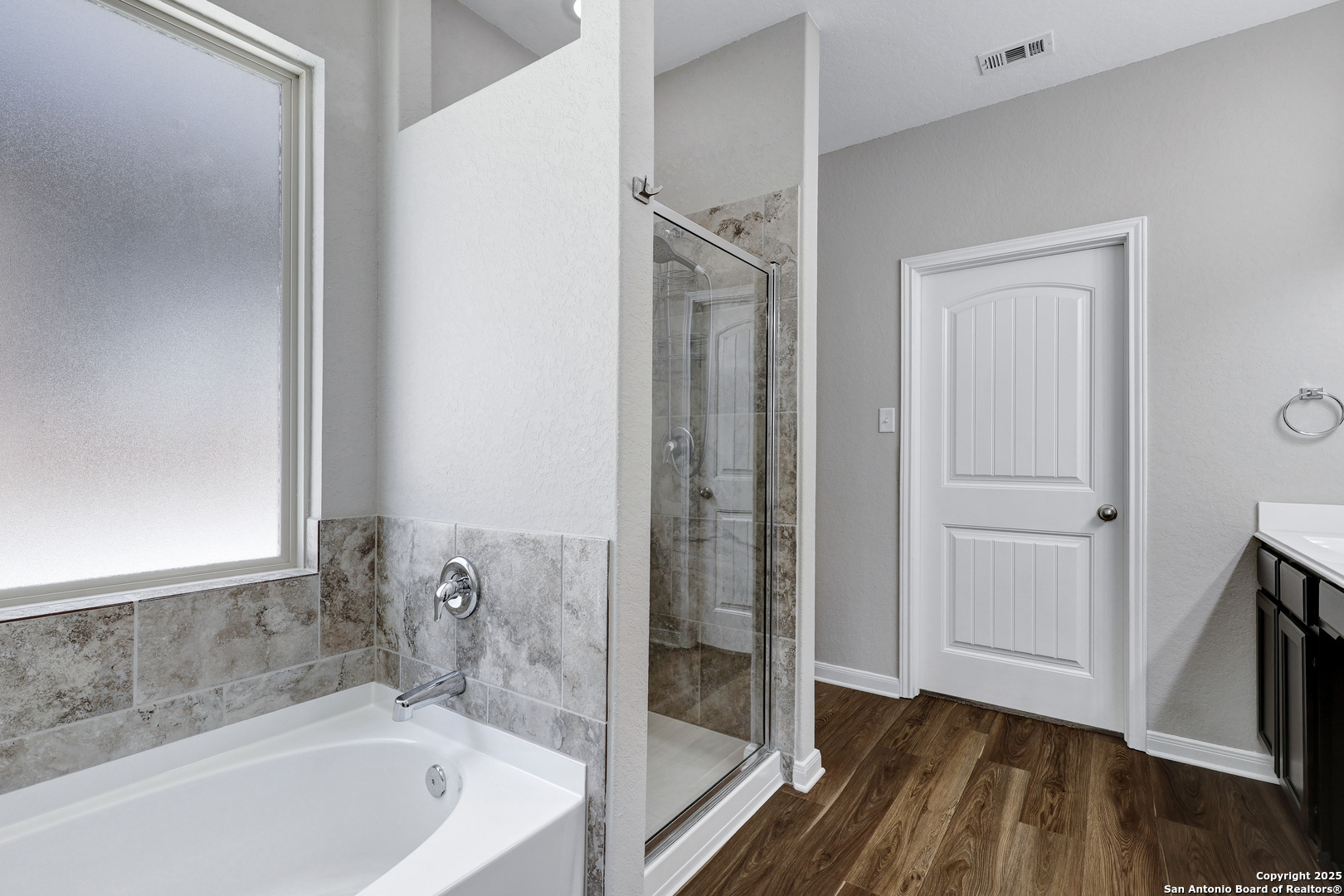Located in the desirable Champions Manor subdivision, this impressive two-story home offers both style and comfort. The striking stucco and stone exterior is accented by mature landscaping, creating exceptional curb appeal. Inside, an open-concept layout welcomes you with rich wood flooring throughout the main living areas, creating a warm and inviting atmosphere. The kitchen is a standout feature, complete with all major appliances-including a refrigerator-and an oversized center island that offers additional prep space and bar-style seating. A dedicated office and convenient half bath are also located on the main floor. The first-level primary suite provides tranquil backyard views with no rear neighbors thanks to the greenbelt setting. The attached en suite features a walk-in closet, double vanity, garden tub, and separate walk-in shower. Upstairs, you'll find a versatile additional living space, a second suite with a private bathroom, plus two more well-proportioned bedrooms and a guest bath. Step outside to enjoy a covered patio and the privacy of a tree-lined greenbelt view. Extras include a washer, dryer, and water softener-making for an easy and comfortable move-in experience. With quick access to Lackland AFB, this home offers a convenient location for commuting. You'll also appreciate the charm of a peaceful, countryside setting without sacrificing proximity to dining, shopping, and major roads. This home offers the perfect blend of space, convenience, and natural beauty.