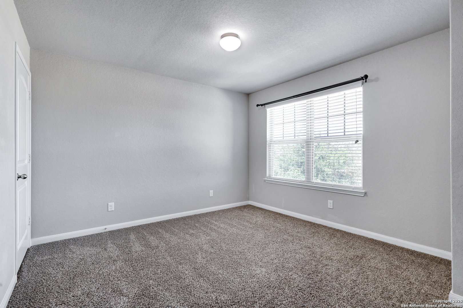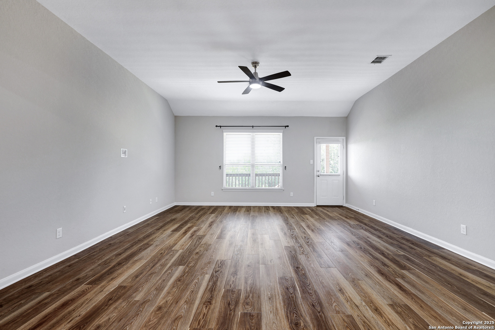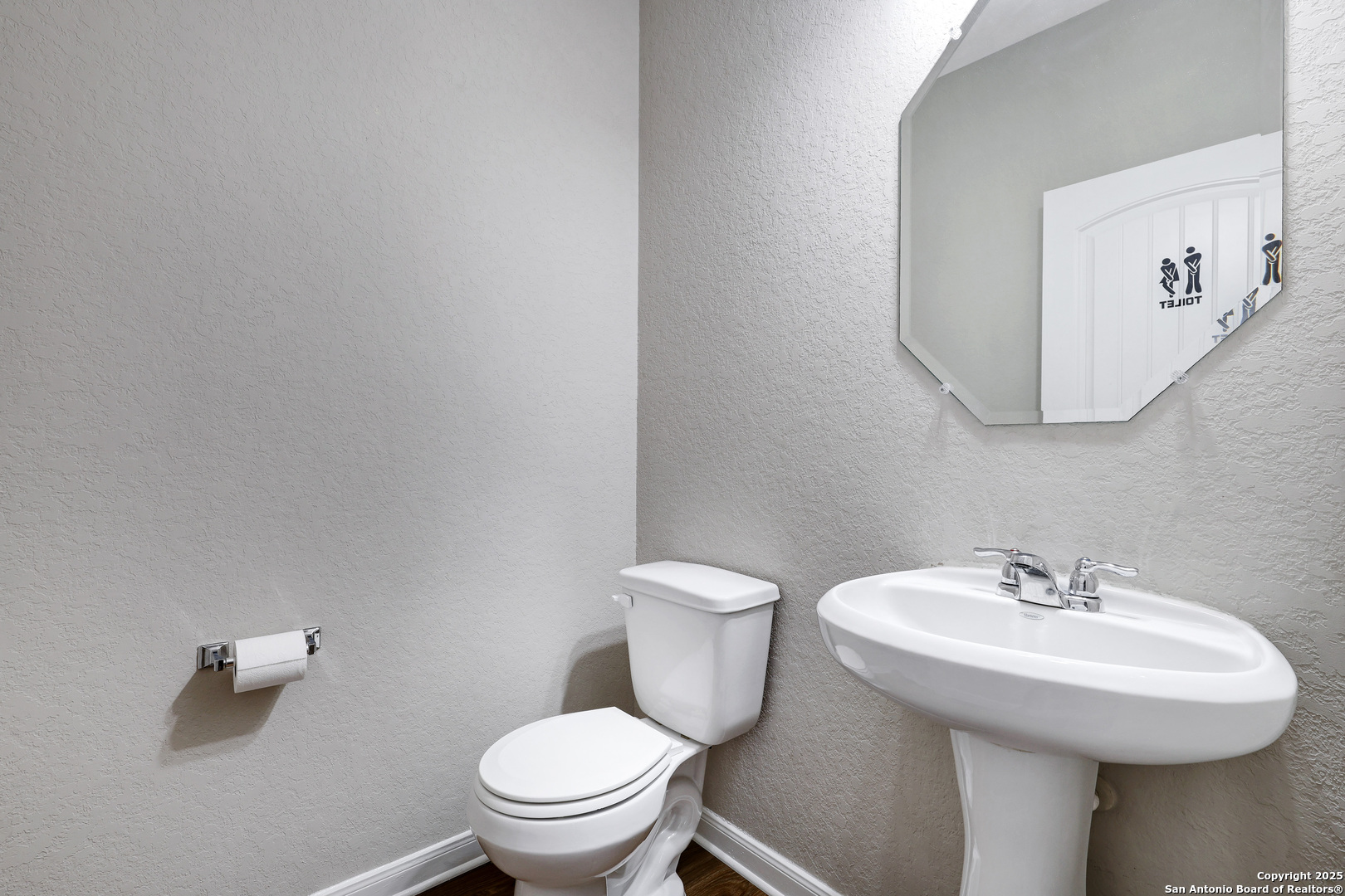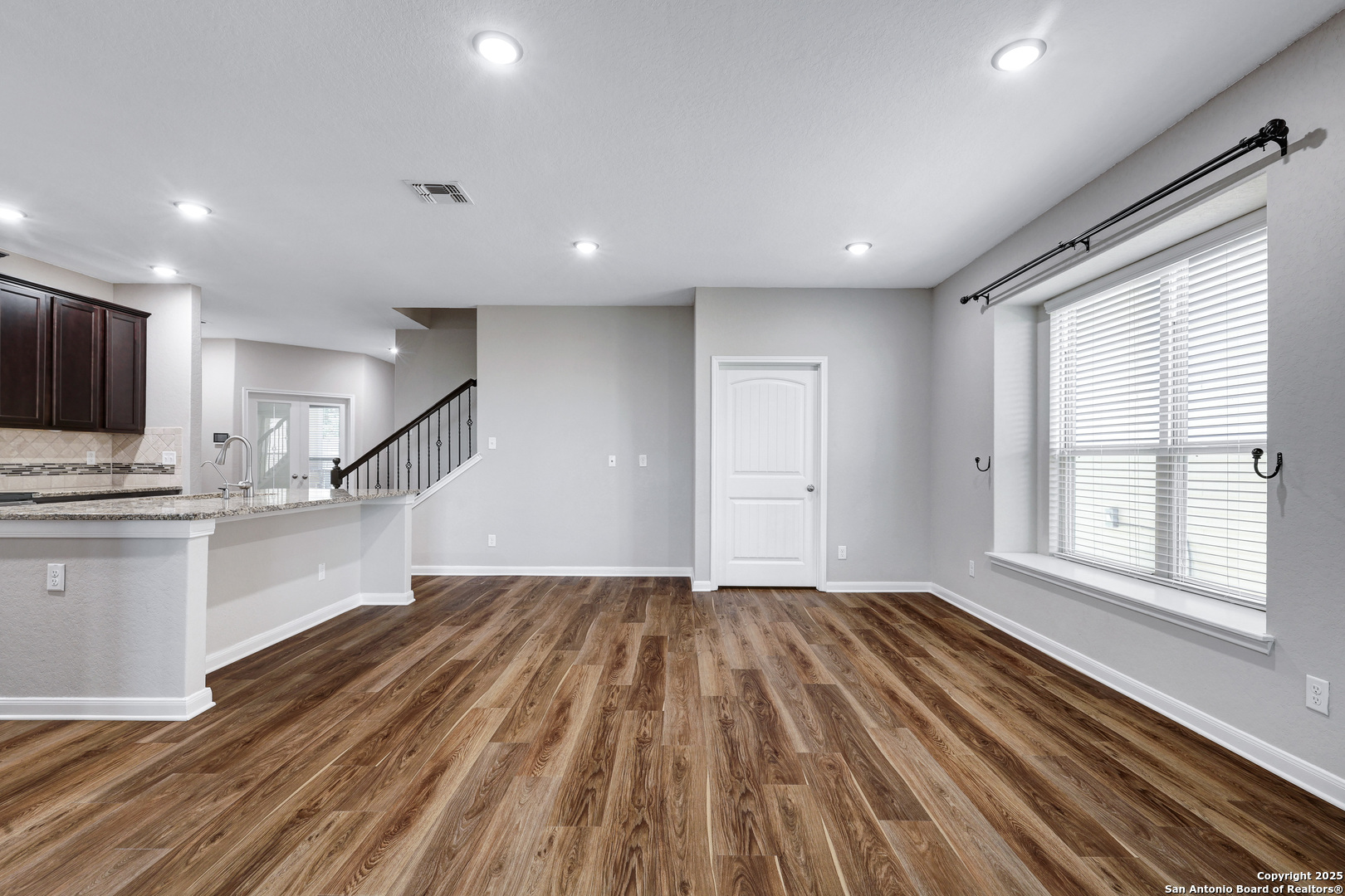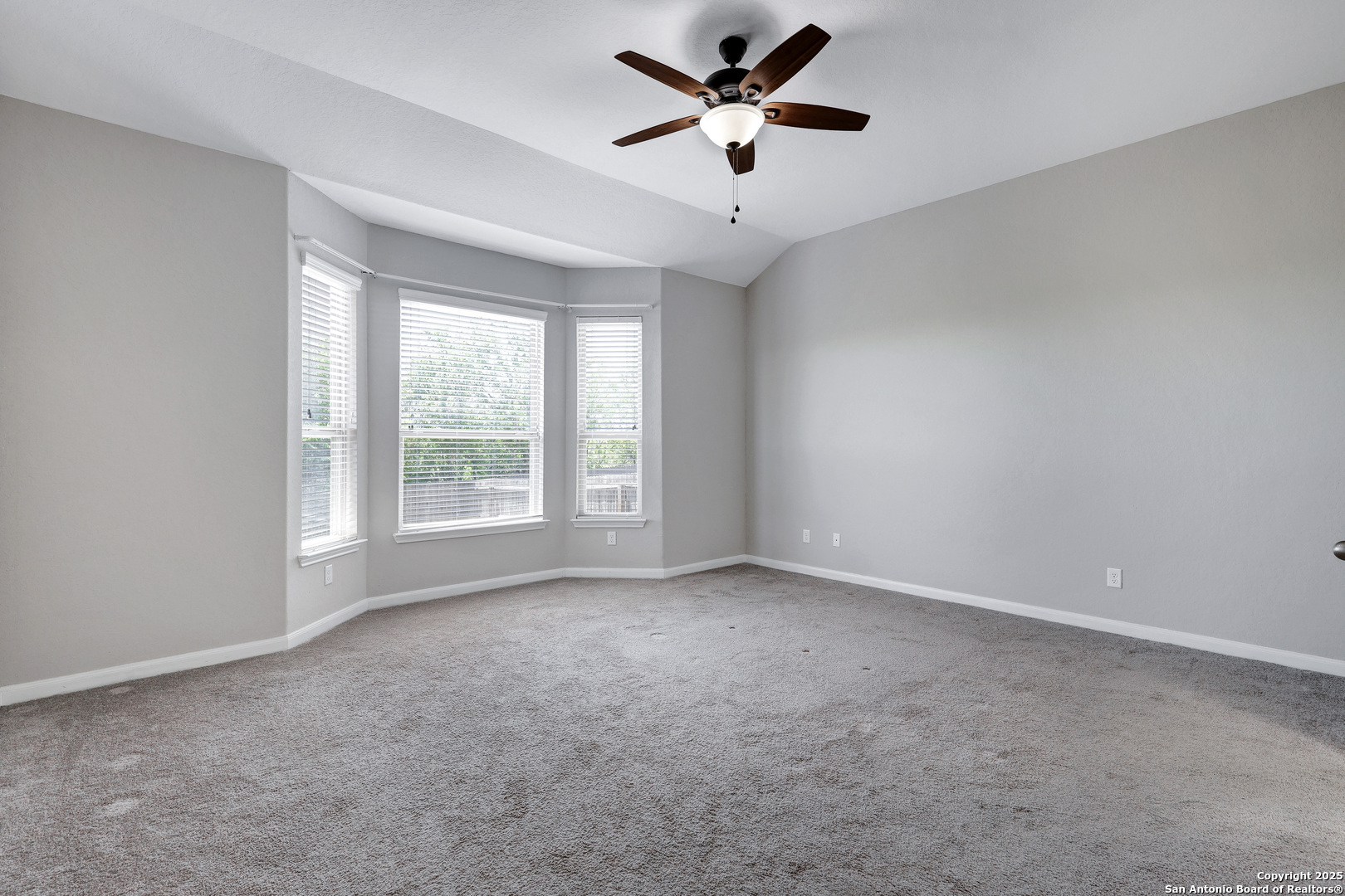 Located in the desirable Champions Manor subdivision, this impressive two-story home offers both style and comfort. The striking stucco and stone exterior is accented by mature landscaping, creating exceptional curb appeal. Inside, an open-concept layout welcomes you with rich wood flooring throughout the main living areas, creating a warm and inviting atmosphere. The kitchen is a standout feature, complete with all major appliances-including a refrigerator-and an oversized center island that offers additional prep space and bar-style seating. A dedicated office and convenient half bath are also located on the main floor. The first-level primary suite provides tranquil backyard views with no rear neighbors thanks to the greenbelt setting. The attached en suite features a walk-in closet, double vanity, garden tub, and separate walk-in shower. Upstairs, you'll find a versatile additional living space, a second suite with a private bathroom, plus two more well-proportioned bedrooms and a guest bath. Step outside to enjoy a covered patio and the privacy of a tree-lined greenbelt view. Extras include a washer, dryer, and water softener-making for an easy and comfortable move-in experience. With quick access to Lackland AFB, this home offers a convenient location for commuting. You'll also appreciate the charm of a peaceful, countryside setting without sacrificing proximity to dining, shopping, and major roads. This home offers the perfect blend of space, convenience, and natural beauty.