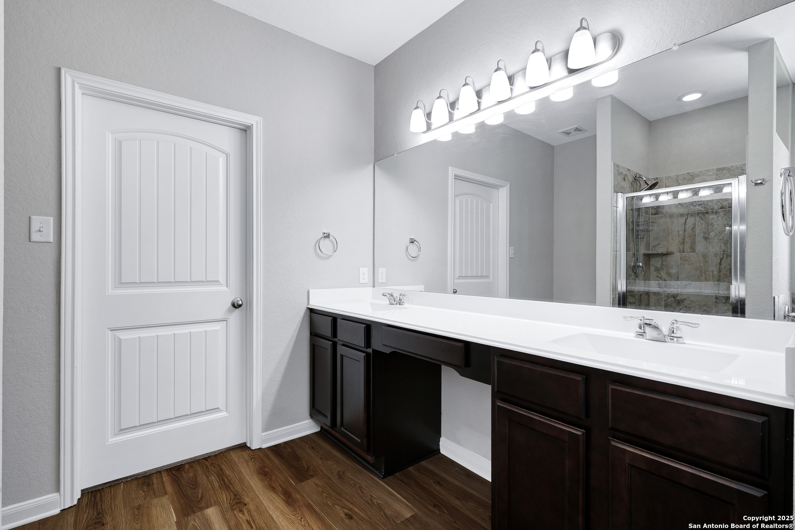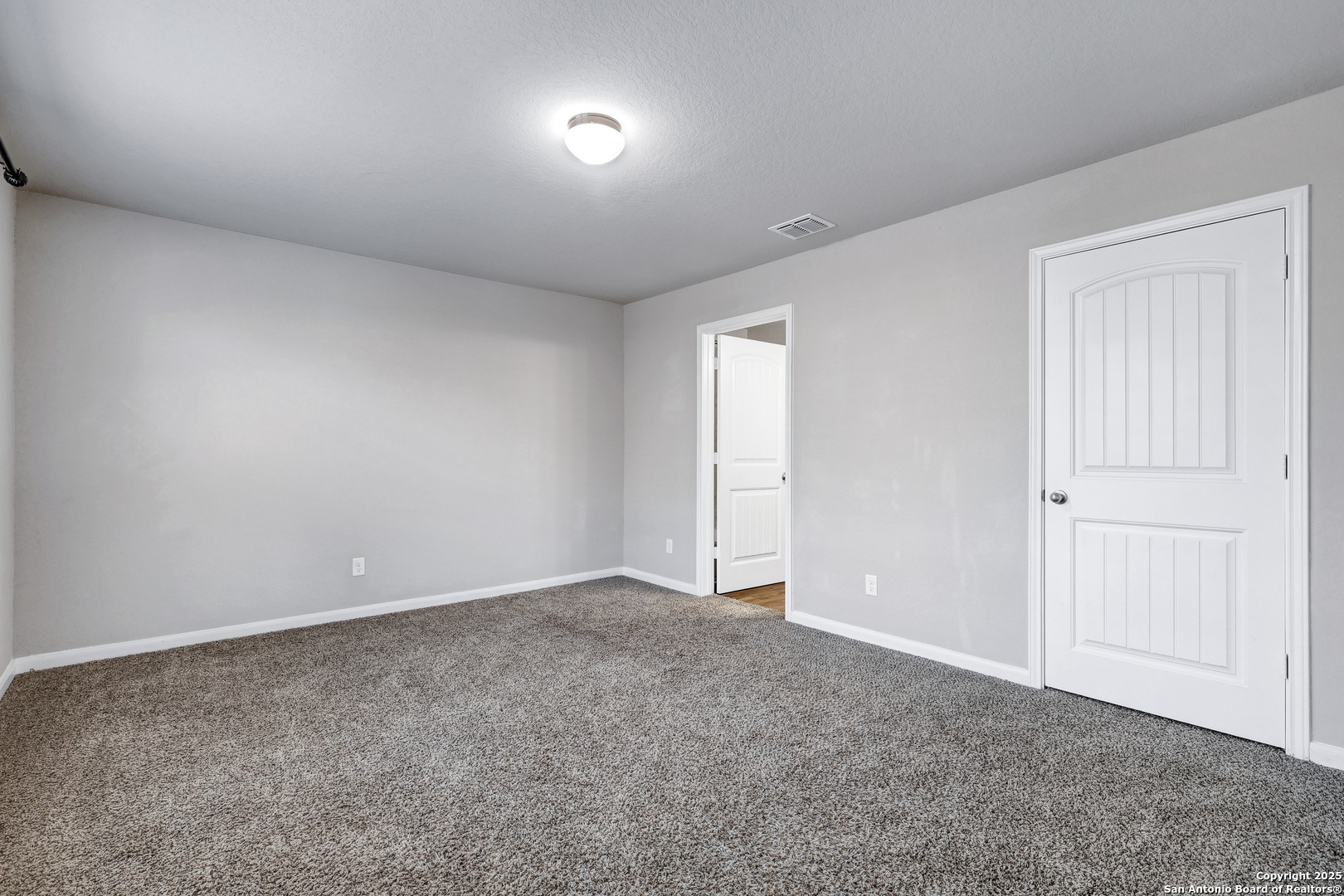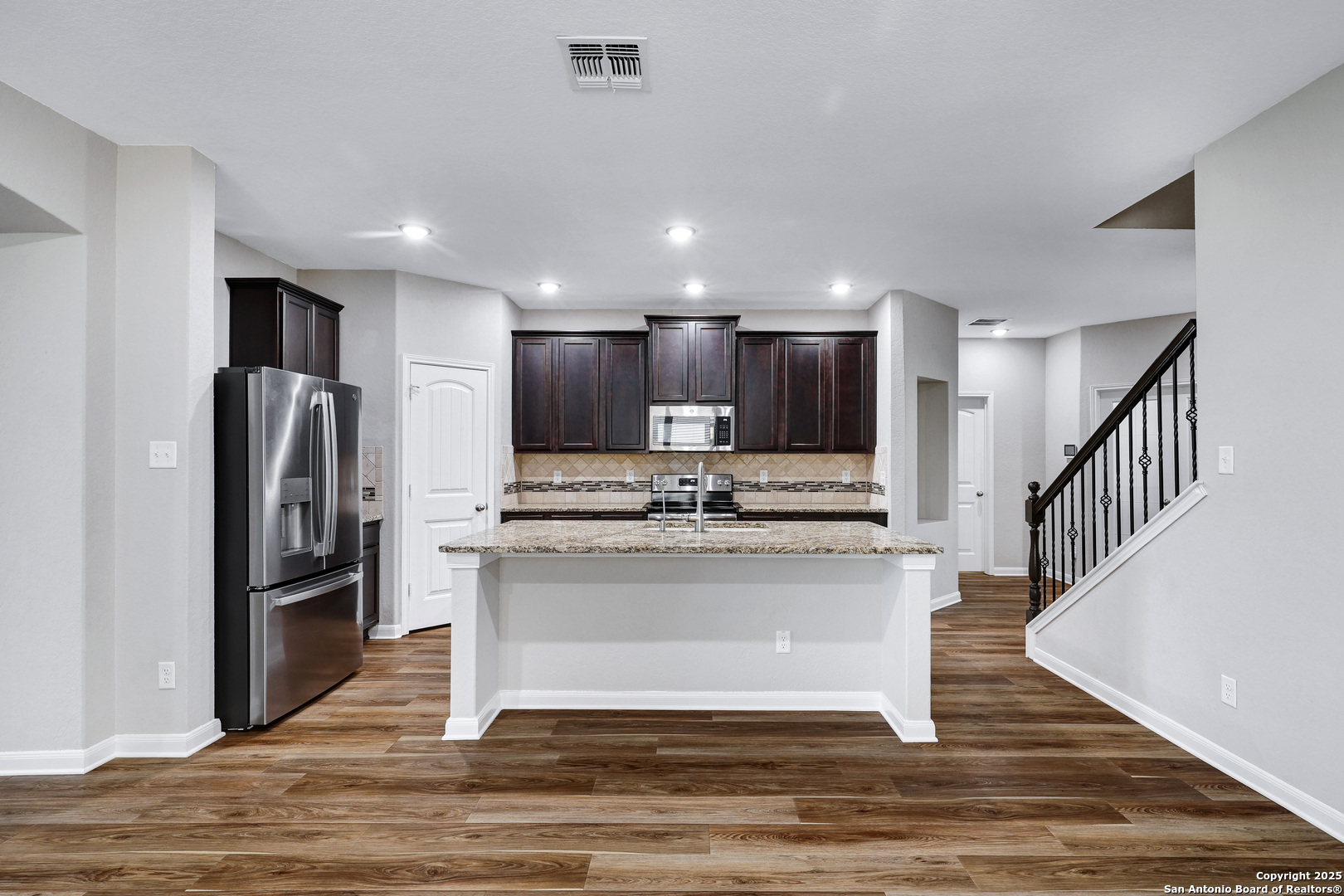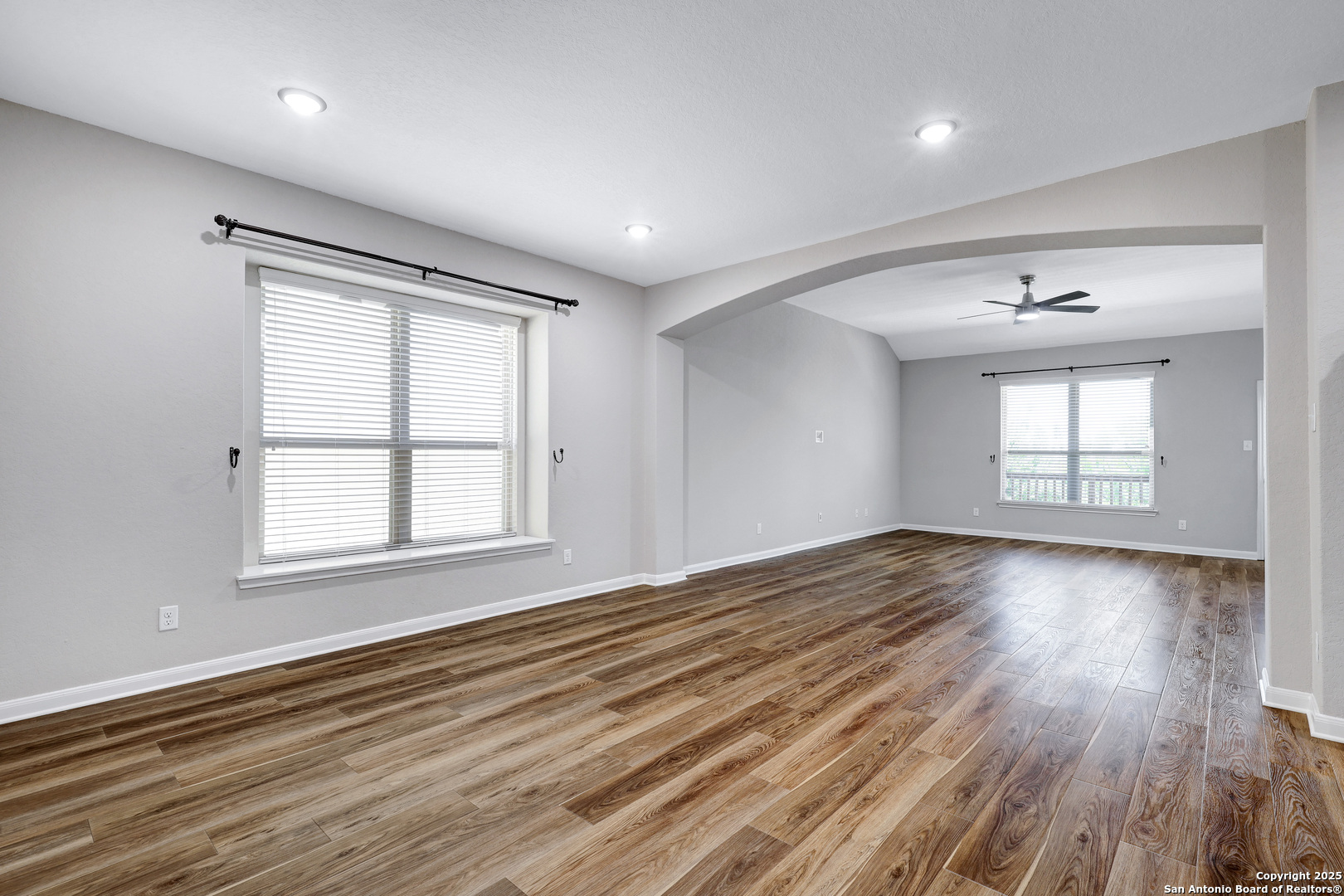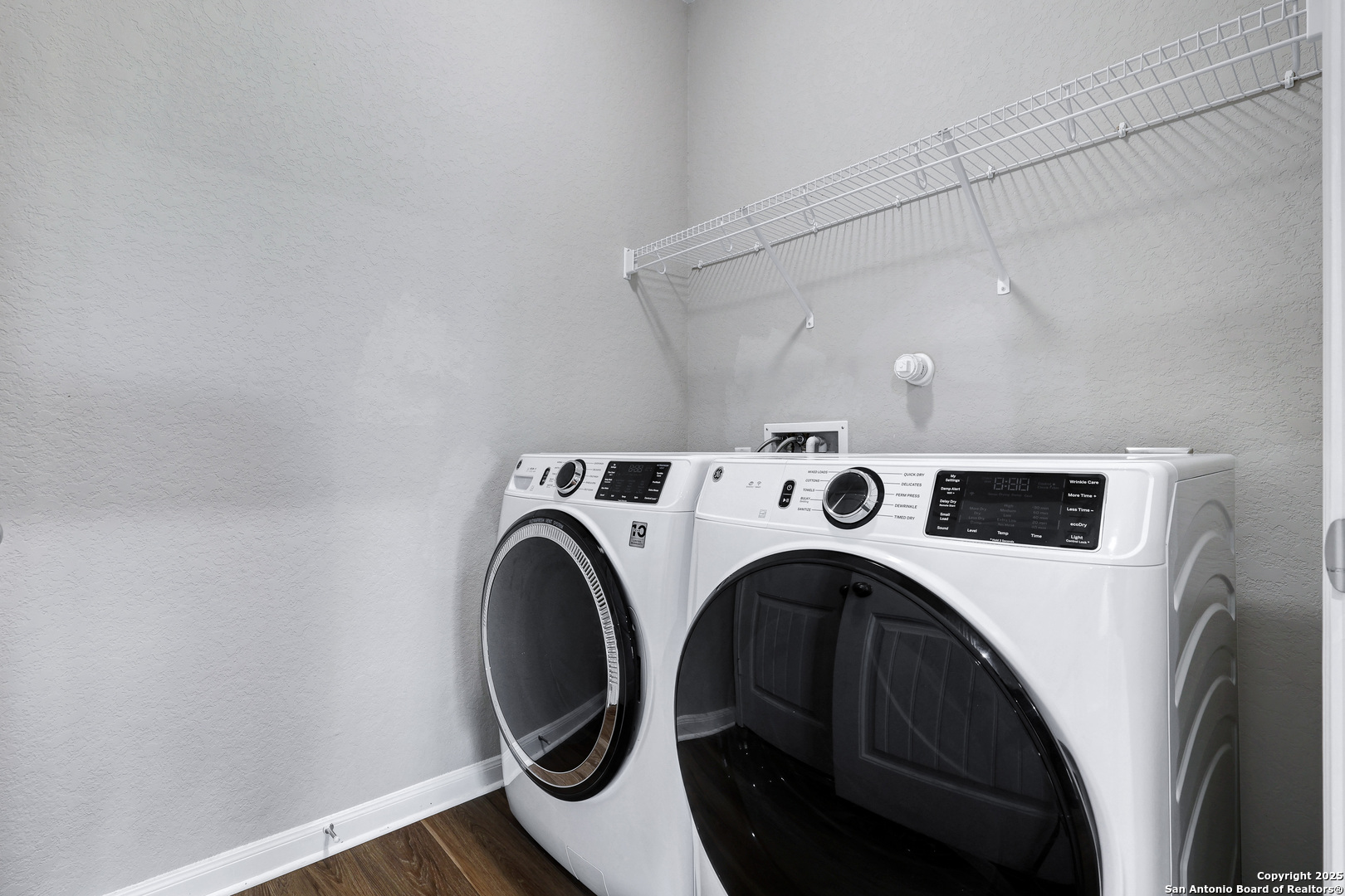 Located in the desirable Champions Manor subdivision, this impressive two-story home offers both style and comfort. The striking stucco and stone exterior is accented by mature landscaping, creating exceptional curb appeal. Inside, an open-concept layout welcomes you with rich wood flooring throughout the main living areas, creating a warm and inviting atmosphere. The kitchen is a standout feature, complete with all major appliances-including a refrigerator-and an oversized center island that offers additional prep space and bar-style seating. A dedicated office and convenient half bath are also located on the main floor. The first-level primary suite provides tranquil backyard views with no rear neighbors thanks to the greenbelt setting. The attached en suite features a walk-in closet, double vanity, garden tub, and separate walk-in shower. Upstairs, you'll find a versatile additional living space, a second suite with a private bathroom, plus two more well-proportioned bedrooms and a guest bath. Step outside to enjoy a covered patio and the privacy of a tree-lined greenbelt view. Extras include a washer, dryer, and water softener-making for an easy and comfortable move-in experience. With quick access to Lackland AFB, this home offers a convenient location for commuting. You'll also appreciate the charm of a peaceful, countryside setting without sacrificing proximity to dining, shopping, and major roads. This home offers the perfect blend of space, convenience, and natural beauty.