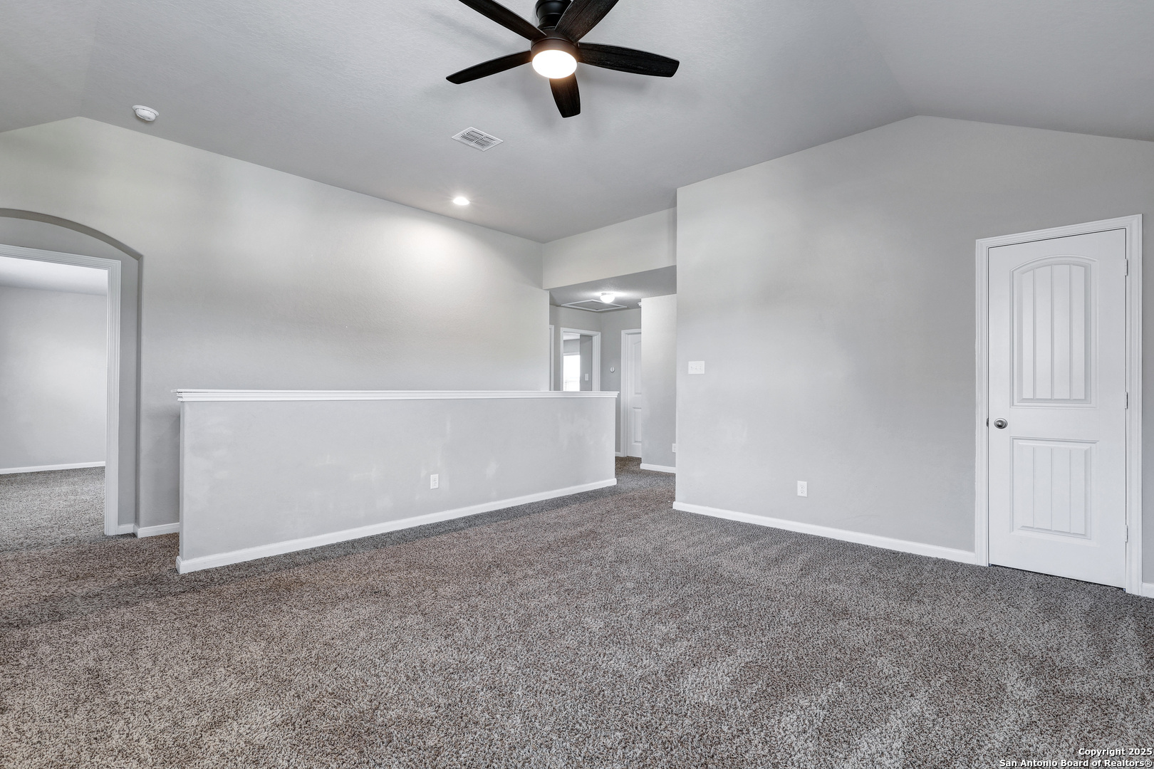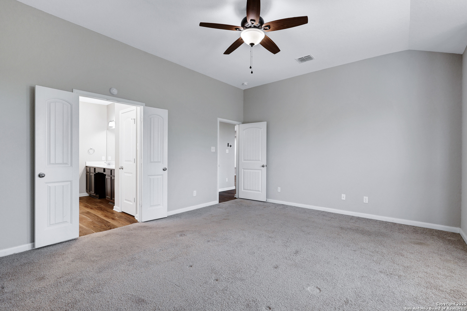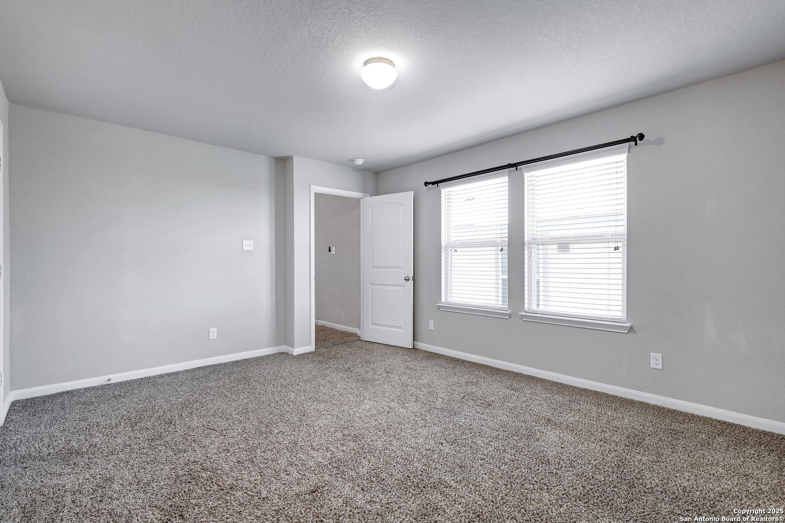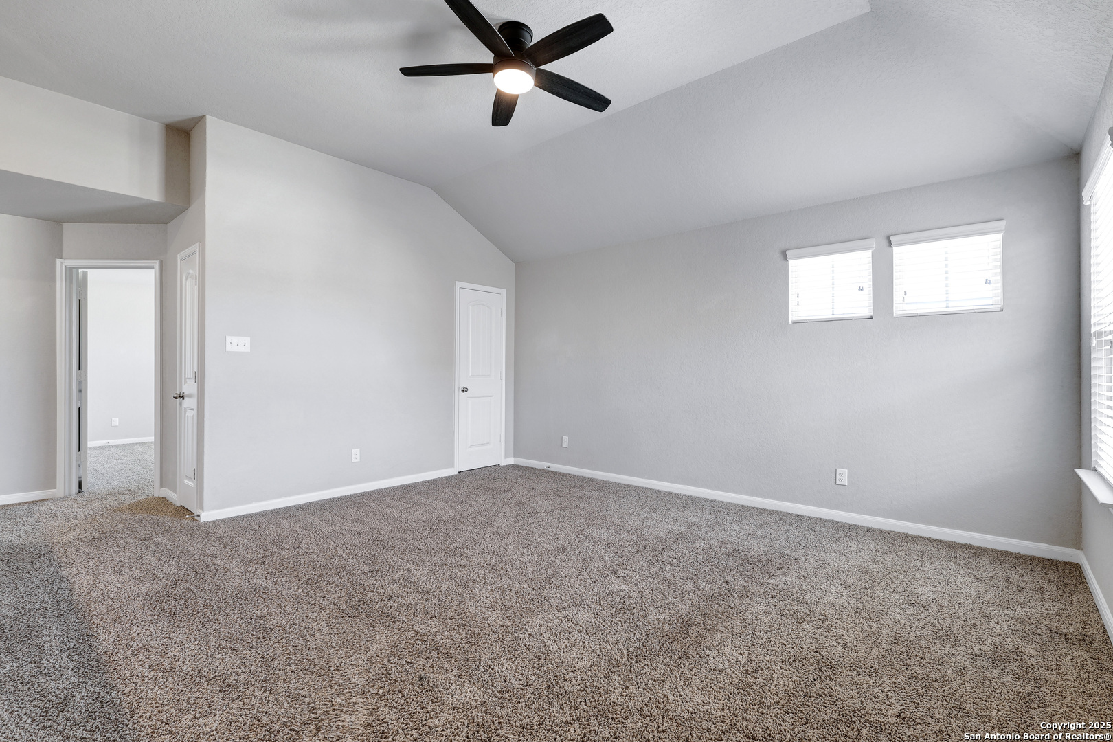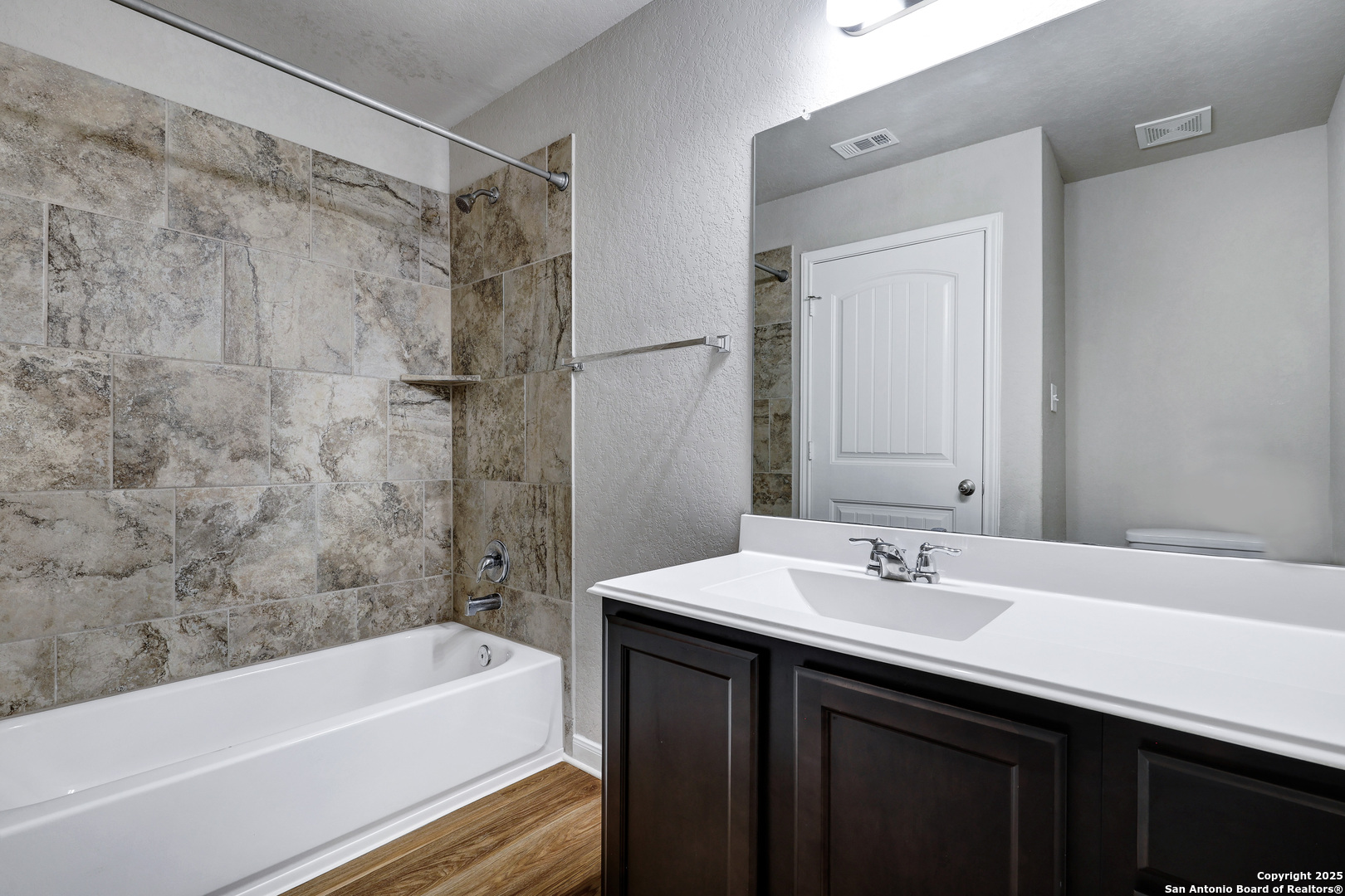 Located in the desirable Champions Manor subdivision, this impressive two-story home offers both style and comfort. The striking stucco and stone exterior is accented by mature landscaping, creating exceptional curb appeal. Inside, an open-concept layout welcomes you with rich wood flooring throughout the main living areas, creating a warm and inviting atmosphere. The kitchen is a standout feature, complete with all major appliances-including a refrigerator-and an oversized center island that offers additional prep space and bar-style seating. A dedicated office and convenient half bath are also located on the main floor. The first-level primary suite provides tranquil backyard views with no rear neighbors thanks to the greenbelt setting. The attached en suite features a walk-in closet, double vanity, garden tub, and separate walk-in shower. Upstairs, you'll find a versatile additional living space, a second suite with a private bathroom, plus two more well-proportioned bedrooms and a guest bath. Step outside to enjoy a covered patio and the privacy of a tree-lined greenbelt view. Extras include a washer, dryer, and water softener-making for an easy and comfortable move-in experience. With quick access to Lackland AFB, this home offers a convenient location for commuting. You'll also appreciate the charm of a peaceful, countryside setting without sacrificing proximity to dining, shopping, and major roads. This home offers the perfect blend of space, convenience, and natural beauty.
